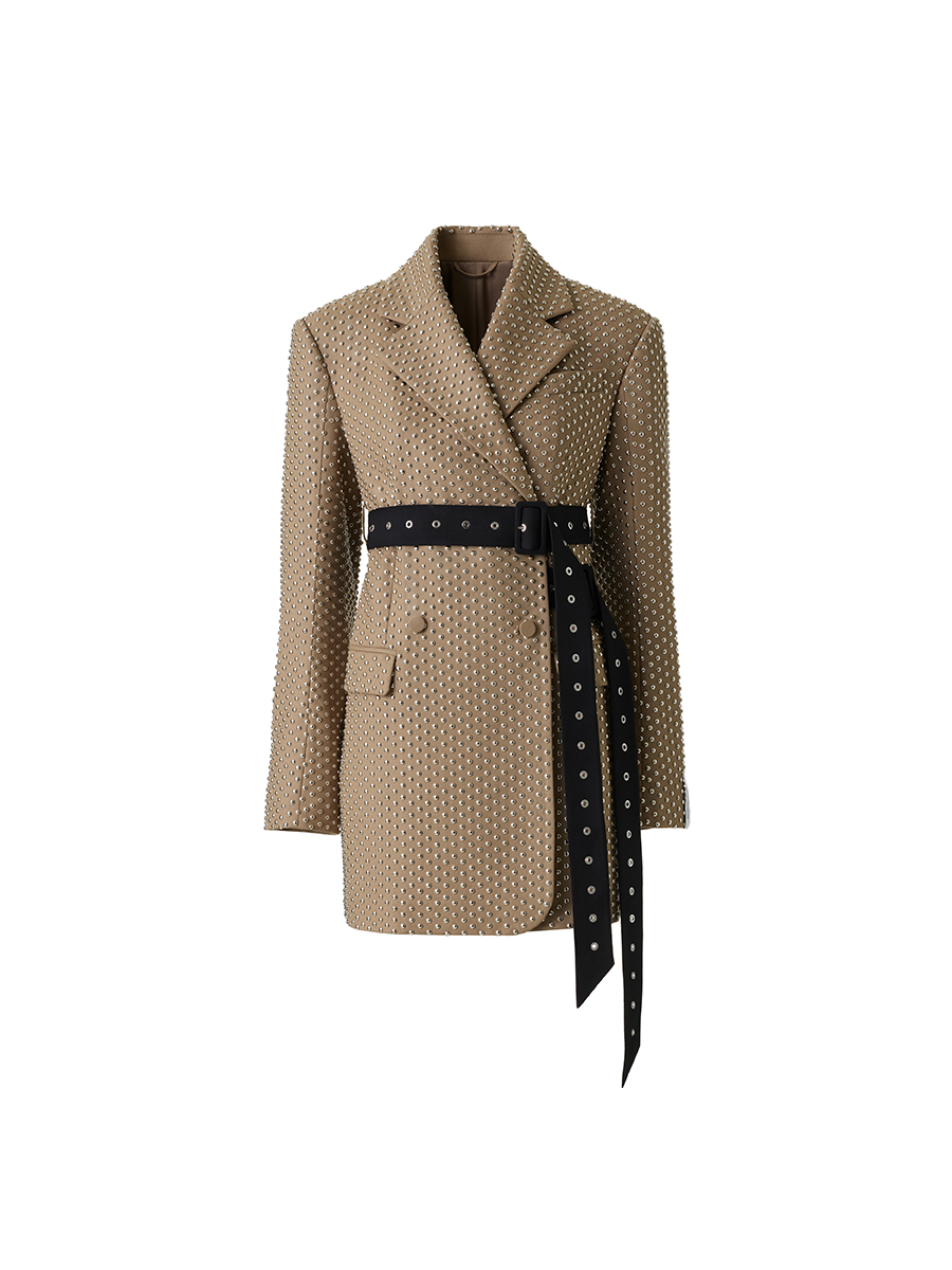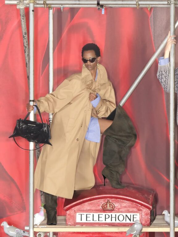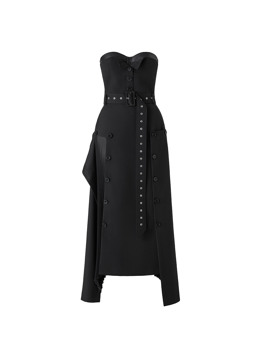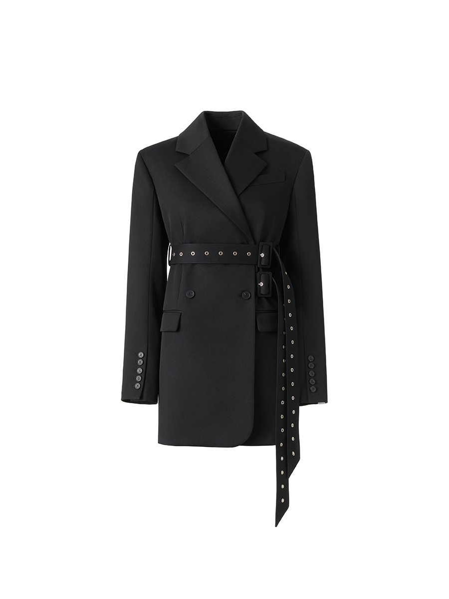 ウィメンズウェアからは、rokhのシグネチャーアイテムでもあるダブルレイヤーのトレンチコート、メタリックノッチ付きベルトが伸びたオーバーサイズブレザー、取り外し可能なイレギュラープリーツのブラック・コルセットドレス、カットアウト・ブレザーミニドレスが登場。