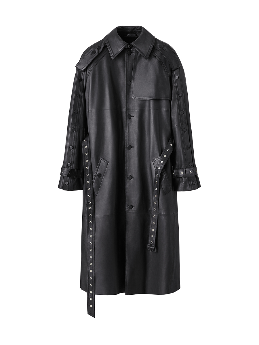 メンズウェアからは、オーバーサイズのマルチボタンが特徴的なトレンチコートとレザーブレザー、アコーディオンファイルケースを模したオーガナイザーバッグや、リサイクル素材を用いたメタリックなジュエリー、二重巻きのダブルウエストベルト、インダストリアルな雰囲気のトランスペアレントミュール、rokhのロゴがプリントされたレザーのブリーフケースバッグが数量限定で登場。