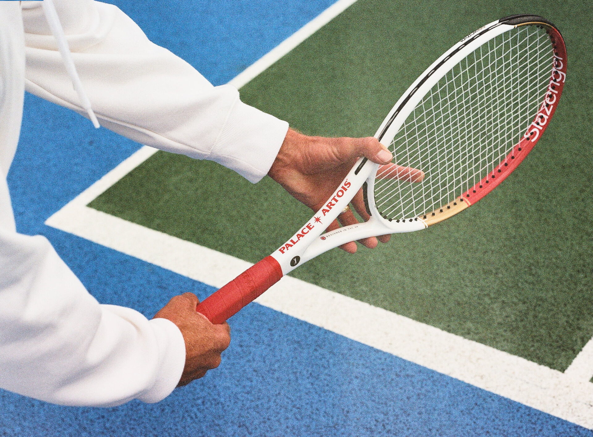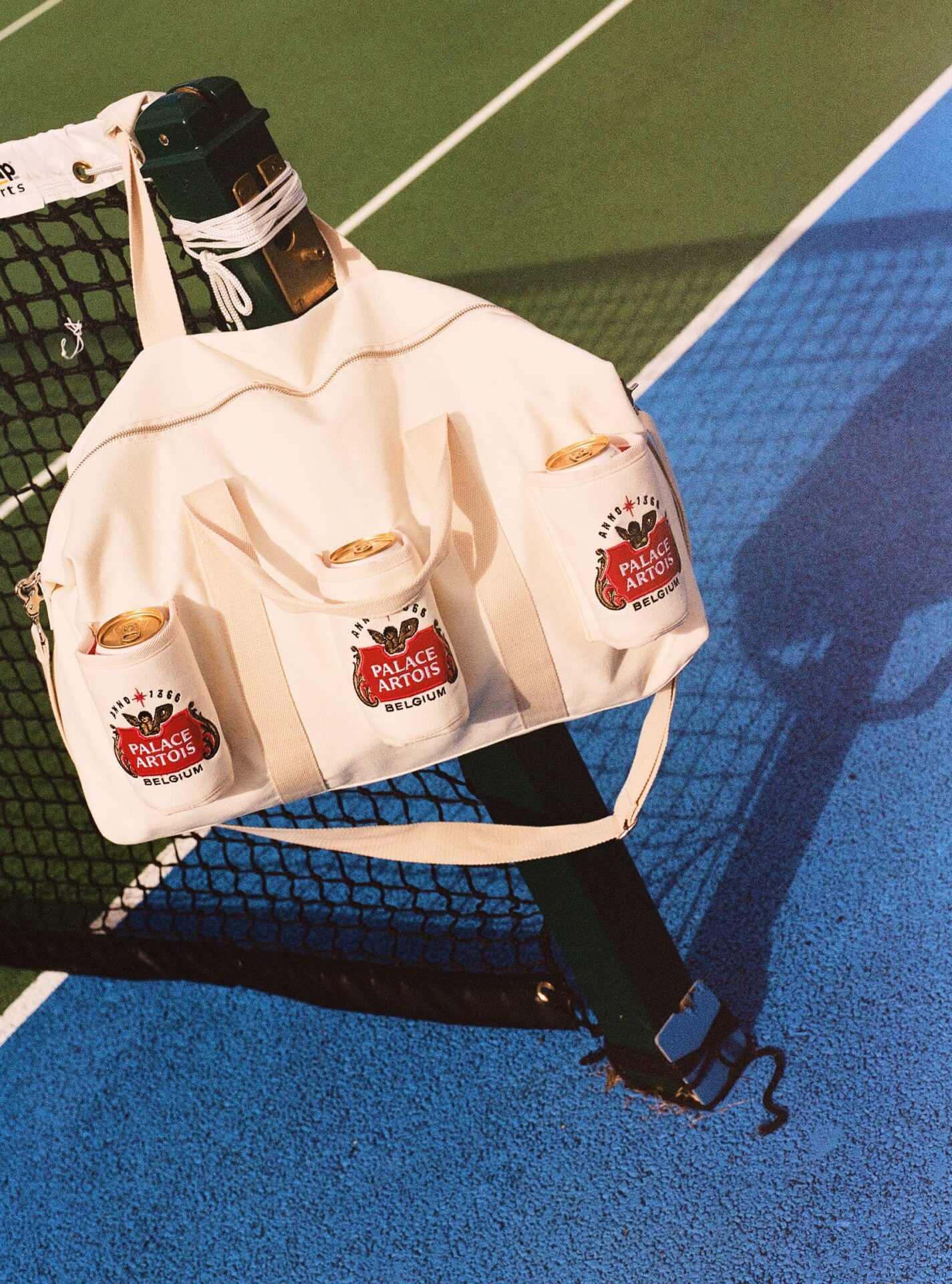 スポーツラインには、腕の刺繍とロゴバッジが付いたスマートなブルゾンのマッチジャケット、「PALACE ARTOIS」のロゴが入った軽量コートジャケット、テックポロシャツ、ショートパンツがあり、お揃いのキャップやソックスと組み合わせることが可能。さらに、スポーツ用品の老舗の1つでもある伝説的メーカー、Slazenger製の特別なテニスラケットとボール。ほかのアクセサリーにはタオル、テニスキットやビールを収納するホールドオールバッグも用意。オフコート用のパーカー、Tシャツ、そしてカルト的人気を誇る「PALACE ARTOIS」ビールグラスが復活。