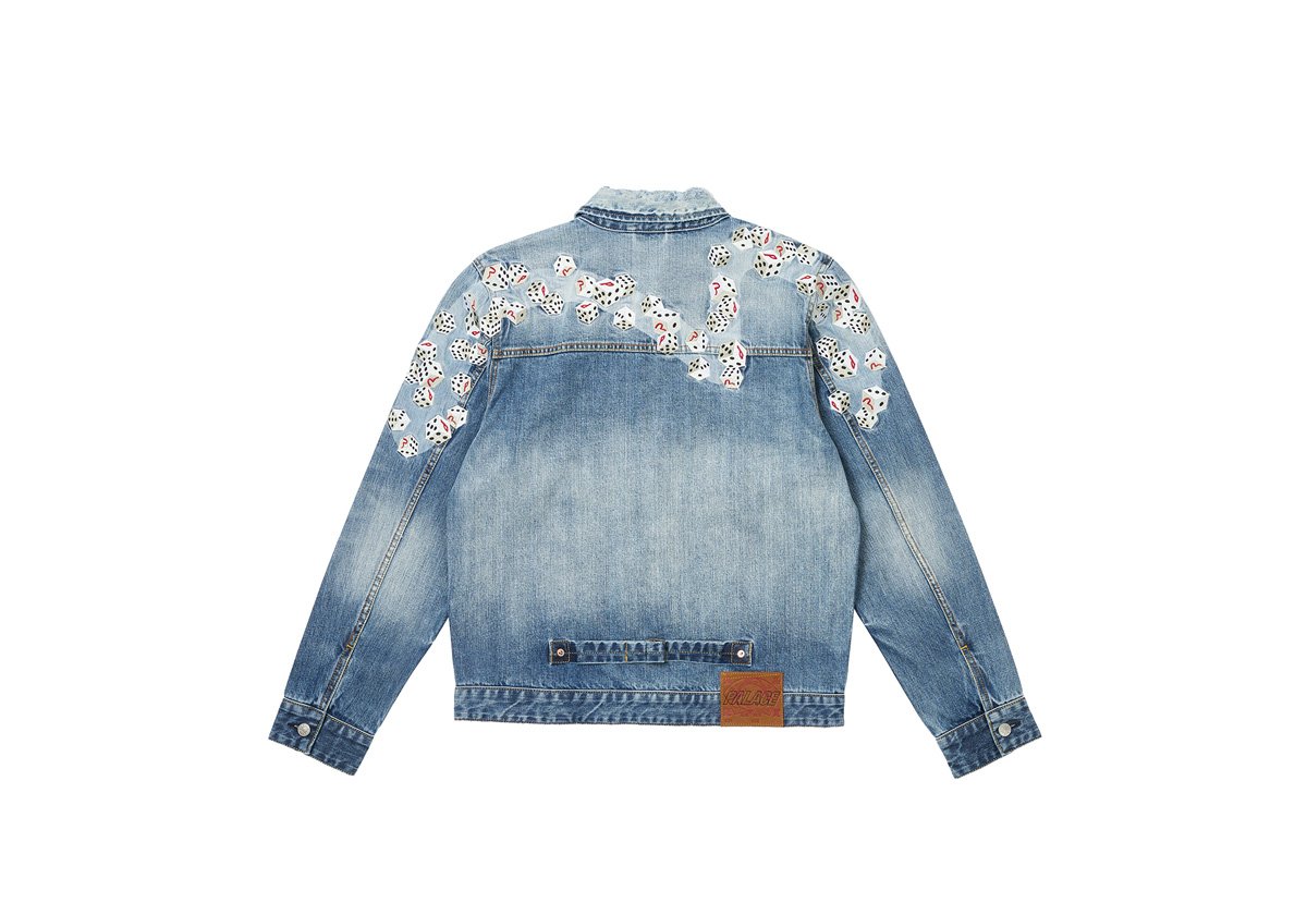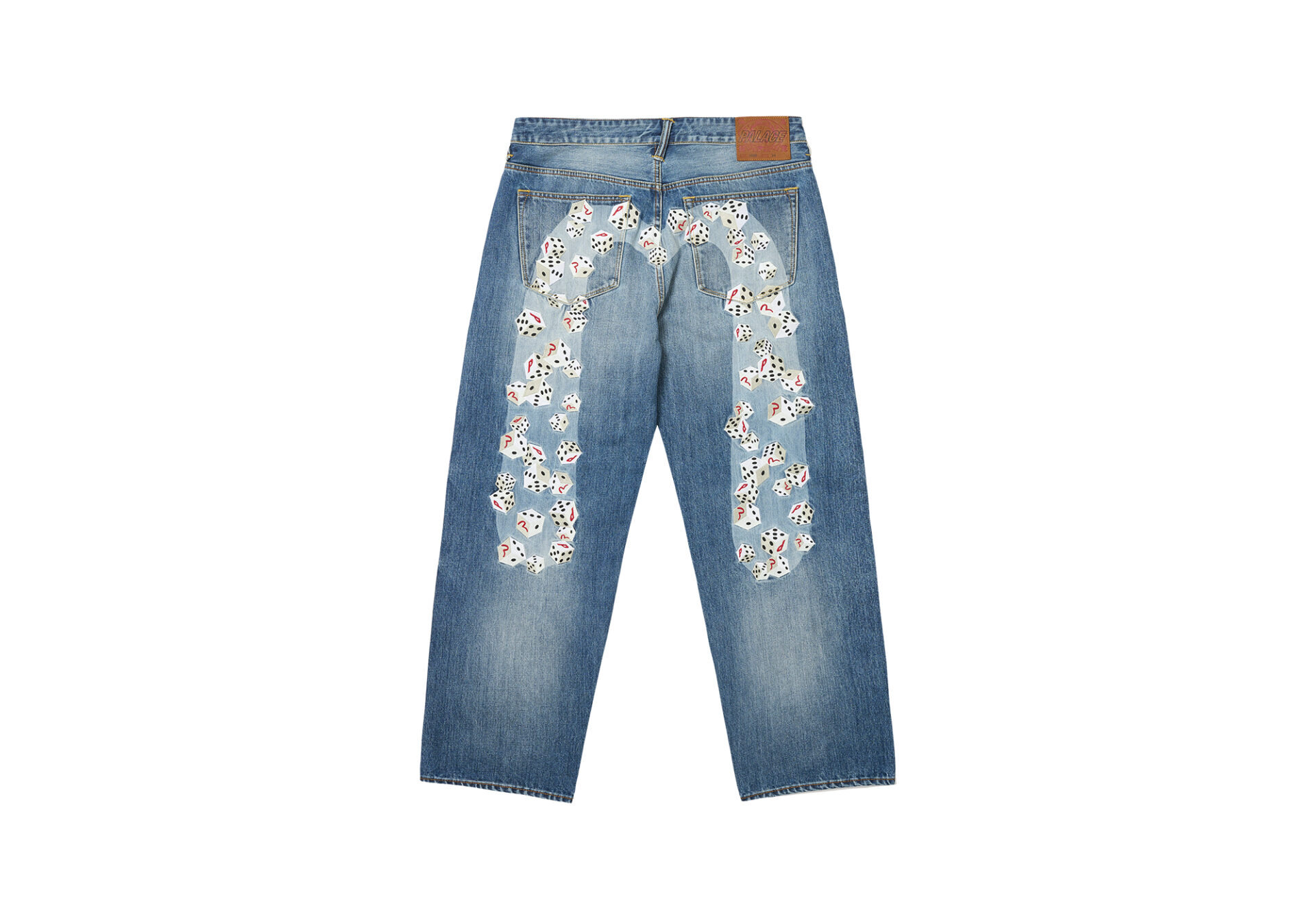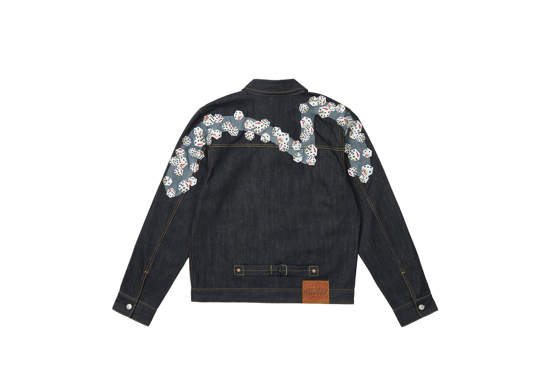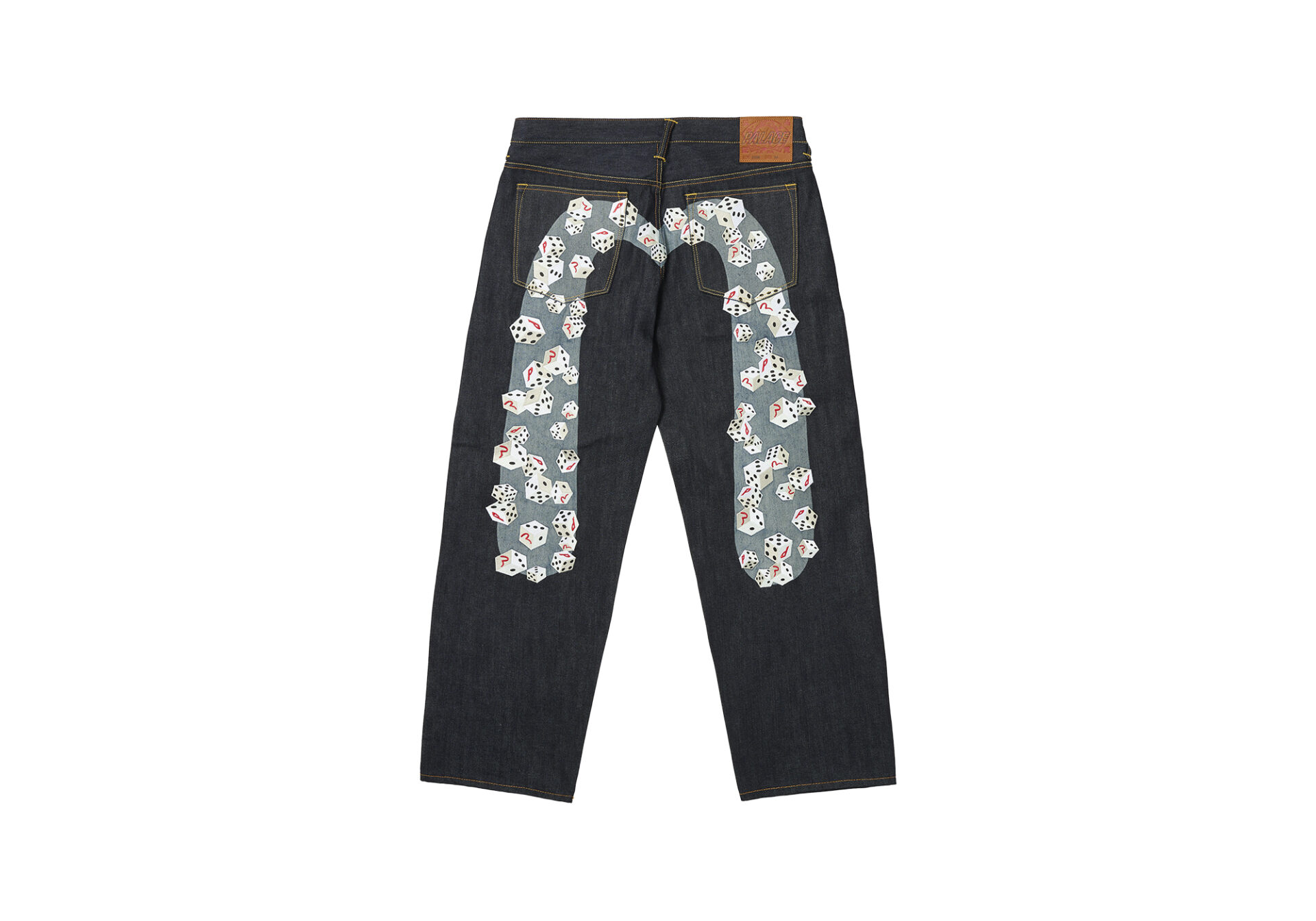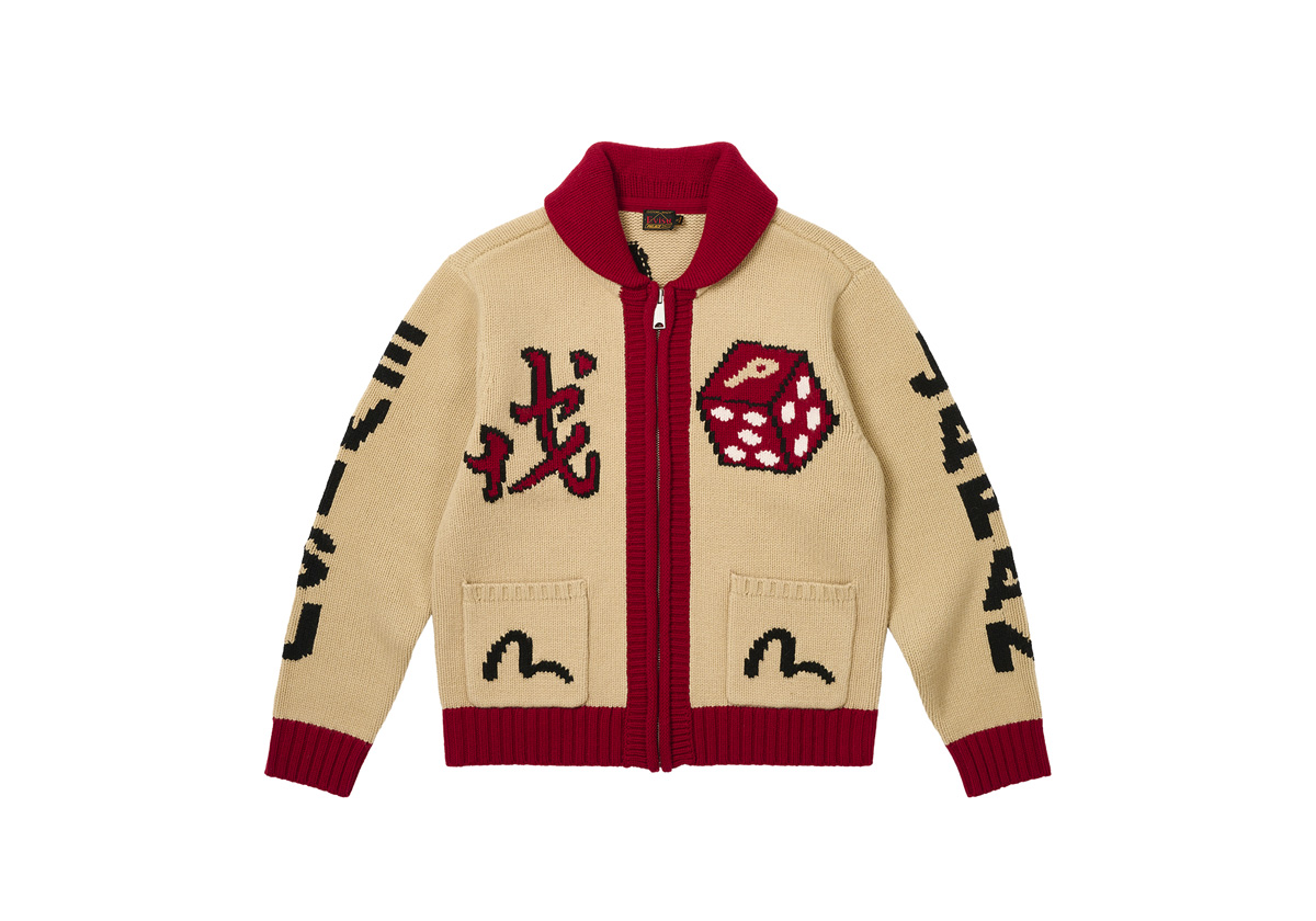 ダイスをメインビジュアルに採用。遊び心のあるダイスの刺繍が刺繍が施されたライトウォッシュと生デニムのショーツとパンツのバギーな5ポケットジーンズと、2ポケットジャケットや、オーバーサイズのダイスと大胆な「EVISU」と「JAPAN」の腕章があしらわれたラムウール100%のカウチンニットカーディガン、両ブランドのロゴを組み合わせたTシャツや、アクセサリー、デニムのトートバッグ、ダイスセットなども揃う。