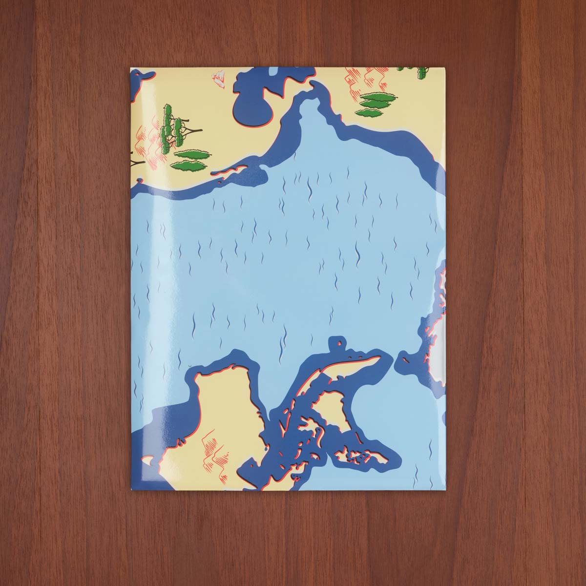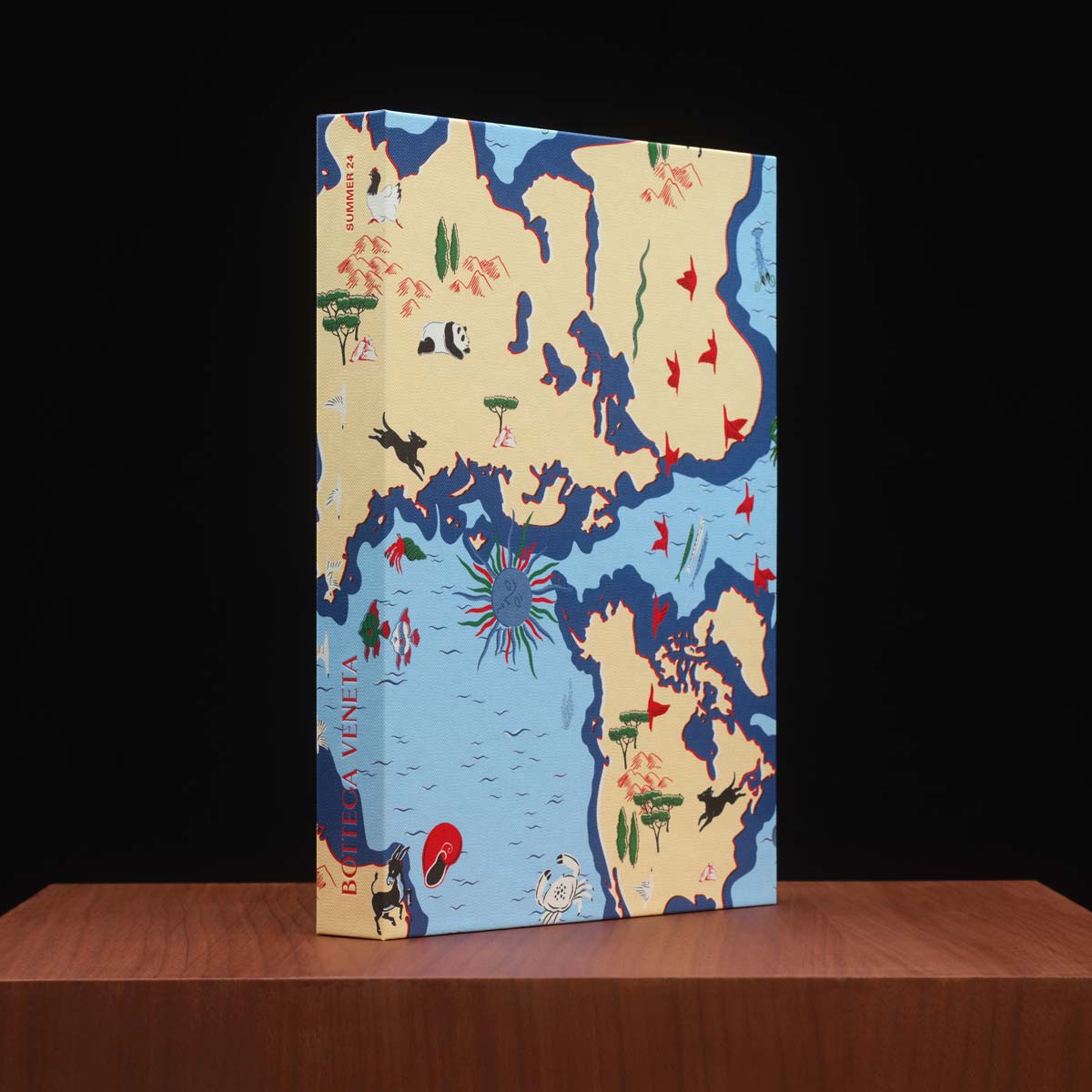 2024年サマーコレクションのショー会場のフロアに描かれたものと同じ世界地図のイラストをプリントしたブックケースに収納する。