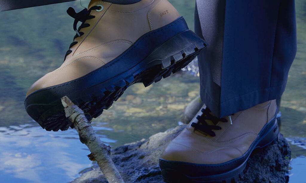 最新コレクション0004.Collectionのテーマは「Ubiquitous sun.」。全体に配置された複数のステッチのラインと柔らかなキャンバスの質感は、イサム・ノグチ氏の光の彫刻「AKARI」のしなやかな竹ひごの曲線や和紙の温かみと呼応するようにデザインされている。約5.8cm のソール厚のVibram®社の最新ソールを採用し、高反発ウレタンインソールとコルク製中底を組み合わせる事で過去最高の柔らかな履き心地を実現。環境に配慮されたエシカルなフェイクレザーを使用。