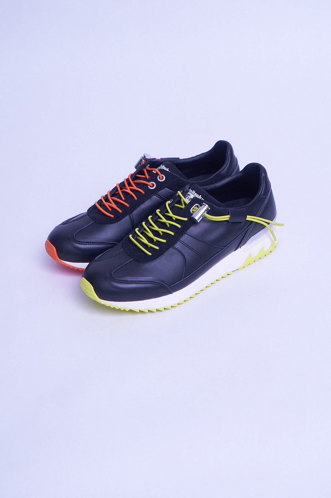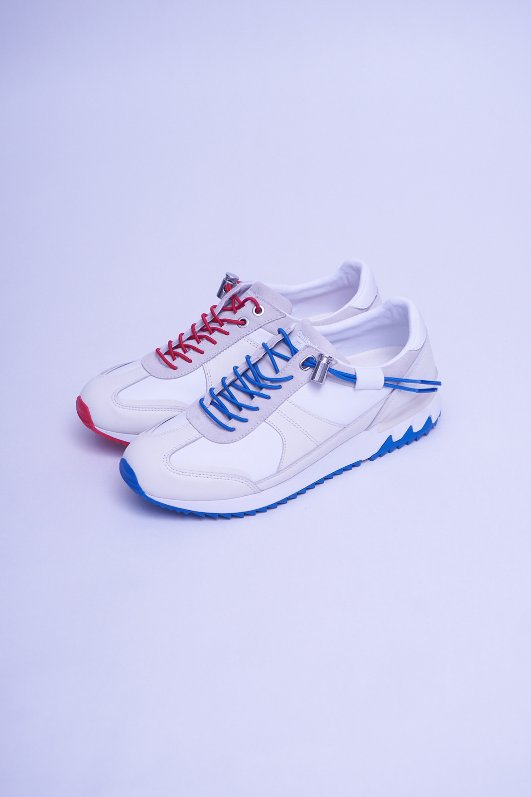 全体はオールレザー(牛革)で仕上げ、ブラック、ホワイトといった定番的なカラーを使用し、ソールとシューレースはアシンメトリーな配色にしている。