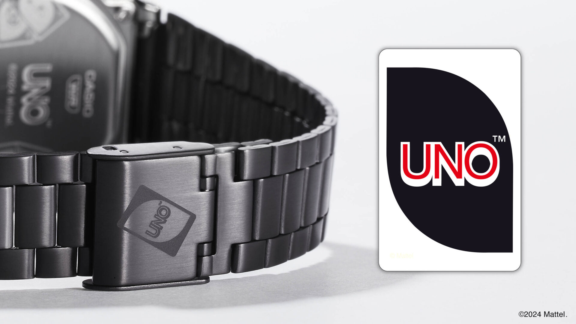 クラシカルスタイルが人気の「A168」をベースに、「UNO」をモチーフにした時計デザインが特徴的。場にどのカードがあっても出すことができ、出した人は好きな色を宣言できる「ワイルドカード」をダイアルデザインに採用し、赤・青・黄色・緑の配色をそのままフェイスに反映。ELバックライトを点灯すると、液晶に「Wild」の文字が浮かび上がる。ダイアル部の「UNO」ロゴは当時のデザインを使用。 「UNO」カードの裏面デザインを中留に、ロゴと時計の型番を表現した「1」「6」 「8」を裏蓋に刻印。さらに、パッケージも「クラシックUNO」の パッケージカラーを採用。