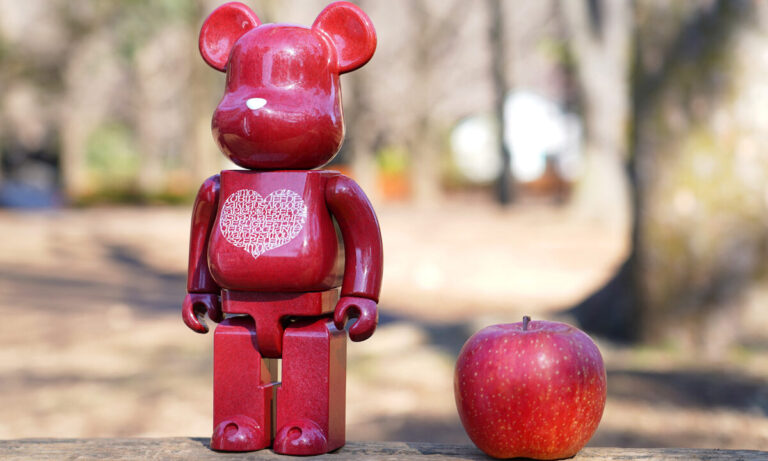 山本寛斎事務所が保有する「TOKYO POP(レプリカ)」の衣装をもとに、素材や縫製、デザインを細部まで忠実に再現しながら、BE@RBRICK 400%・1000%のフォルムにフィットするよう落とし込んだ。BE@RBRICK本体はKansai Redをベースに同ブランドのロゴを全身にウォータープリントであしらい、ブランドの世界観を詰め込んだアイコニックな1体。