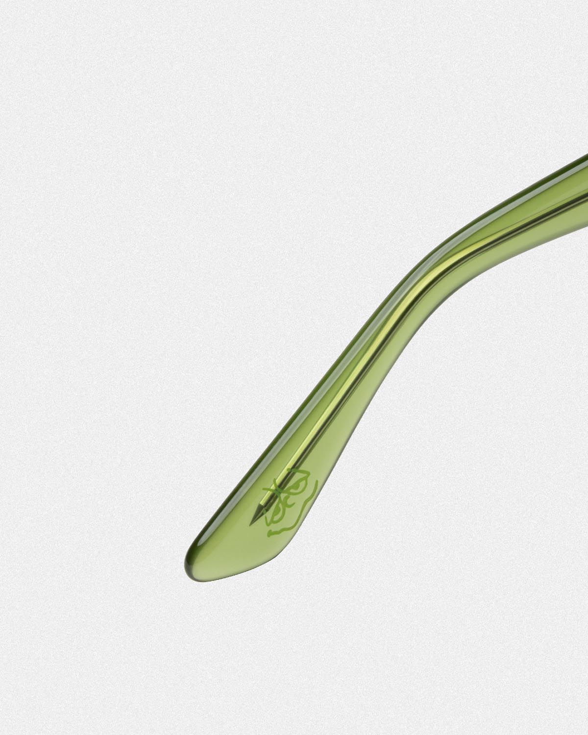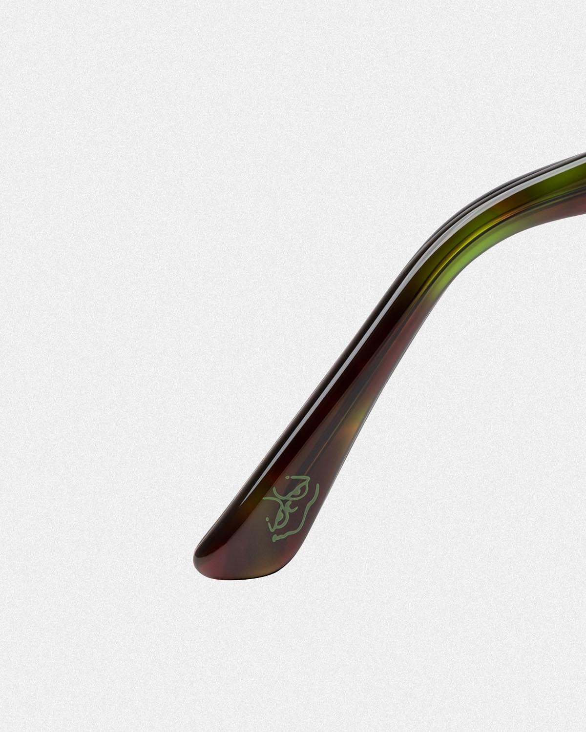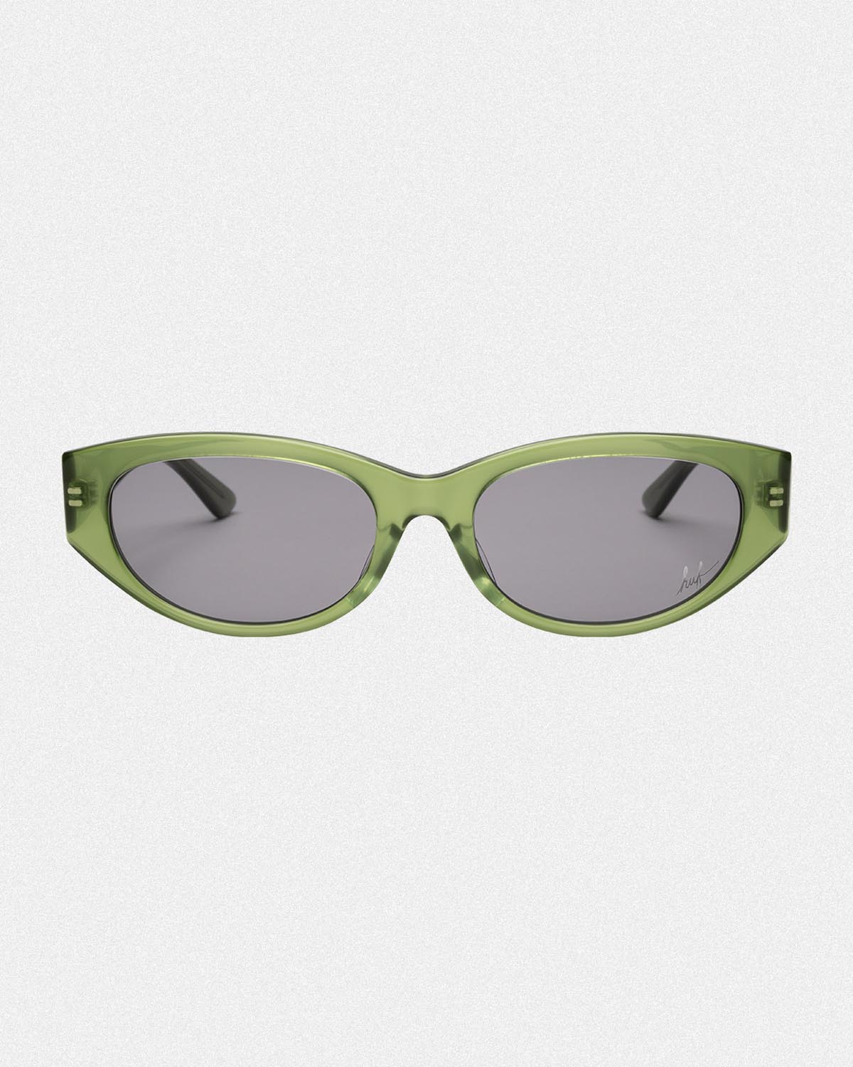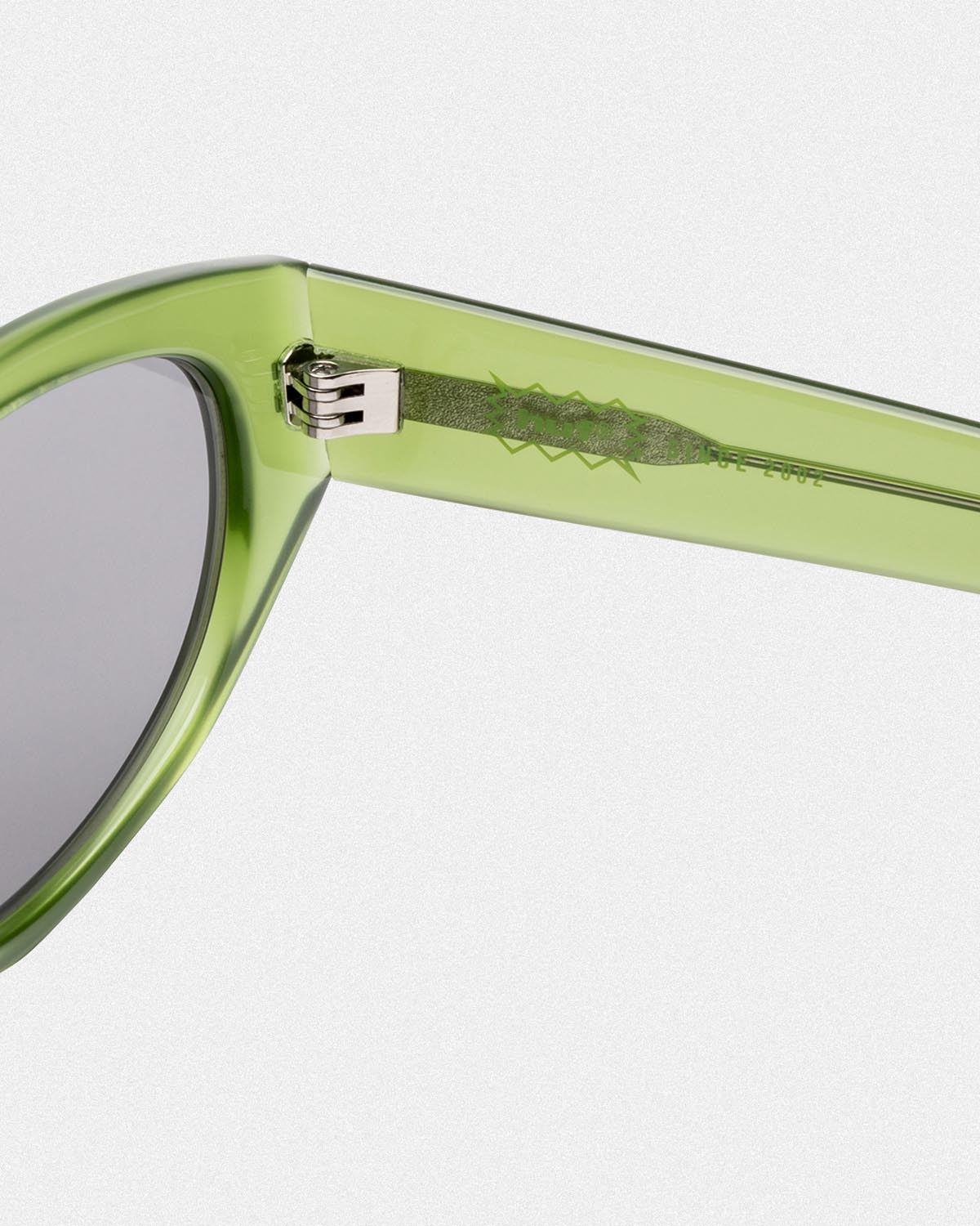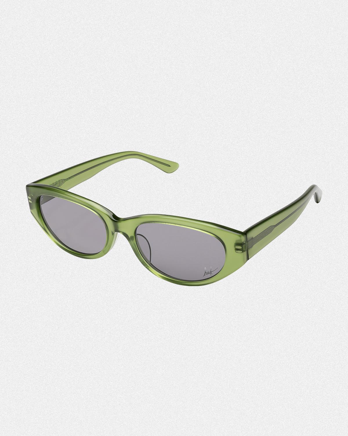 スクエアタイプの「WHARF」、フォックスタイプの「FLASH」の2型は、両モデルともレンズにHUFスクリプトロゴ刻印、テンプル内側にEYEWEARロゴプリント、モダン内側にGREEN BUDDYアートワークプリントが施され、携帯・収納に便利なオリジナル仕様のサングラスケースを付属したMade in Japanとなる。