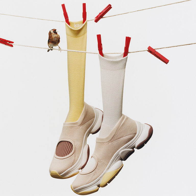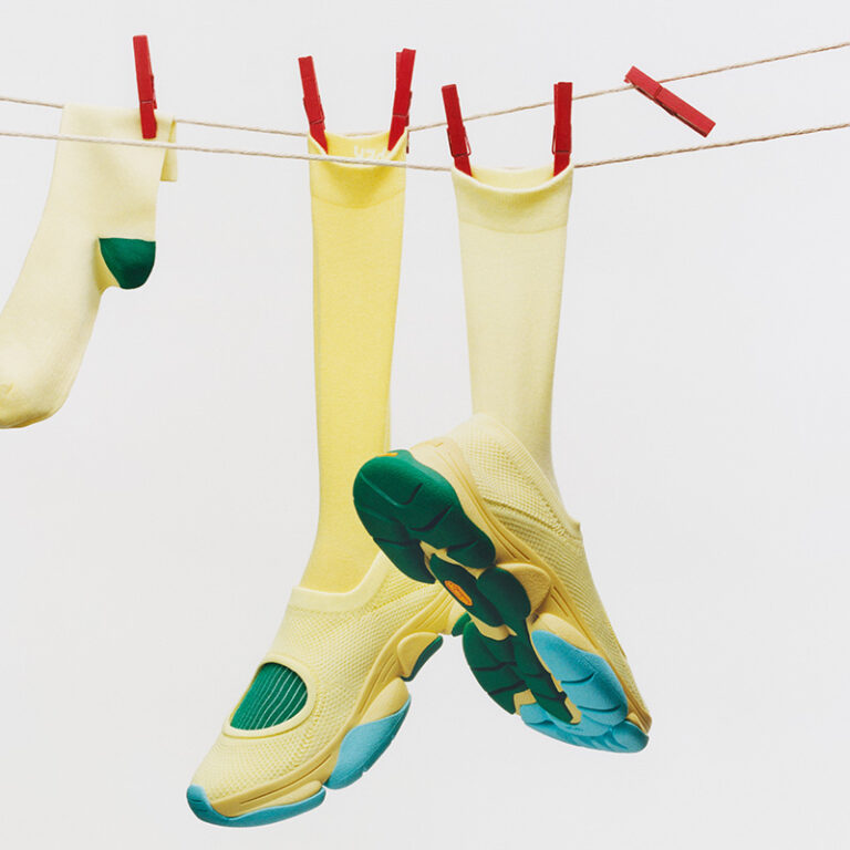 「ISSEY MIYAKE X UN」のシグネチャー「BOUNCE FIT」をアップデート。アッパーには柔らかく馴染みの良いリサイクルニットを使用し、よりスムーズな足入れと履き心地を実現。アウトソールのデザインも改良され、軽さと柔軟性を保ちながらヒールの高さを従来より1.5cmプラスしている。