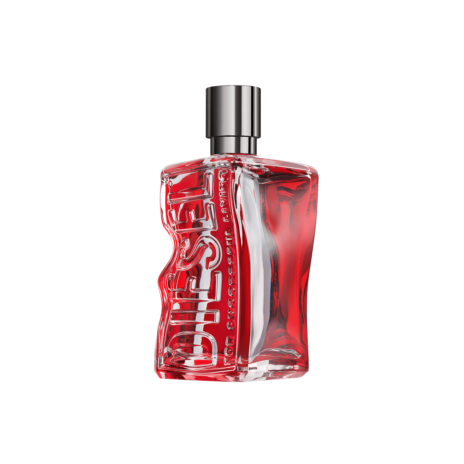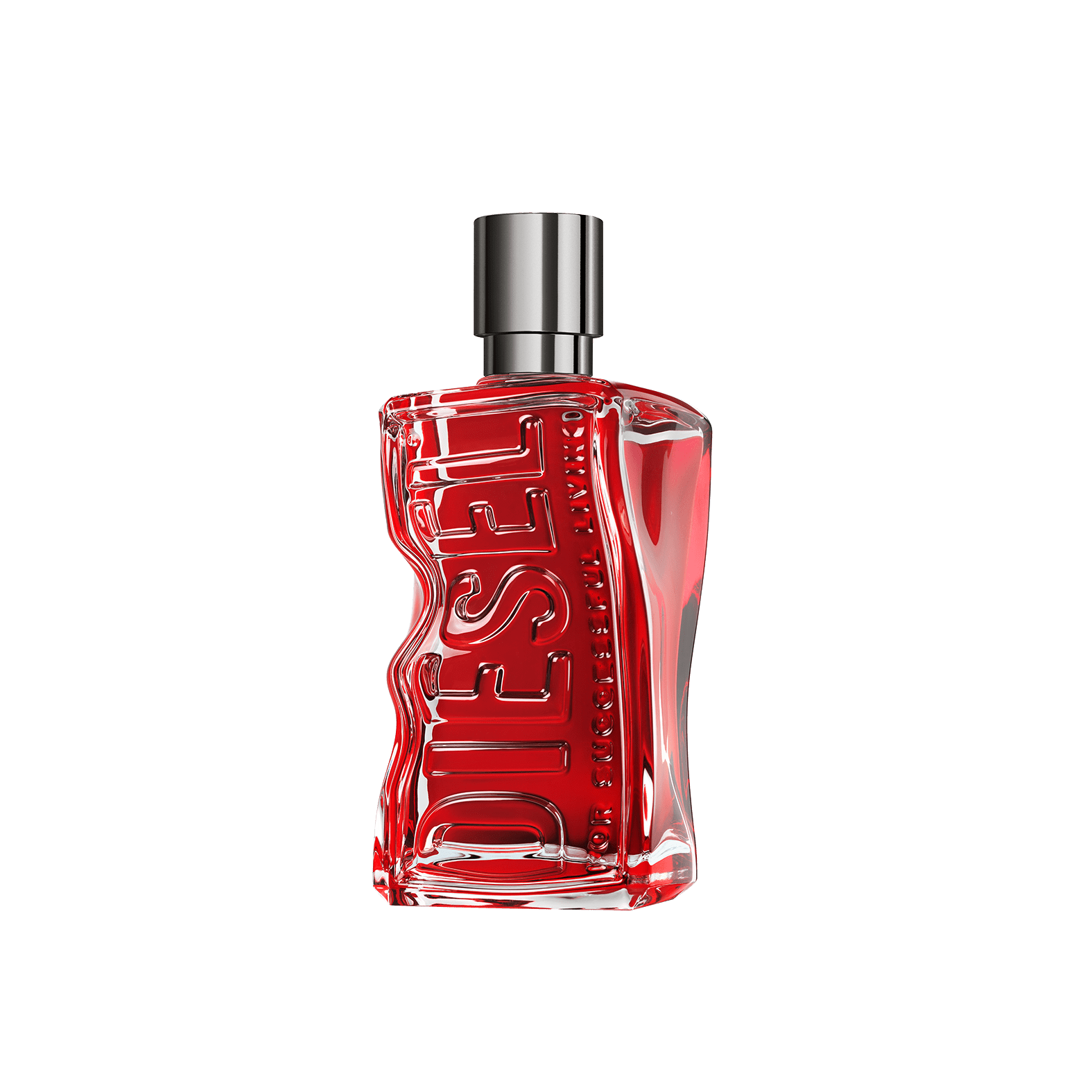 ボトルはリサイクルガラスで作られており、DIESELのジェンダーフリーフレグランスD by Dieselのシグネチャーボトルの新たな進化を反映。「Diesel For Successful Living」のロゴを拳で握り潰したようなデザインと、DIESELのアイコニックなブランドカラーを象徴するレッドやジーンズのリベットを模したインダストリアルなチャコールのキャップとのコントラストが特徴。