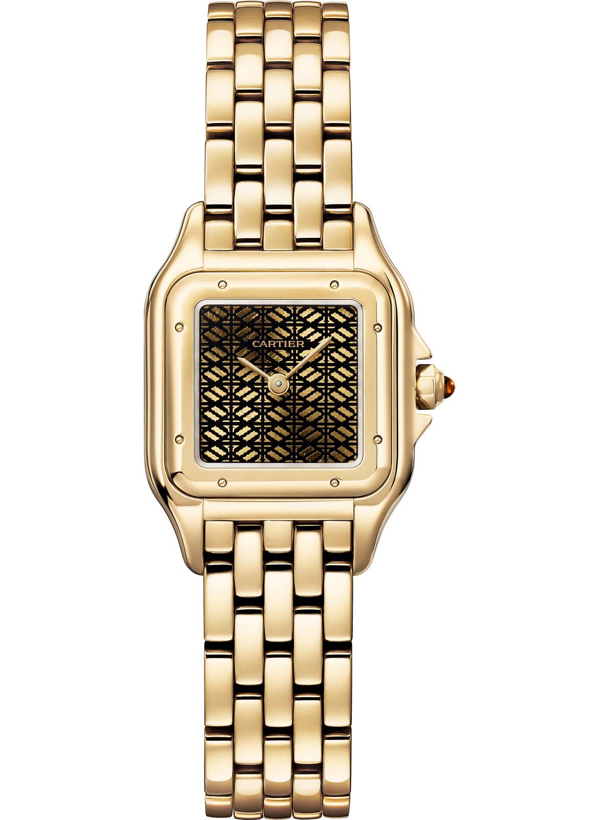 「パンテール ドゥ カルティエ」のダイアルは、テキスタイルや着物を染色するために使用される日本伝統の薄い型紙の美しい模様から想を得てデザイン。新作の着想源となった型紙は、日本の伝統文化をこよなく愛した3代目当主ルイ・カルティエ(Louis Cartier)個人のアーカイブから発見されたもの。型紙の美しい模様がイエローゴールドとポリッシュ仕上げのブラックラッカーで精巧に表現されている。