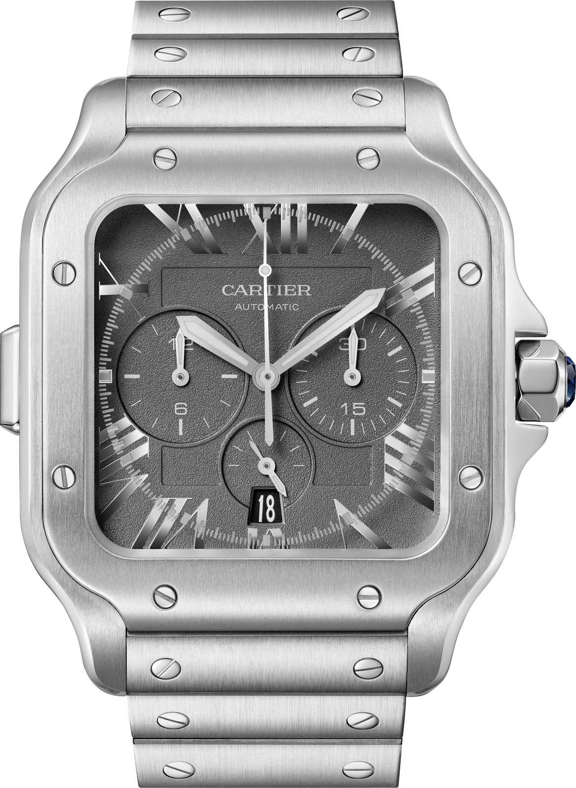 新作の日本限定モデルのミニッツマーカーは、風防の裏面からエングレービングで施され、時間の視認性が高められた。通常ベゼルには鏡面仕上げが施されて「サントス ドゥ カルティエ」を、日本限定モデルにおいてはサテン加工を採用。ダイアルにはグレイン加工のマットな質感で仕上げた。イエローゴールドタイプとステンレススティールのクロノグラフの2種で展開。