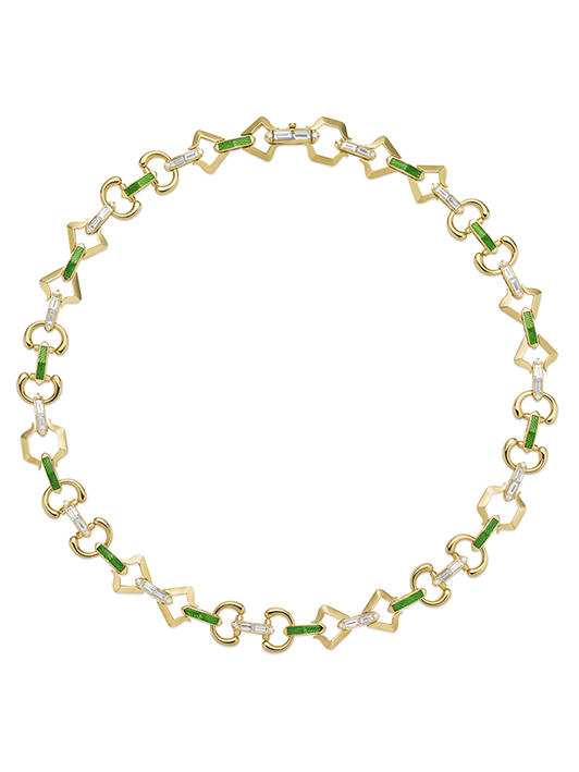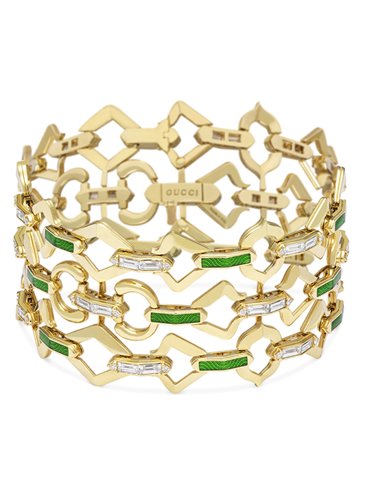 18K イエローゴールドのリング、ネックレス、1連と2連の2つのブレスレットがライナップ。チェーンタイプのネックレスとブレスレットは、クラシックなシェイプのホースビットと、ミニマルなデザインのものを交互に組み合わせてコントラストを演出したコンテンポラリーなデザインになっている。また、バゲット カットのダイヤモンドと鮮やかなグリーンエナメルがあしらわれ、プレシャスな輝きを放つネックレス、1連と3連のブレスレットも揃う。