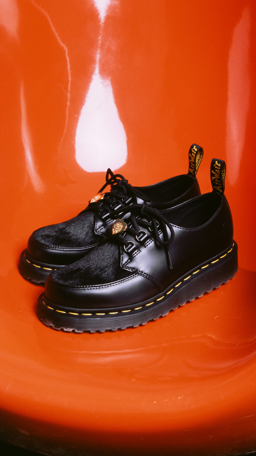 ブラックのスムースレザーと、ヴァンプの特徴的なヘアーオンレザーで構成され、Dリングのアイレットが特徴的。スモークウェッジプラットフォームソールを搭載し、Dr. Martensのウェルトステッチが施されている。シューレースにはGirls Don’t Cryアイコニックなゴールドハートチャームを取り付けた。