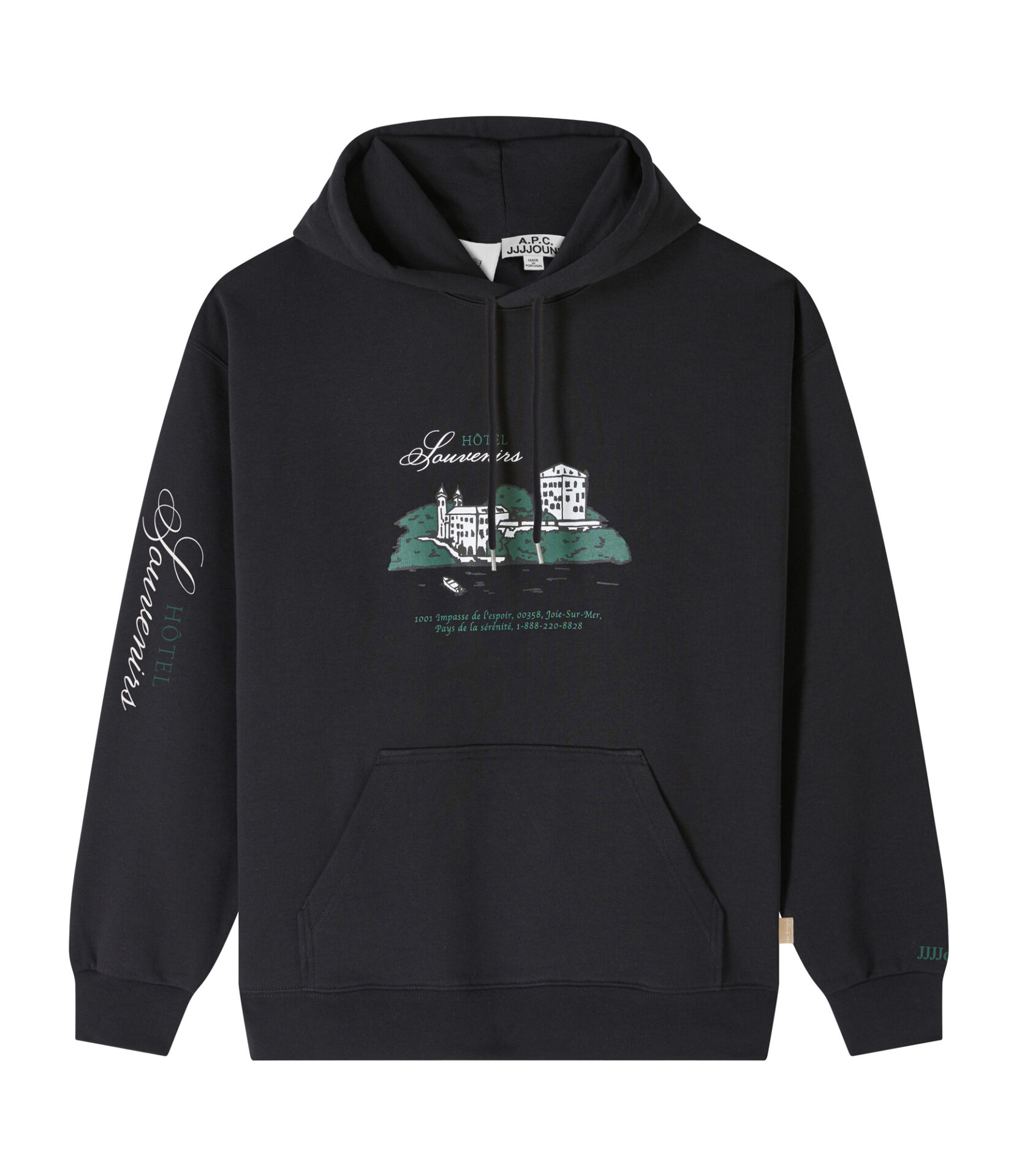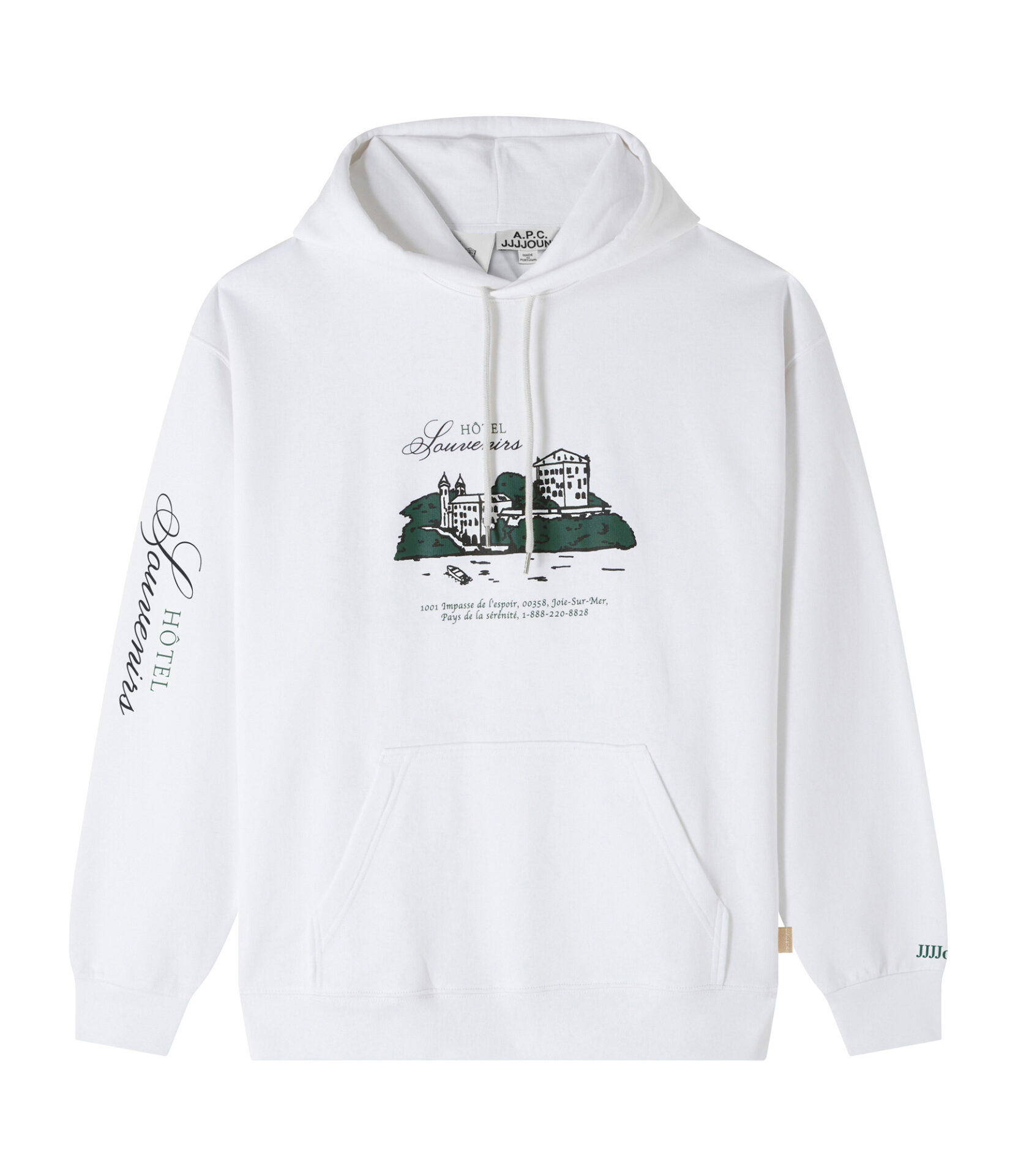夏のバカンスに向け、メンズワードローブのエッセンシャルアイテムを再考し、「A.P.C. JJJJound」の控えめなロゴが施されたダークネイビーのモノクロームルックに仕上げたシャツ、スイムショーツ、スカーフや、「l’Hôtel Souvenirs」のロゴが施されたホワイト、ブラック展開のスウェットシャツ、Tシャツ、キャップ、トートバックを揃える。