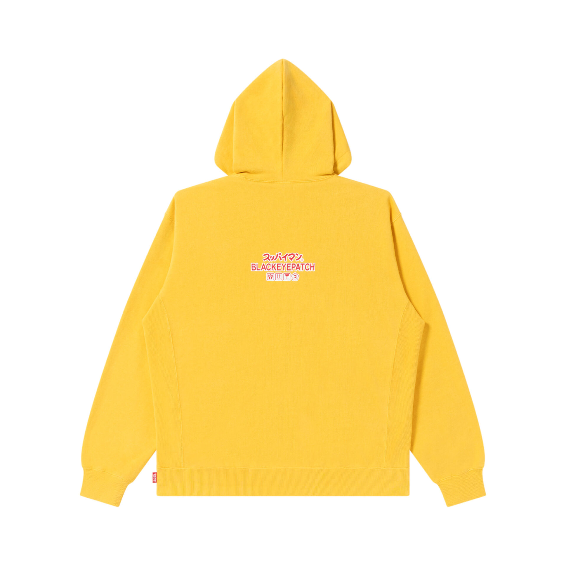 フーディー、Tシャツ、キャニスター、プルオーバーフーディにプリントしている“OG LABEL”ロゴは「スッパイマン」のパッケージから連想されたカラーのイエロー × レッドで構成。背面にも、ブランド定番の“HWC”グラフィックと「スッパイマン」を掛け合わせたデザインを落とし込んだ。