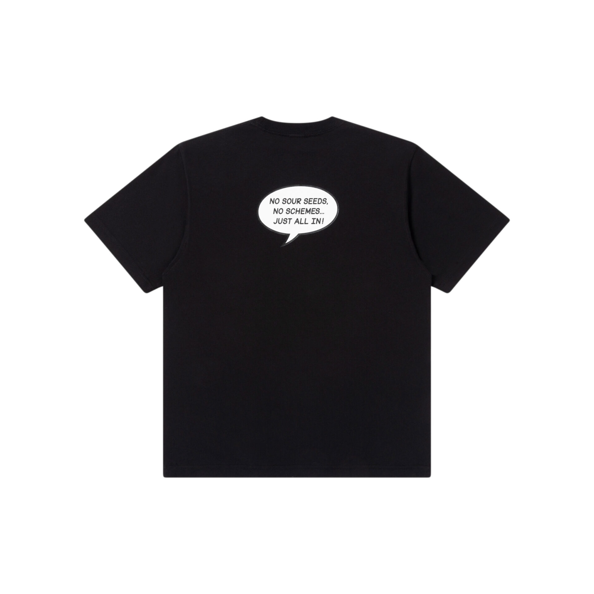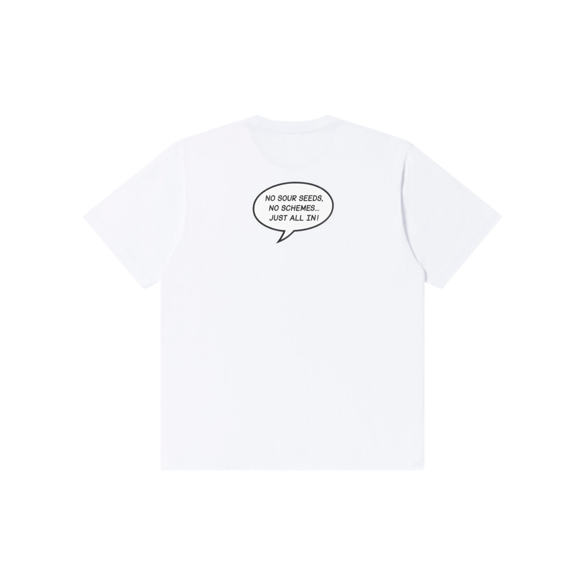 Tシャツは、「スッパイマン」のキャラクターを大胆に配し、バックには=「タネなし(騙しなしの意味)、嘘もなし。出し惜しみなし!」のメッセージをプリント。このメッセージは、ルックビジュアルにも出演している沖縄県石垣島出身のラッパー・プロデューサーのCHOUJIの楽曲「バッズマン」のリリックを引用し、「スッパイマン」がこだわる“たねなし”を落とし込んだ。