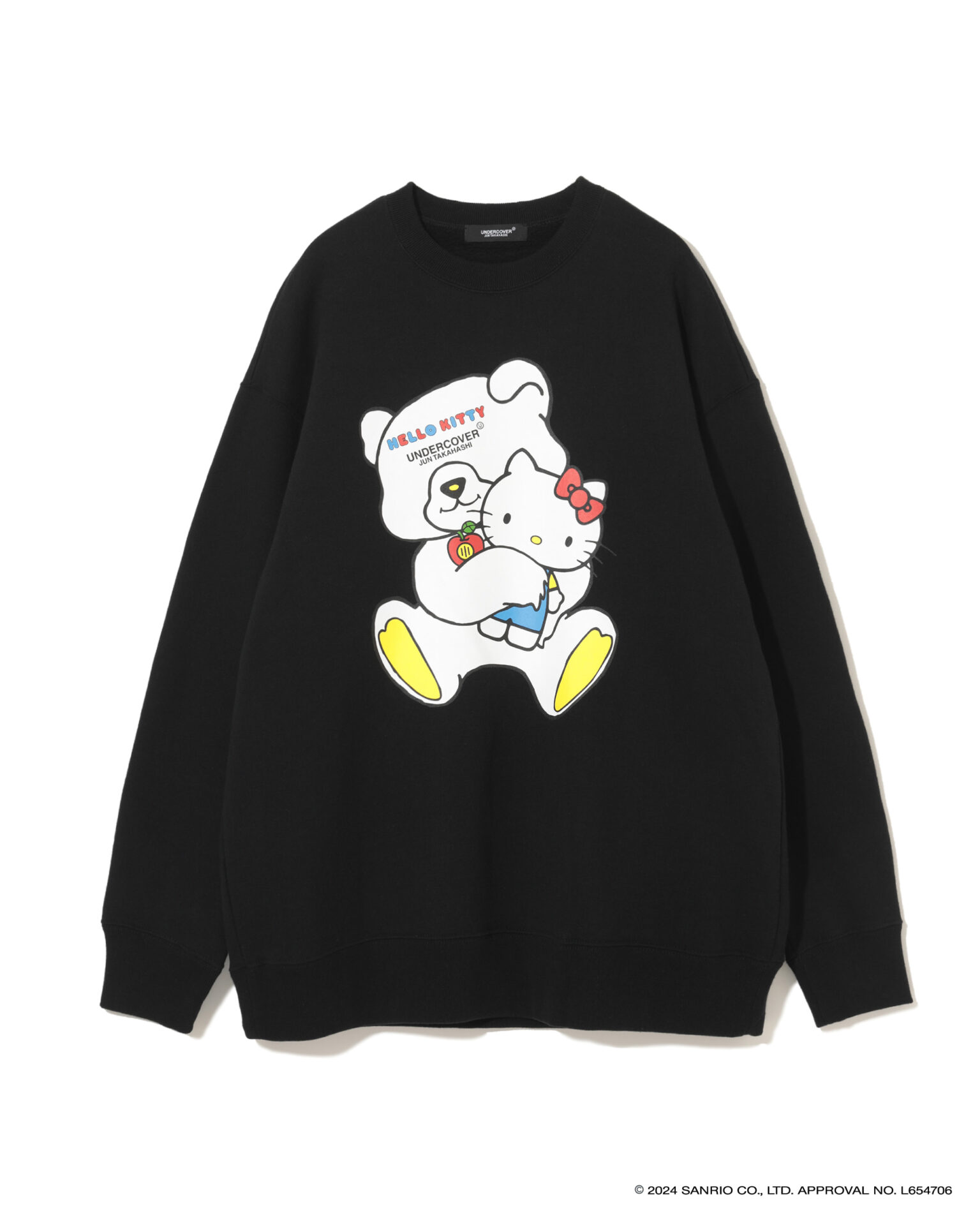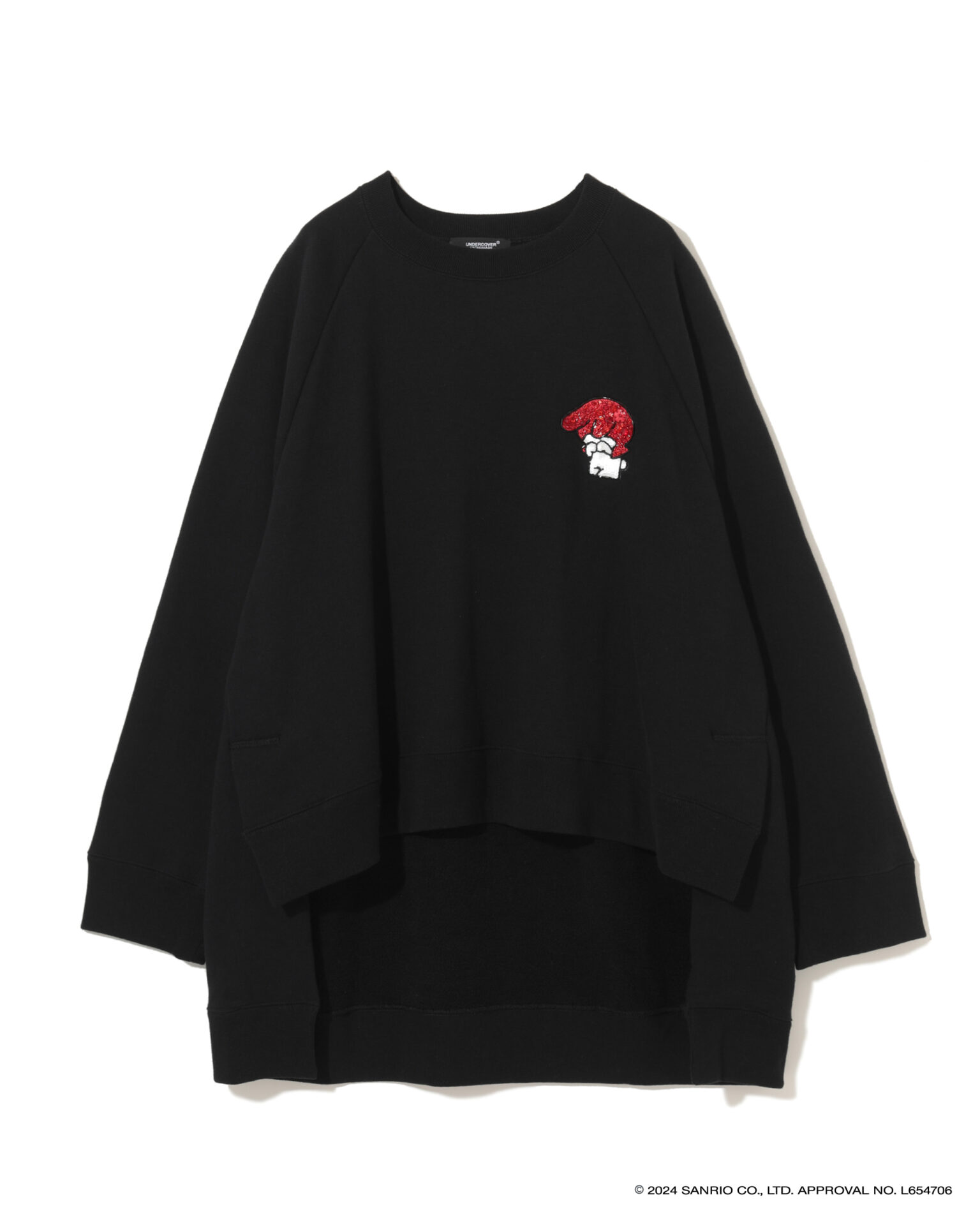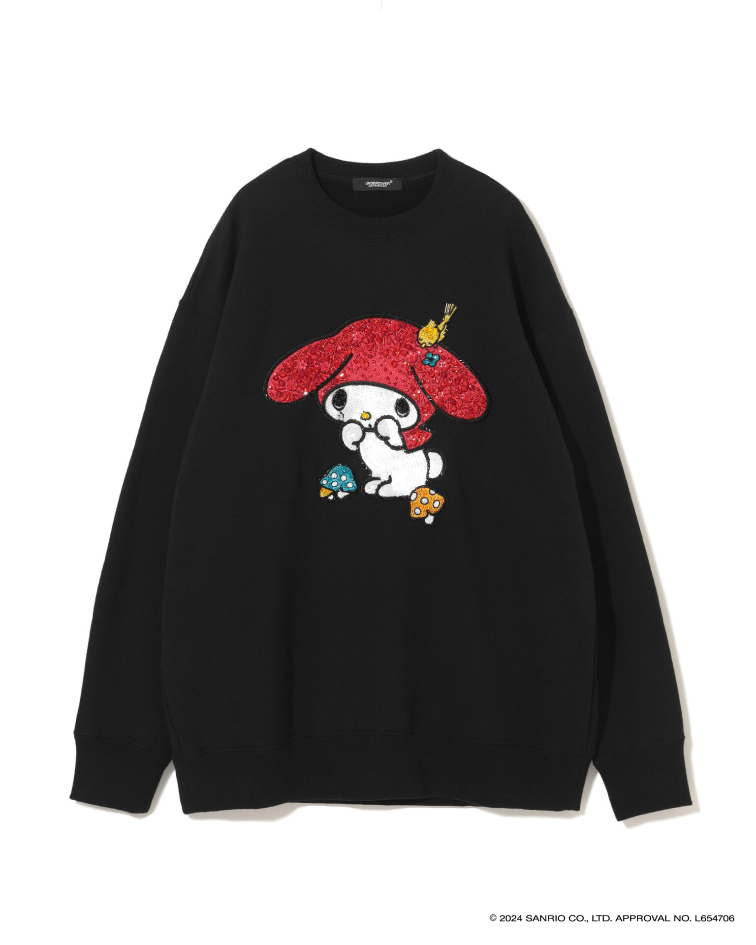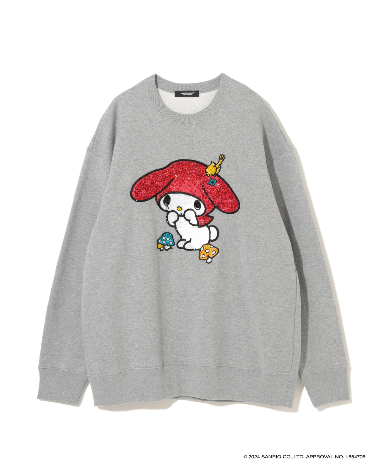 2024年で50周年を迎えた「ハローキティ」と「パティ&ジミー」、「マイメロディ」との特別なコラボを展開し、それぞれ誕生当時のキャラクターデザインを採用。UNDERCOVERのロゴやアイコンであるベアとの組み合わせ、ビーズやスパンコール刺繍で装飾したスウェットシャツ、Tシャツ、トートバック、キャップ、ポーチがお目見え。スウェットシャツは、オーバーサイズのものと、前裾が短く後ろが長いプルオーバー、フーディーの3タイプが揃う。ミニポーチやベースボールキャップも登場。