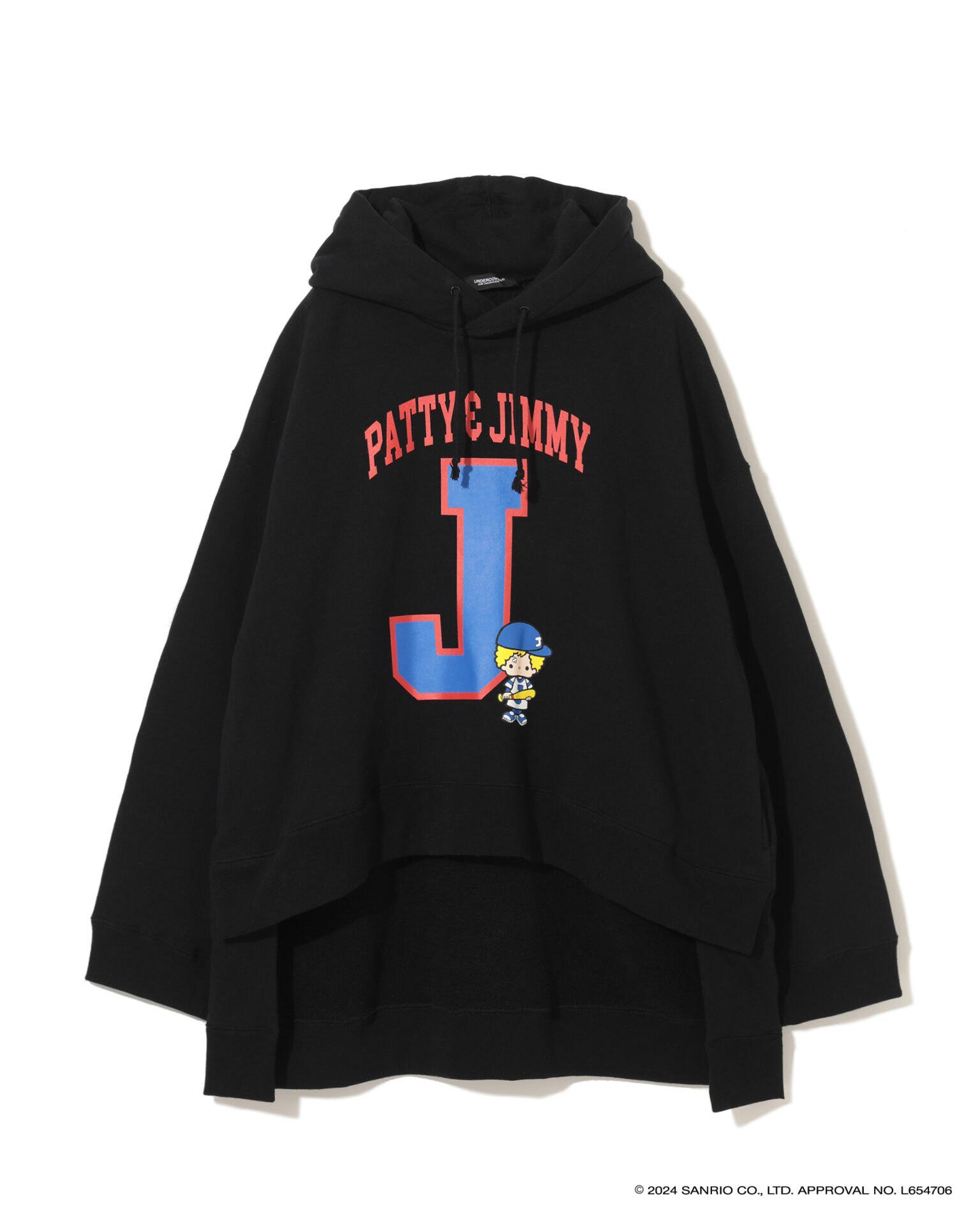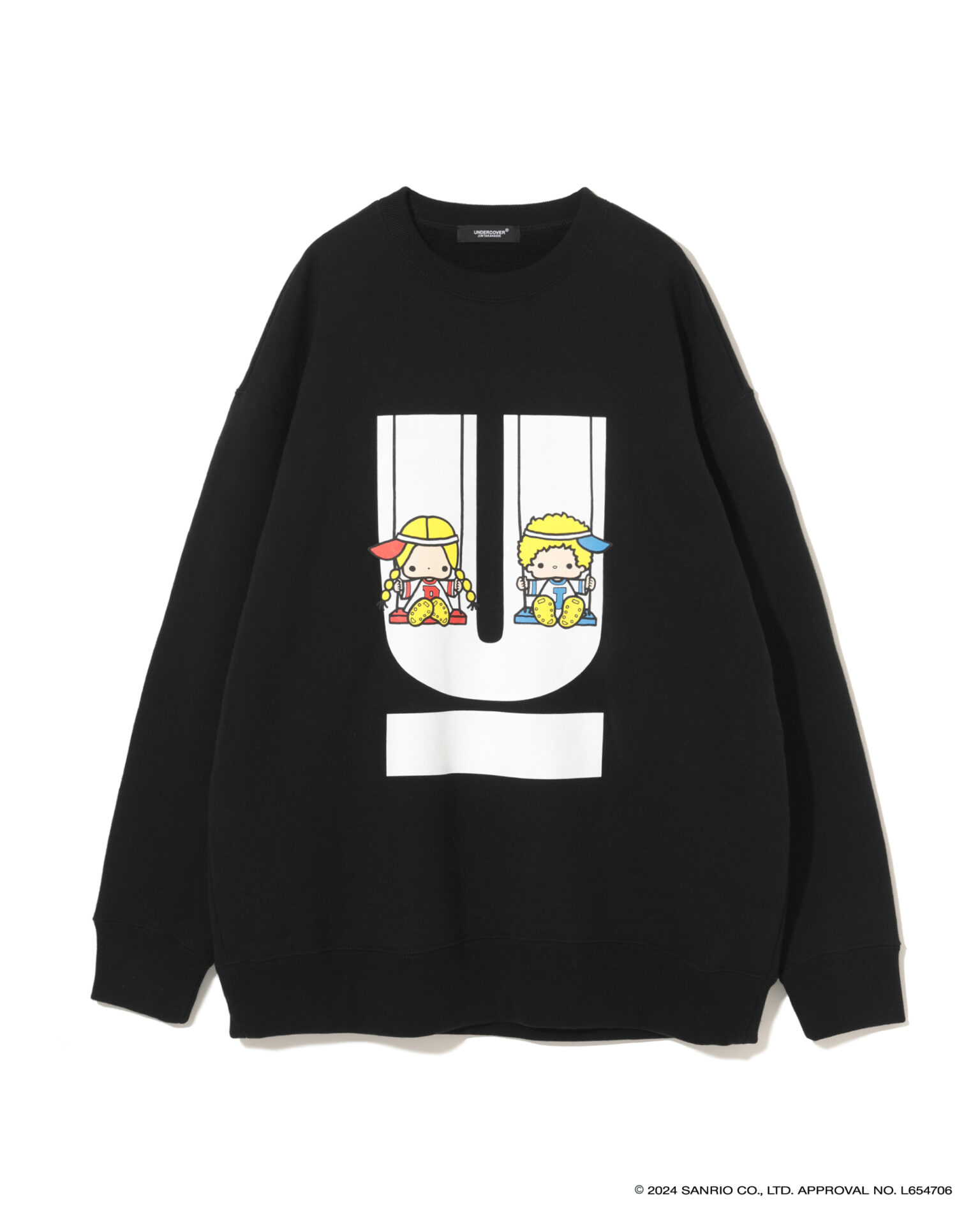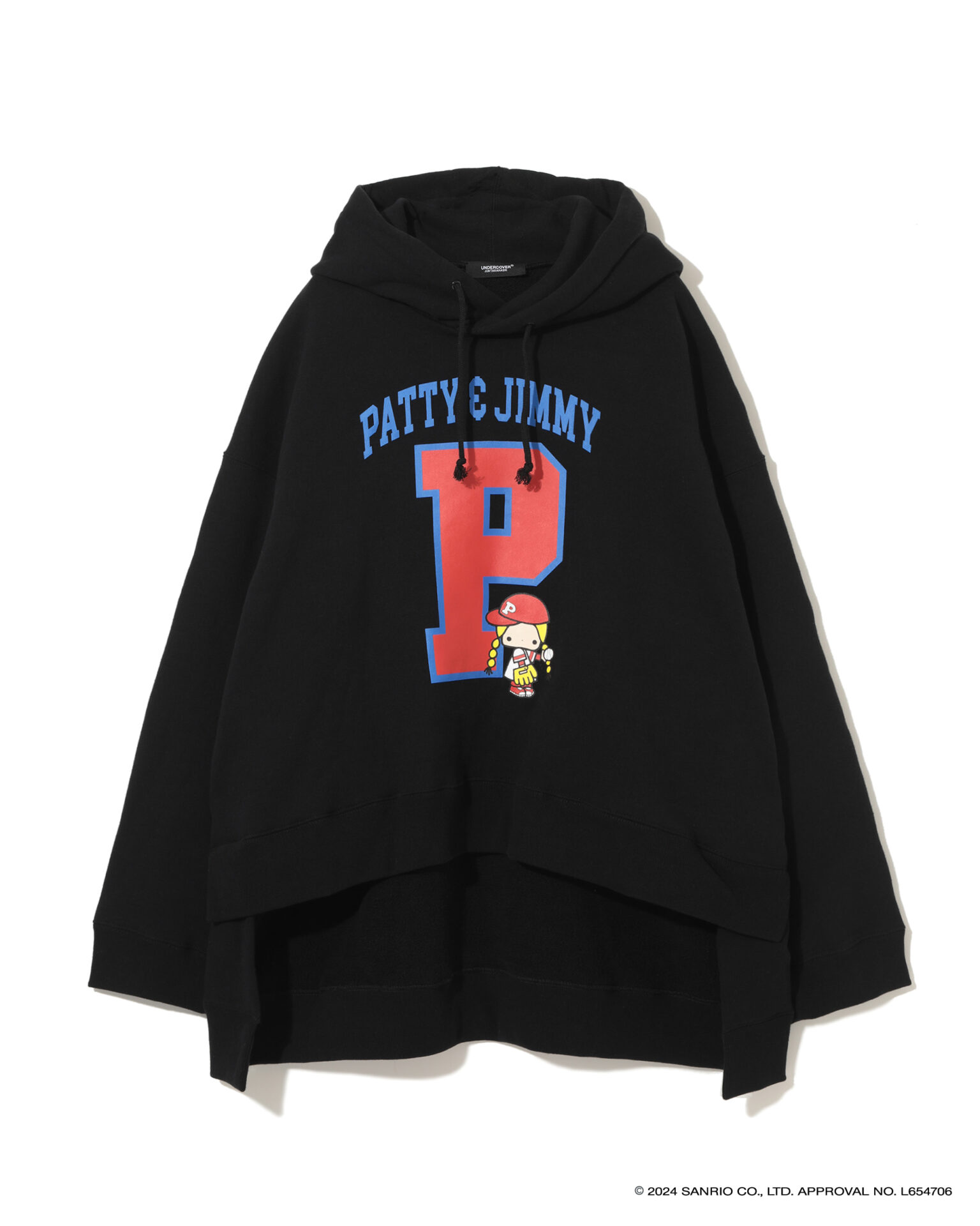 2024年で50周年を迎えた「ハローキティ」と「パティ&ジミー」、「マイメロディ」との特別なコラボを展開し、それぞれ誕生当時のキャラクターデザインを採用。UNDERCOVERのロゴやアイコンであるベアとの組み合わせ、ビーズやスパンコール刺繍で装飾したスウェットシャツ、Tシャツ、トートバック、キャップ、ポーチがお目見え。スウェットシャツは、オーバーサイズのものと、前裾が短く後ろが長いプルオーバー、フーディーの3タイプが揃う。ミニポーチやベースボールキャップも登場。