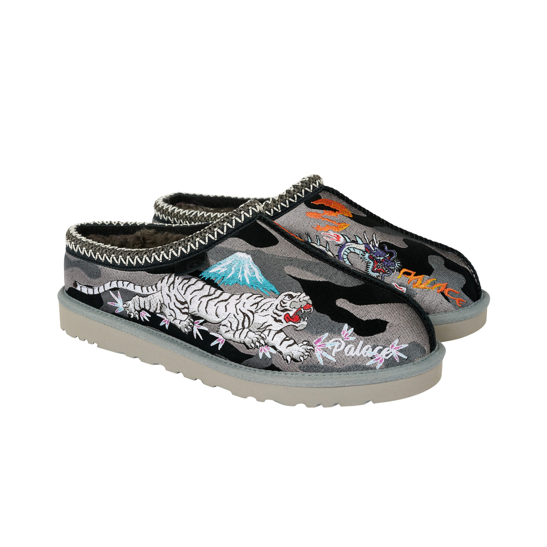 「Tasmanミュール」や「Classic Ultra Mini」を含むUGG®のアイコニックなアイテムに複雑なマルチレイヤーの刺繍を施し、ミックスカルチャーを表現。「UGG Palace Tasman」と「UGG Palace Ultra Mini」は、初の「UGG Palace Jacket」と一緒に登場。この新しい「UGG Palace Jacket」は、ソフトなスエードにシアリングのライニングが施され、袖には刺繍で表現した竜と虎、背中にはシアリングでデザインされたPalaceの「P」ロゴがあしらわれている。「UGG Palace Bucket Hat」と「UGG Palace Tote Ba」のアクセサリーもお目見え。
