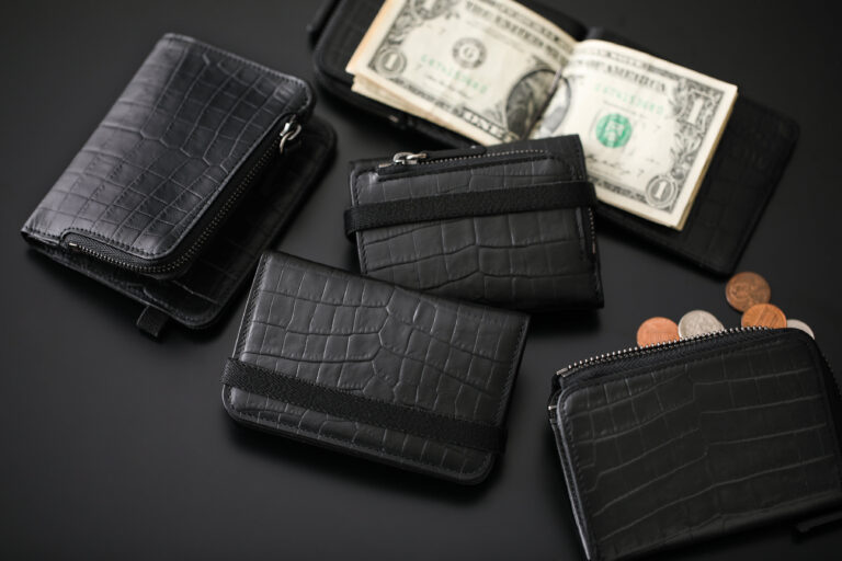 ラウンドファスナー開閉のウォレット2型、3つ折りのコンパクトウォレット、ショルダーバッグとしても使えるウォレットショルダーの4型が揃う。