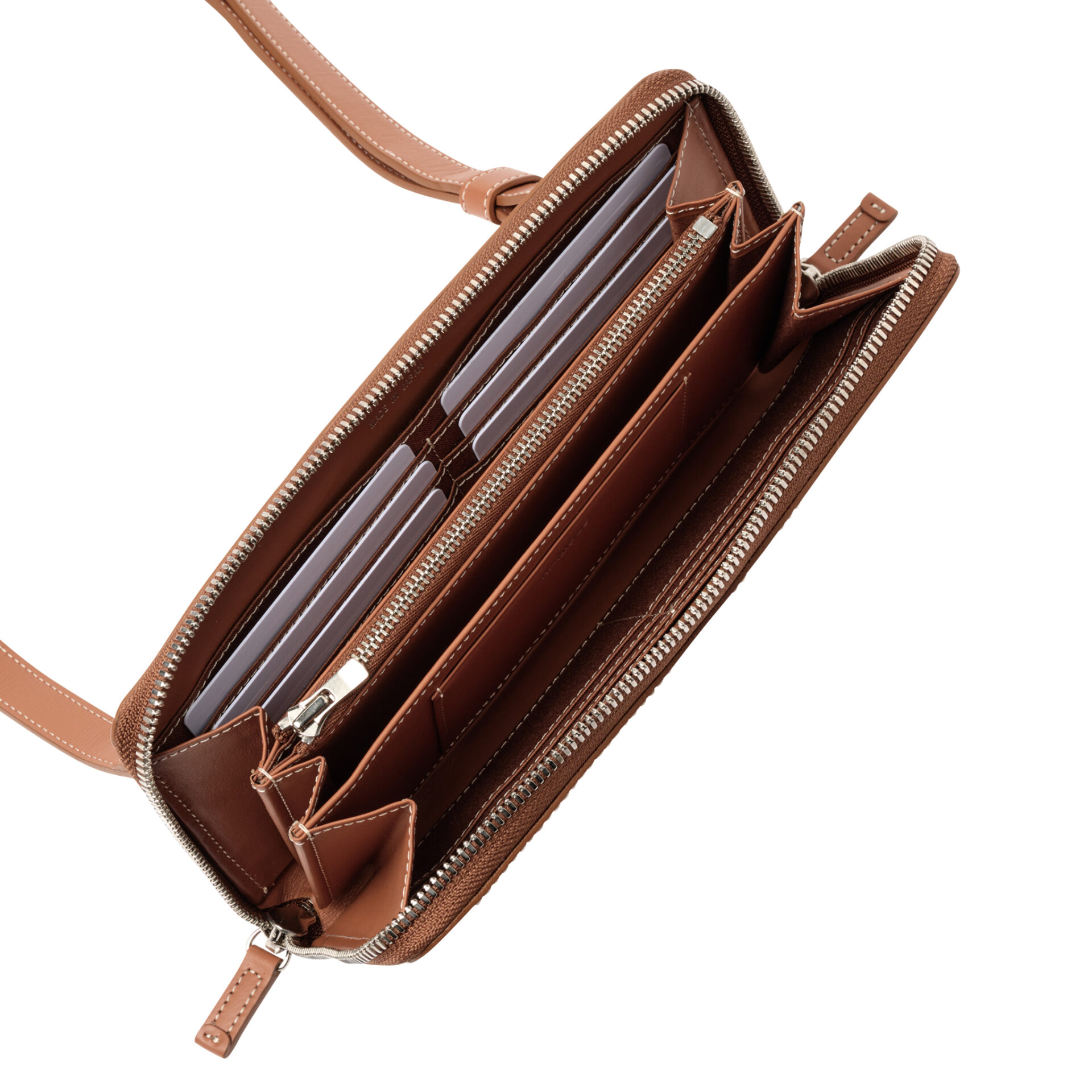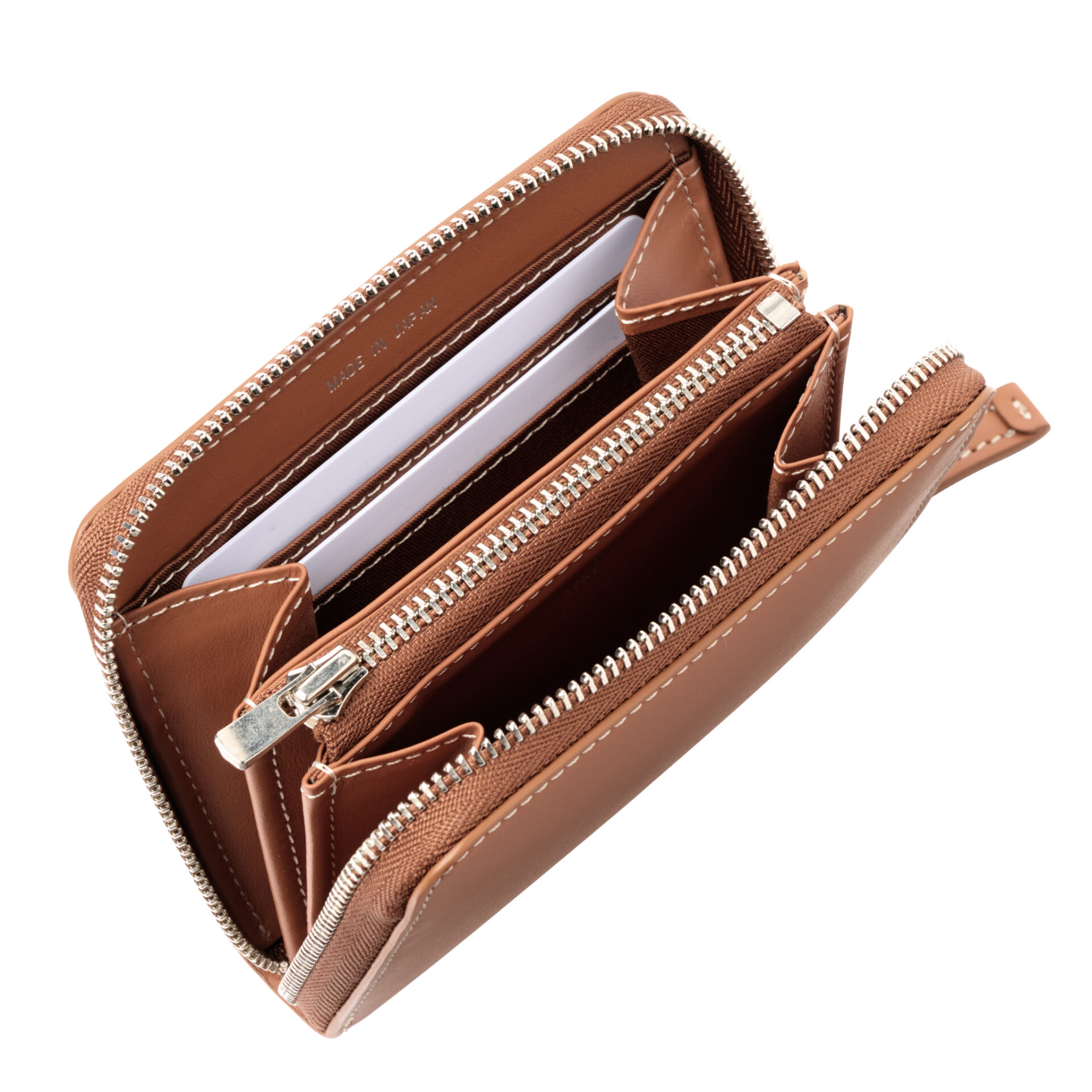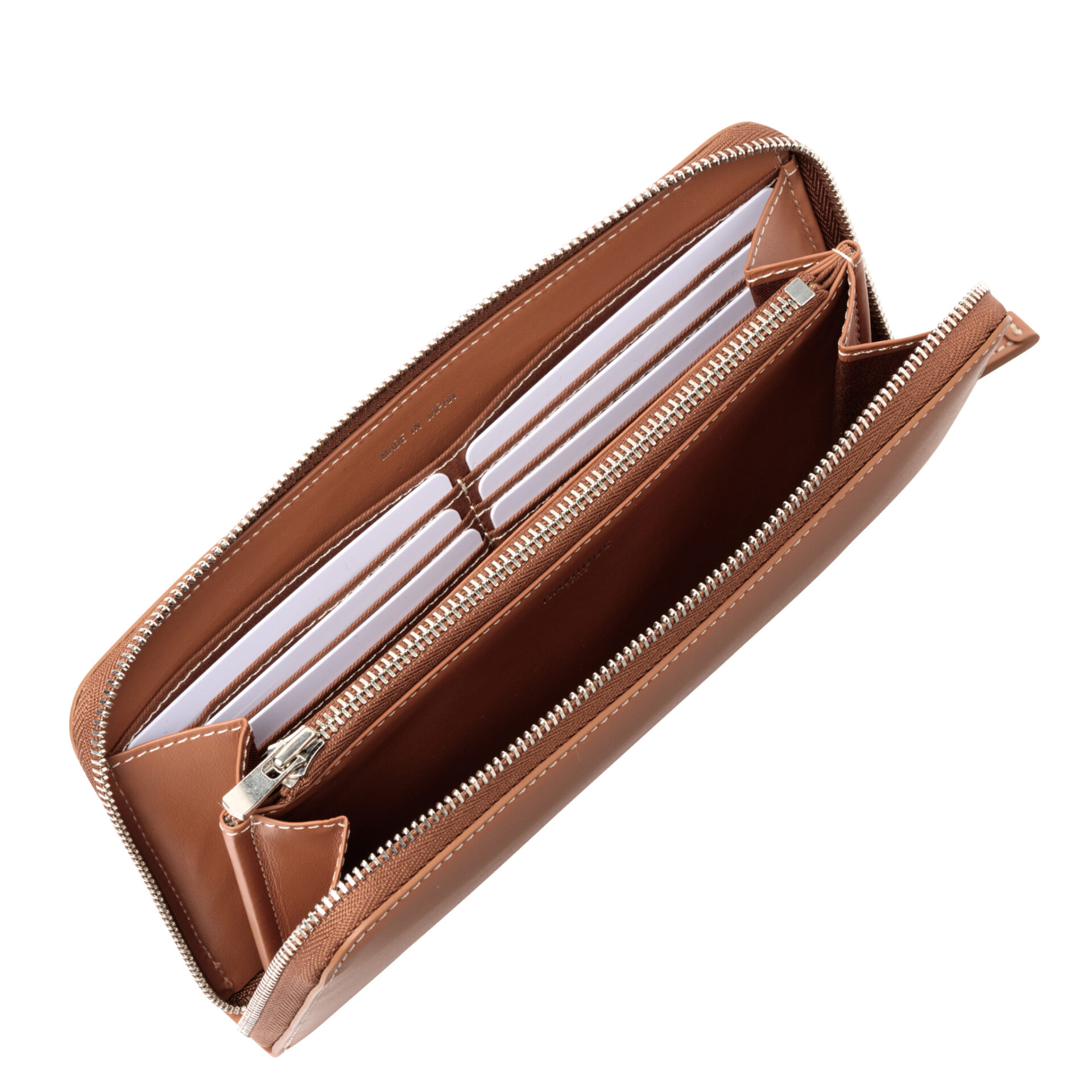 厳格な国際基準に準拠した製革業者にのみ与えられるLWG環境認証シルバーランクのタンナーが供給する、クロム・メタルフリーなめしのイタリアンレザーに、ホワイトステッチが映えるこのシリーズは、スムースレザーのしっとりとした手触りと滑らかな質感を活かしたシンプルな佇まいが特徴。ブランドロゴは内装にのみ配置され、細部に至るまでホワイトで統一されたステッチが、職人の高い技術によって均整のとれたデザインを際立たせる。