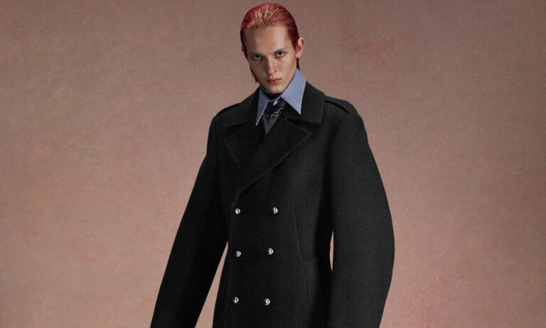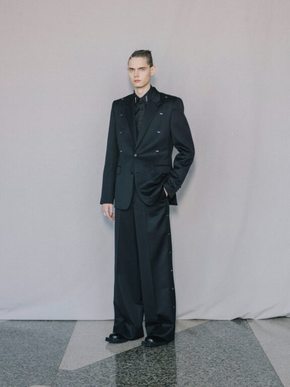 人格や服に潜む二面性を表現した本シーズンのコンセプト「DUALITY」から展開。最大の特徴はフロントの前開きを左右二箇所に共存させたフェティッシュなデザインで、ウエストバンドへミニマルに配されたJOHN LAWRENCE SULLIVANのブランドネームタグがアクセントとなる。