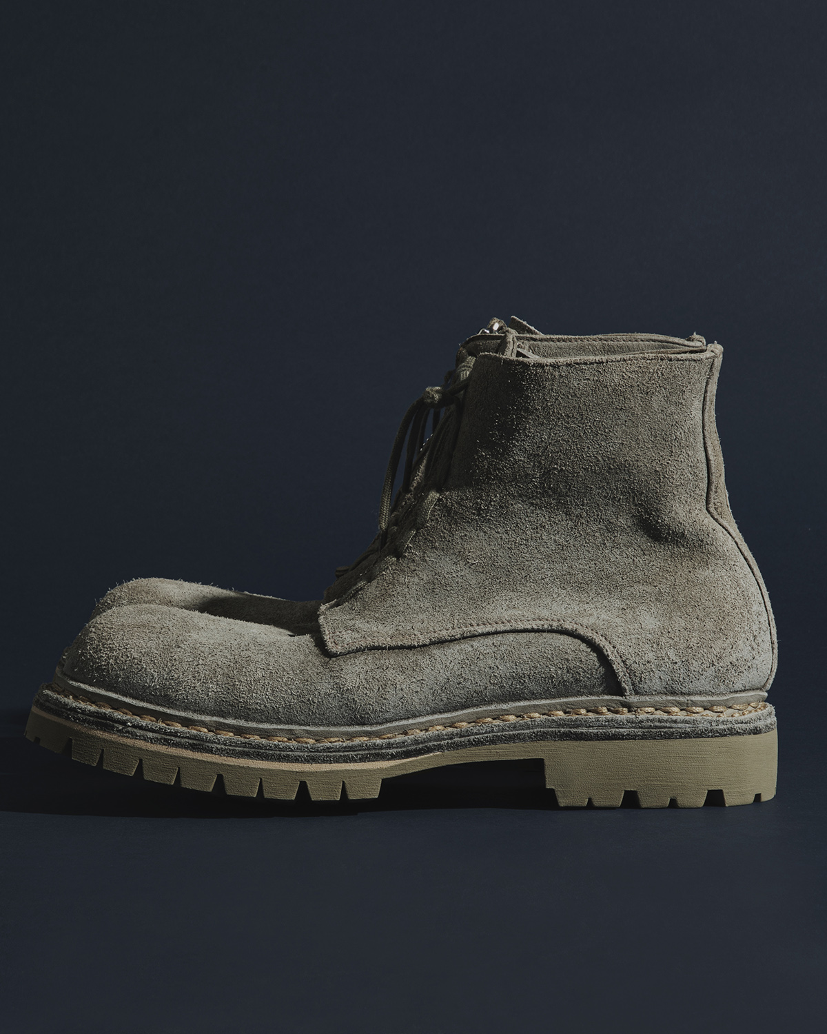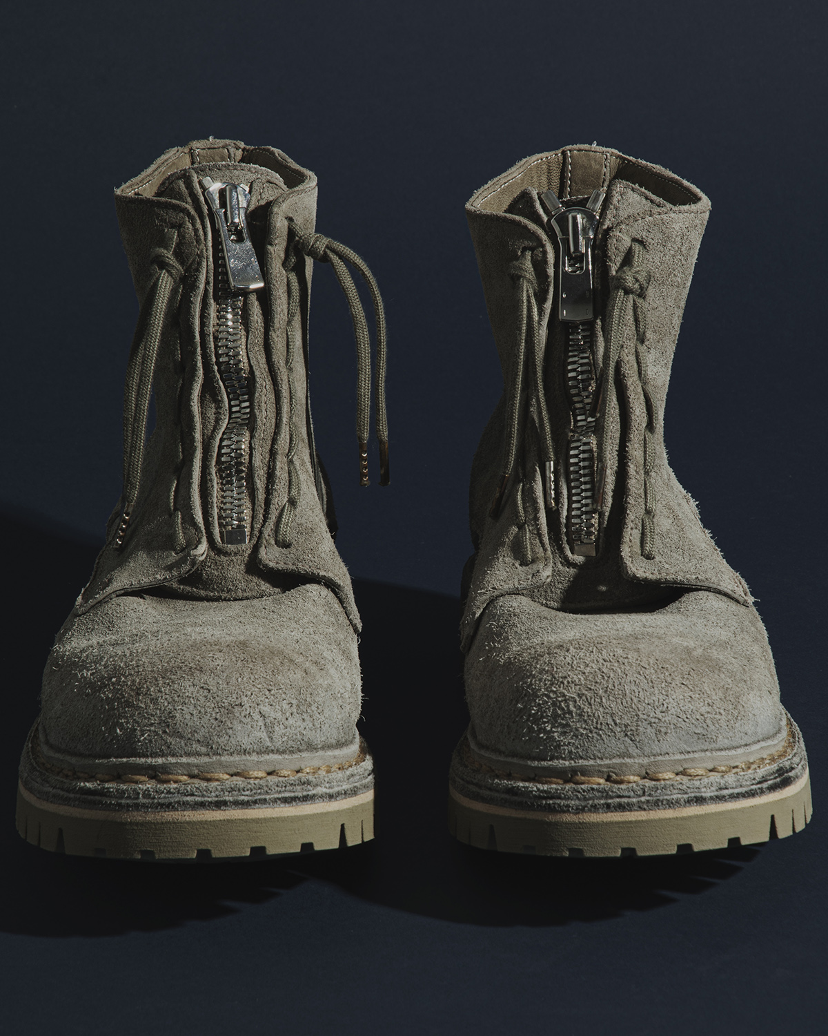 独自のフォルムが特徴的な「BIG DADDY」タイプを採用し、レースアップブーツに、ジッパーパーツを取り付けた2WAY仕様で登場。GUIDI特有の細身な木型とは対照的な、つま先にかけてボリュームをもつシルエットに。アッパー素材には「VINTAGE KHAKI」と名付けられた絶妙な色合いスエードを採用し、それに合わせて色出しされた、同色のVibram®アウトソールも本モデルのためだけに作られたスペシャル仕様。