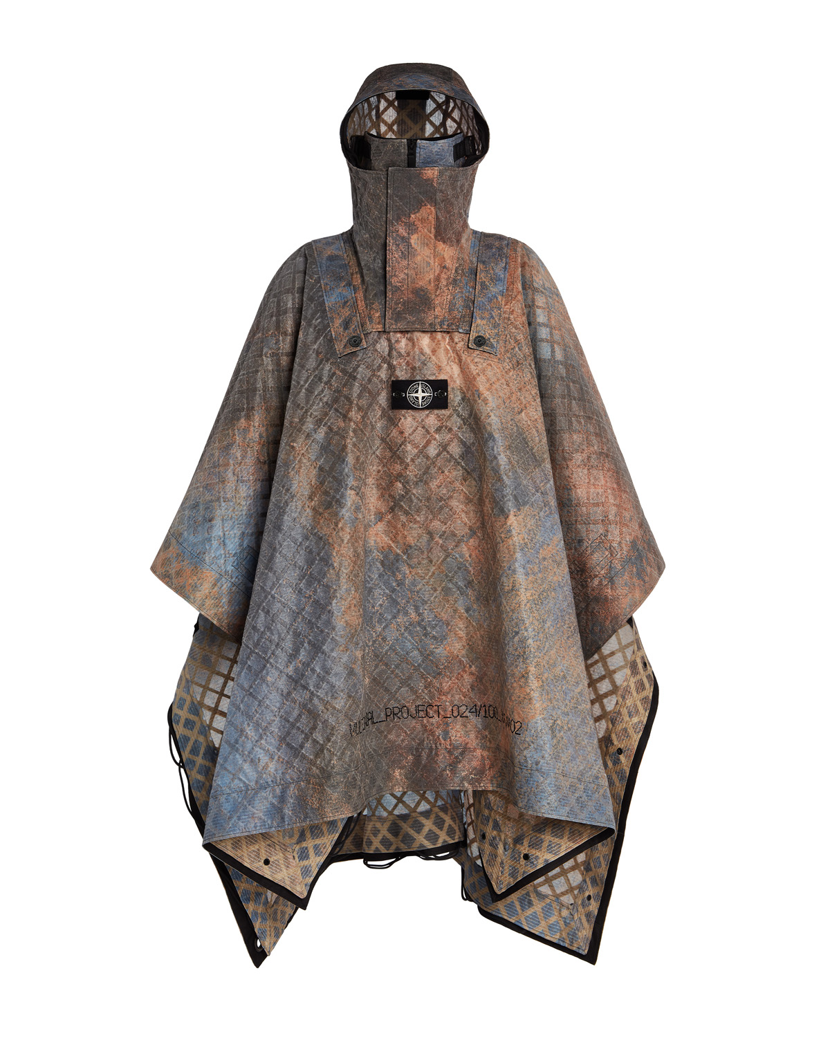 ファブリックは自動車、ボート、スポーツ分野向けに開発され、高度な工業技術を応用して製作。製造工程では天然の補強材として多軸構造のリネン織物をベースに採用。それにニードルパンチで極薄の不織布を結合させ、顔料を用いた最新のインクジェットプリントを施し、脂肪族系ポリウレタンのフィルムを二重にラミネート。ケープのスタイルはSTONE ISLANDが1982年に発表した初のコレクション「Tela Stella」に着想しており、テントにも変身するミリタリーウェアの機能性を参考にした。