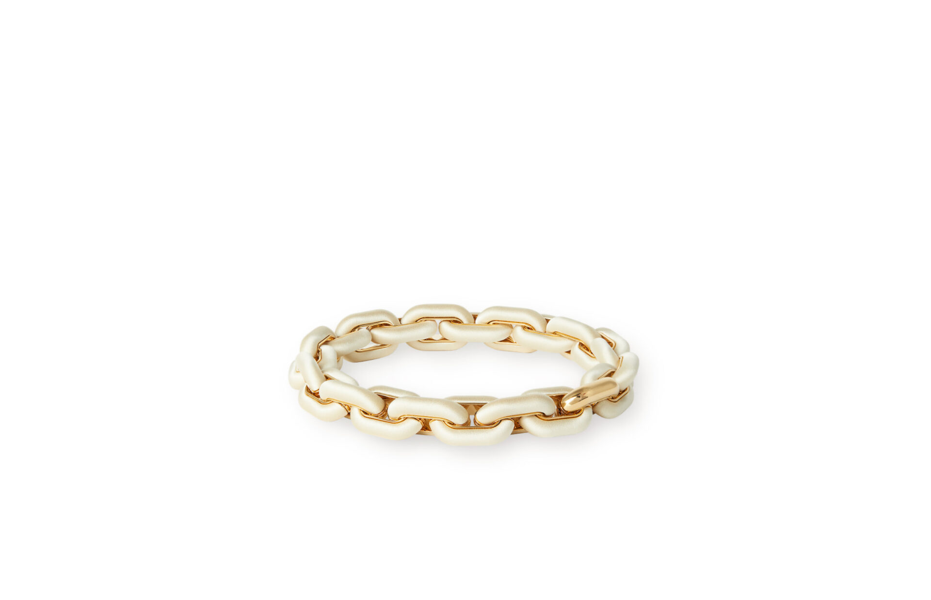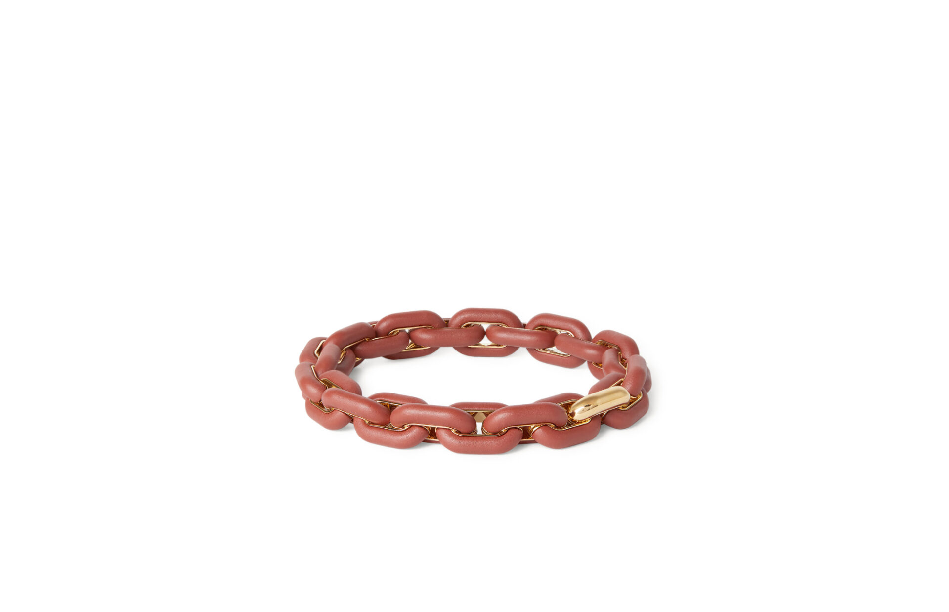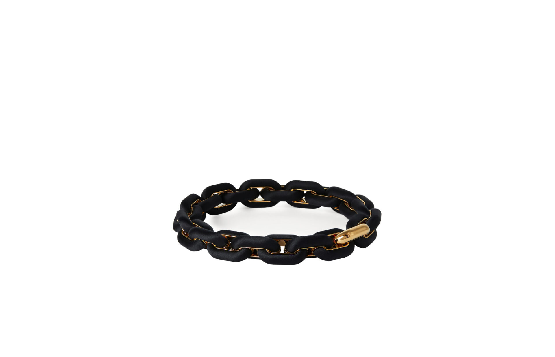 大胆なチェーンネックレス、イヤリング、ブレスレットのコレクション「デュオ」は、メタルとレザーの調和のとれた融合を卓越した職人技で表現。コスチュームジュエリーは、タイムレスなデザインと独創性を兼ね備え、メゾンの洗練された伝統を新たな方法で表現し、ブラック、 シャンパン、そしてメゾンのシグネチャーカラーであるディープクンメルで彩った。