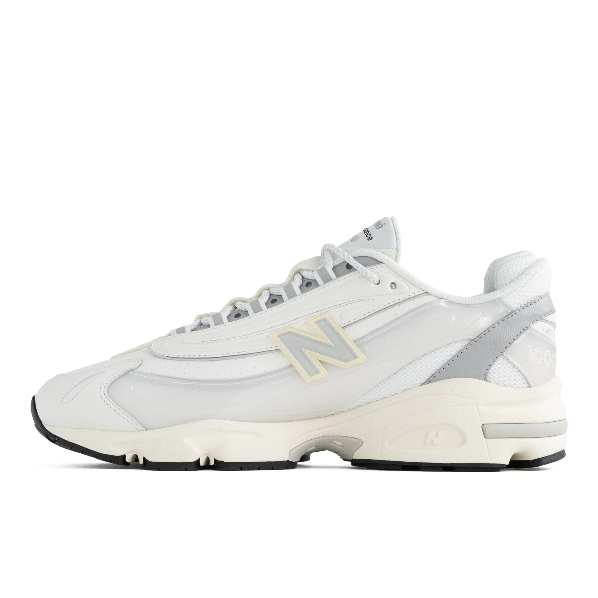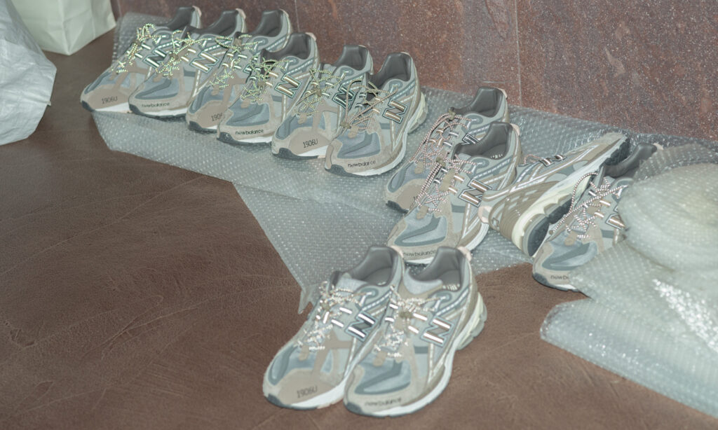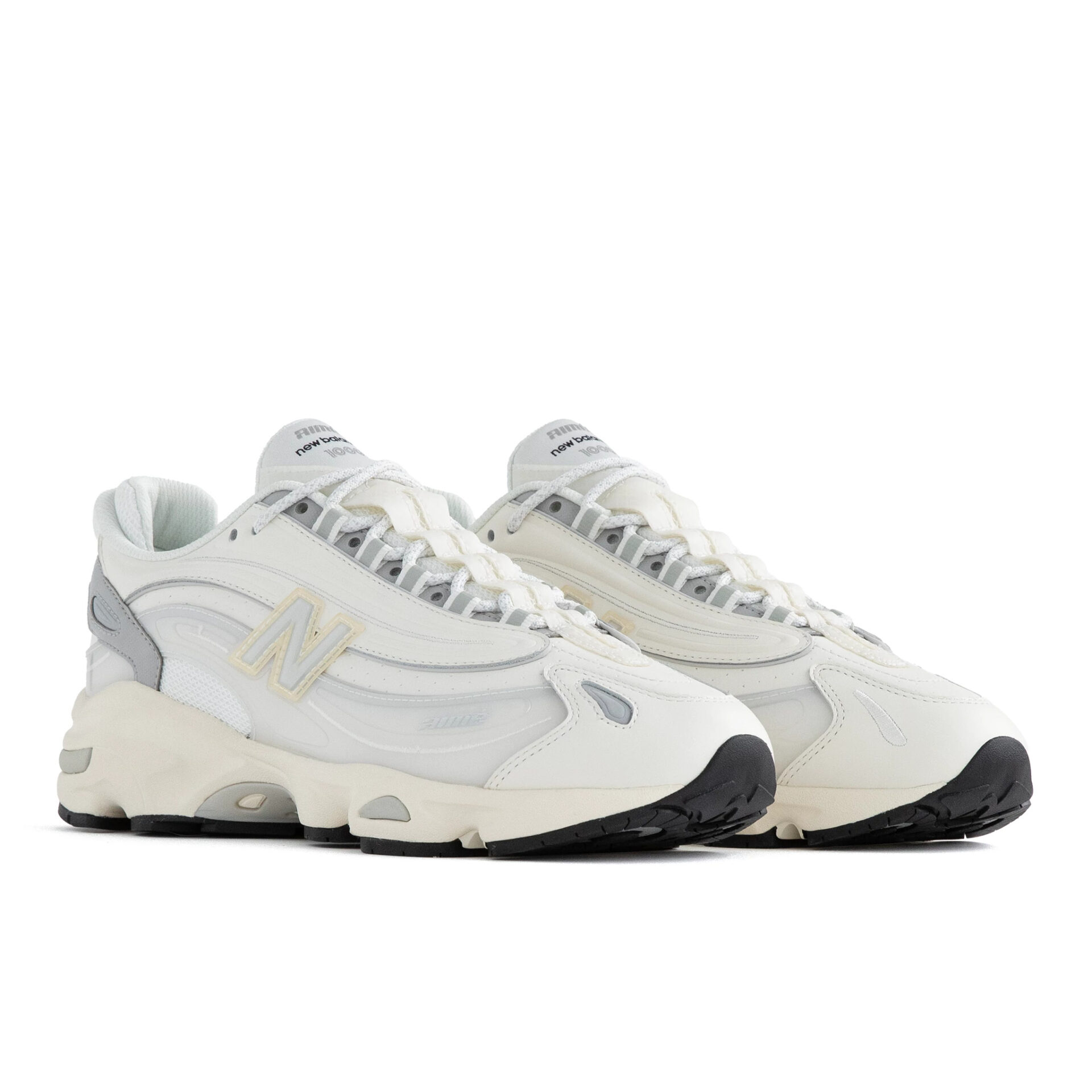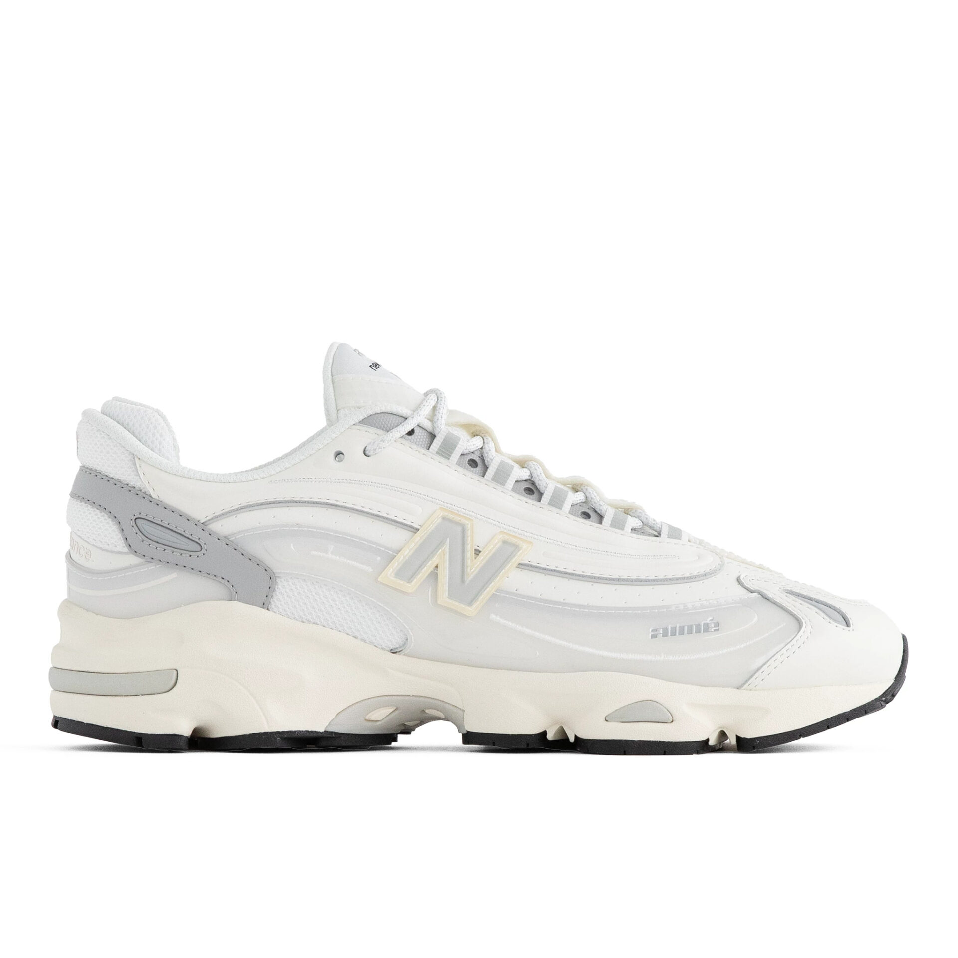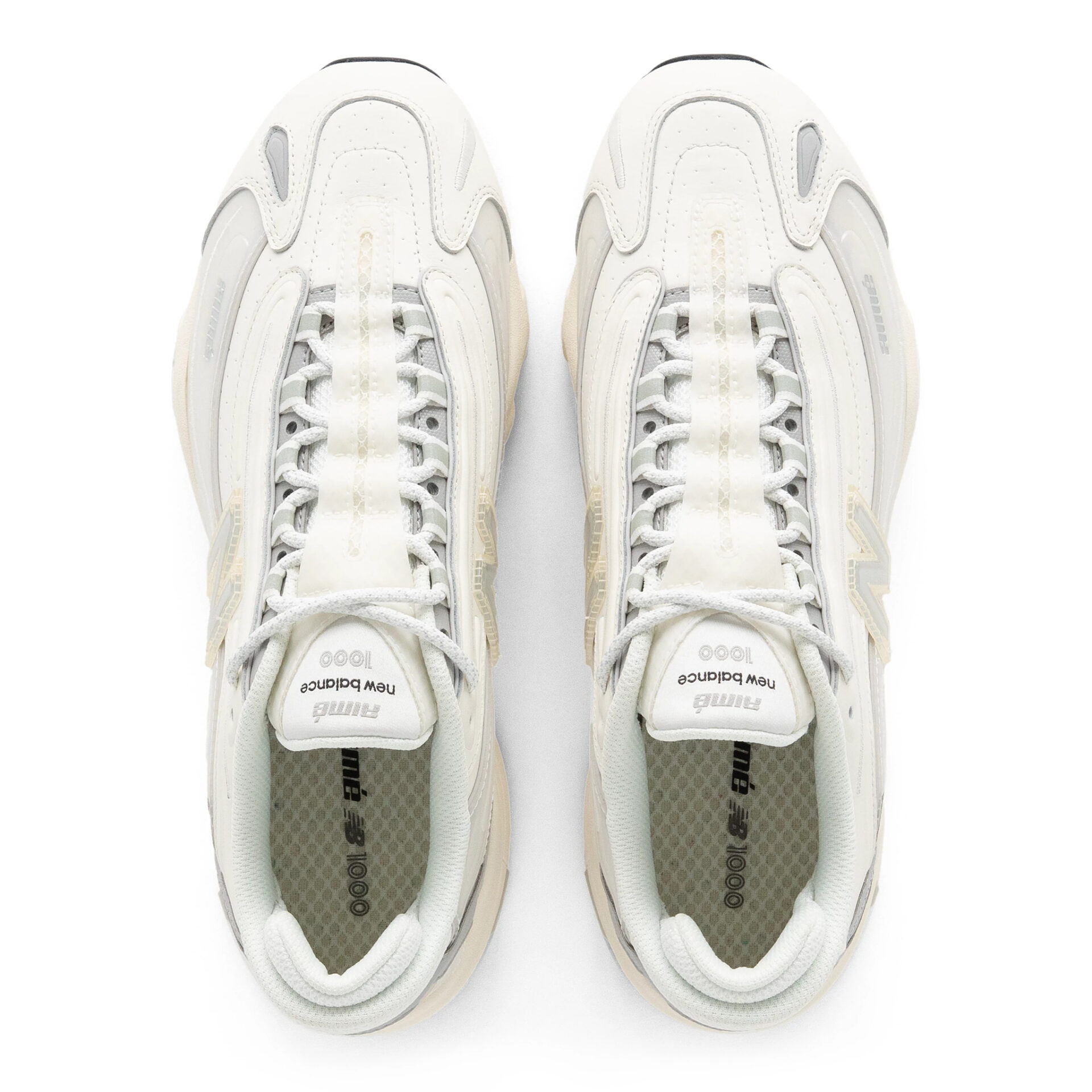 オリジナルは、1999年にリリースしたパフォーマンスランニングシューズ「New Balance 1000」。90年代後半のランニングシューズ市場で人気を博したチャンキーなシルエットと多色使いのカラーリングで、スリークなシルエットにウェービーなアッパーを合わせた、ユースカルチャーを想起させるデザインが特徴。ALDとのコラボモデルでは、「ABZORB」クッションをヒールと前足部に配置した分割ソールユニットと、 ミッドフットシャンクのスタビリティウェブを備えた。アッパーにはクリーンな白のパーフォレートレザーを配し、メッシュのアンダーレイ、リフレクティブのディテール、刺繍と型押しの「aimé」ブランディングをアクセントに加えている。