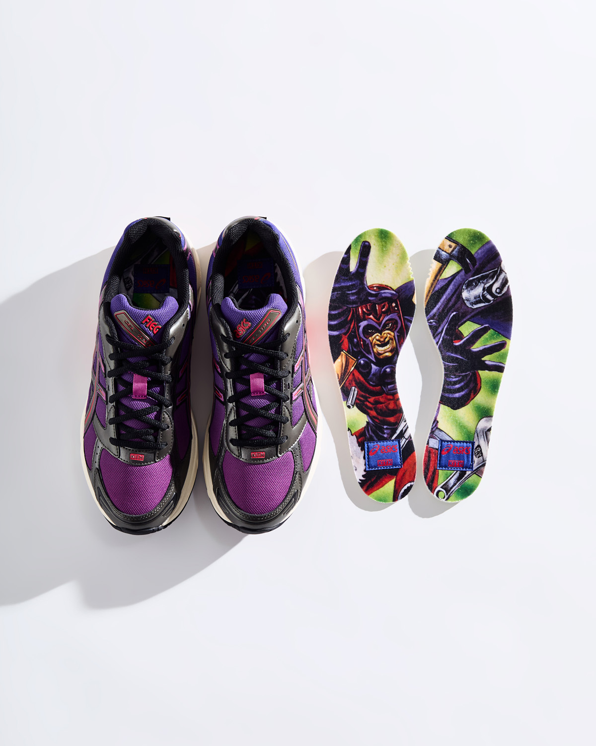 Magnetoには、展開するフットウェアで唯一1130モデルを採用。メッシュアッパーにレザーオーバーレイを組み合わせ、アイステイとソックライナーにはKithのブランディングをあしらい、ヒールには特別なMarvelラベルがデザインされている。