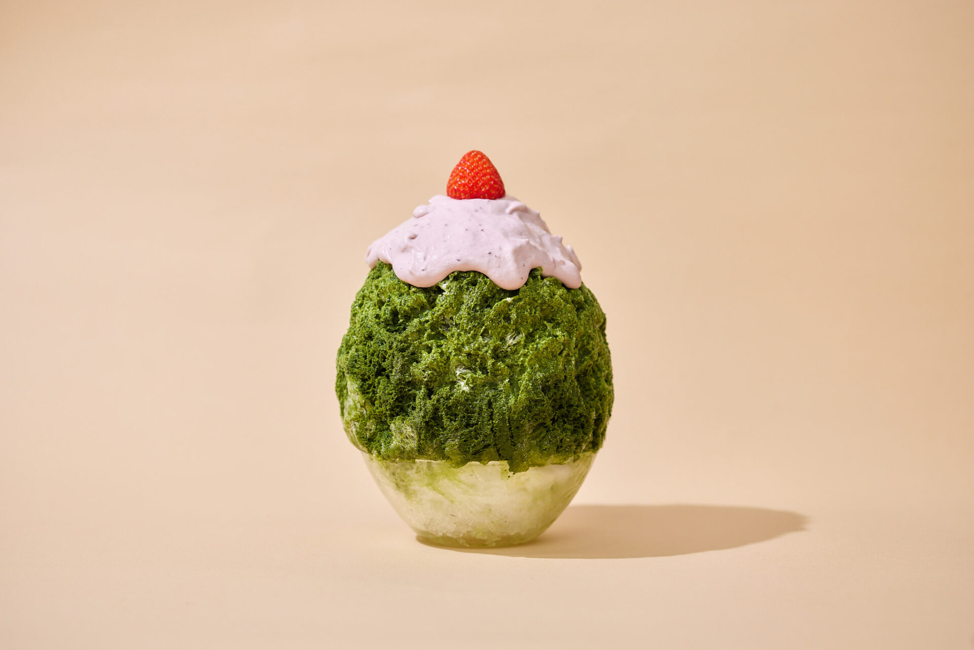 厳選された福岡県産の八女抹茶を使用した深みのあるソースをベースに、抹茶のほろ苦さを包み込むまろやかなアーモンドチョコクリームと自家製のソイ・ストロベリークリームを掛け合わせ、トッピングに和の趣を引き立てる青シソをポン菓子を加えた深みのあるフレーバー。動物性原料は一切使用していない。