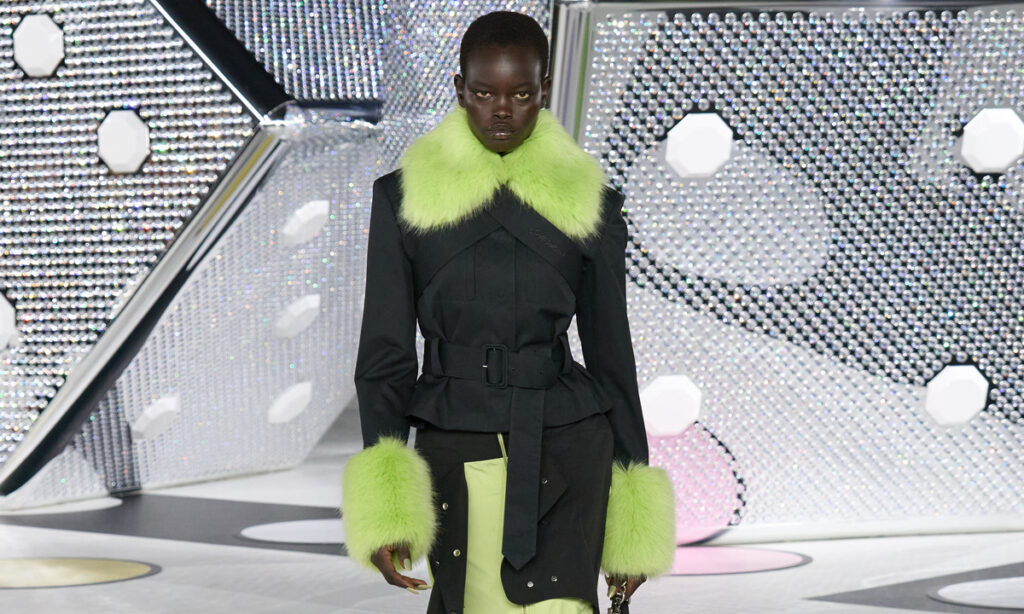 メンズウェアとウィメンズウェアは同じ激しさを共有し、アクア、パープル、レッドでアクセントを付けたニュートラルなパレット、バーシティやボンバーなどの形状への同じ焦点、新しいサンドバッグでさえ、共通のものをひっくり返したアイデアを共有。ウィメンズでは、建築的なカットが体を彫刻し、スポーツウェアを思い起こさせる⽅法で肩とバストの輪郭を整える。ジャージとフルーがミックスし、トラックスーツジャケットはペプラム構造で設計され、ジップアップの仕⽴ては厳格で魅惑的になった。