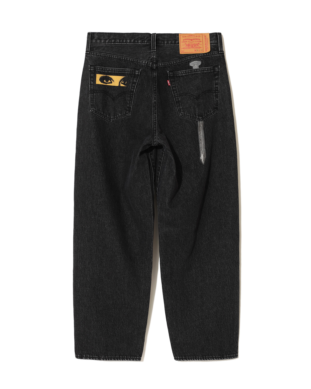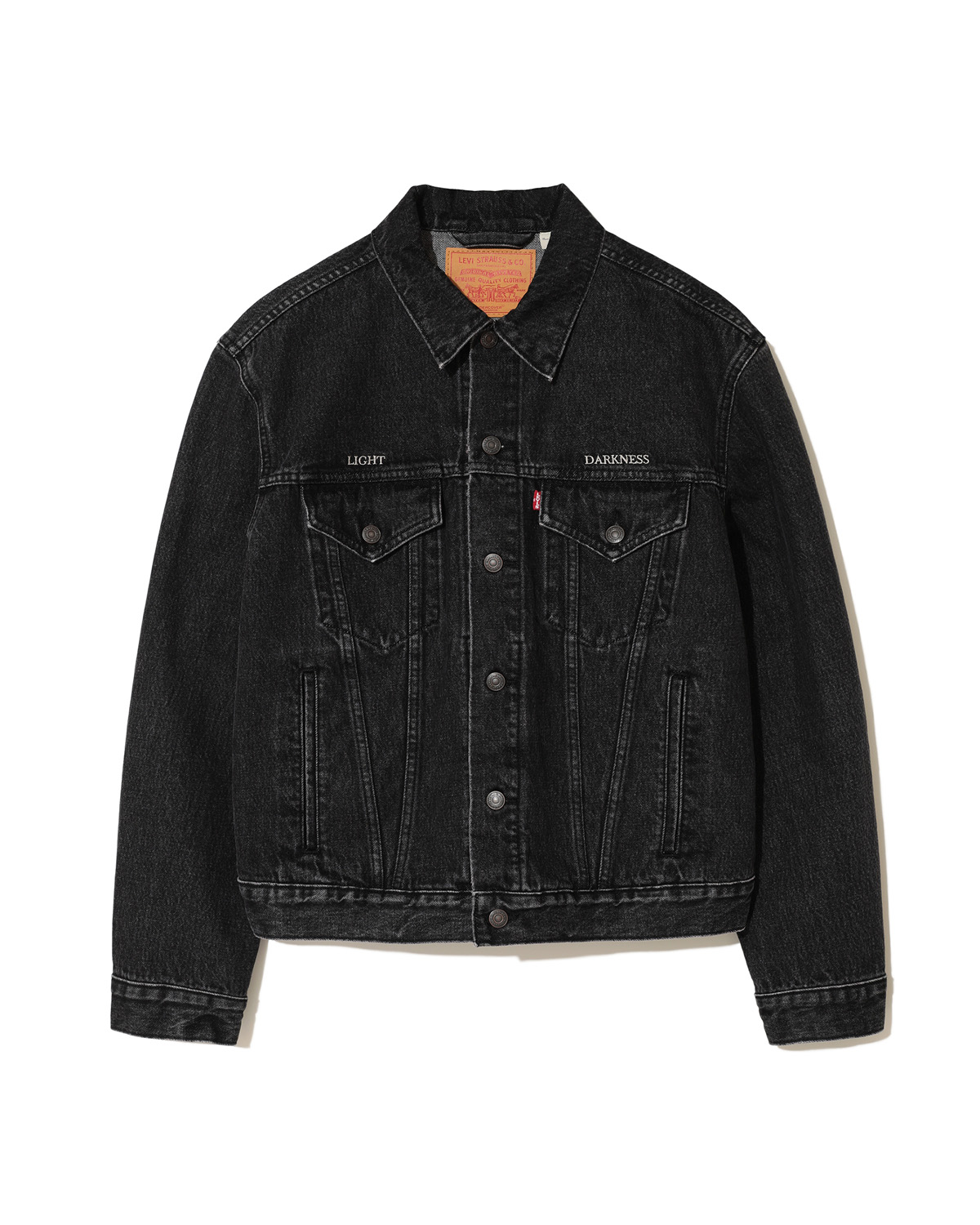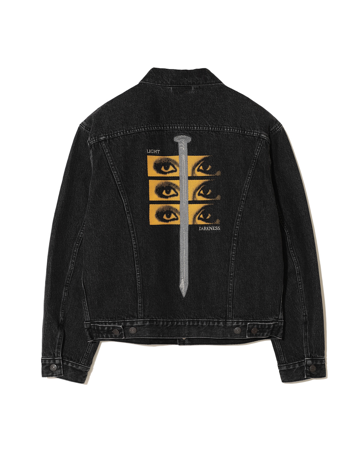 今回のコレクションのために新たにデザインしたグラフィックを採用した「TYPE III TRUCKER JACKET」と「BAGGY JEAN」。ジャケットの背面にはスクリーンプリントと刺繍を組み合わせ、胸元には「LIGHT」と「DARKNESS」の刺繍を施した。「BAGGY JEAN」にも同じグラフィックをあしらった。