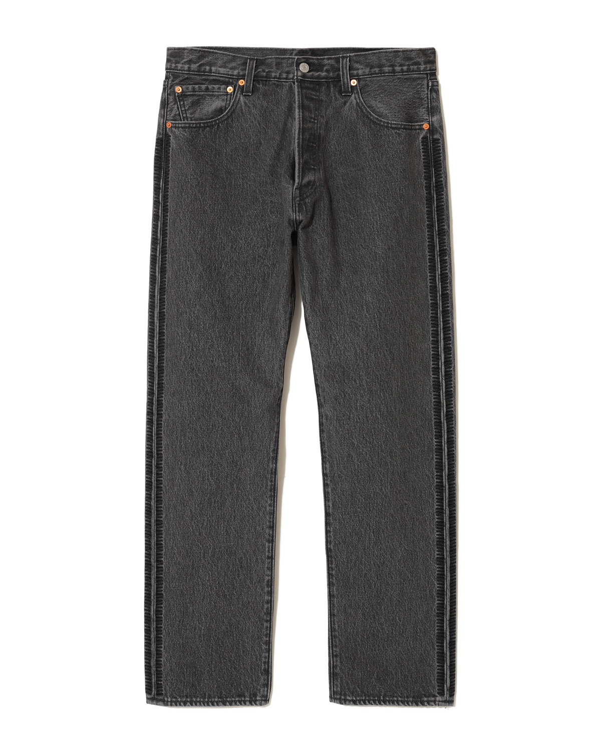 「TYPE I TRUCKER JACKET」は、ブラックとホワイトの12oz.デニムを使用し、アーカイブから着想したトライアングル柄の刺繍が特徴。袖と裾に施されたジオメトリックなデザインは、2003年春夏コレクションのグラフィックを反映し、クラシックな「501® Jean」のサイドシームにも同様の刺繍が加えられている。
