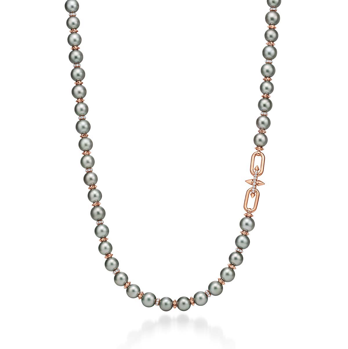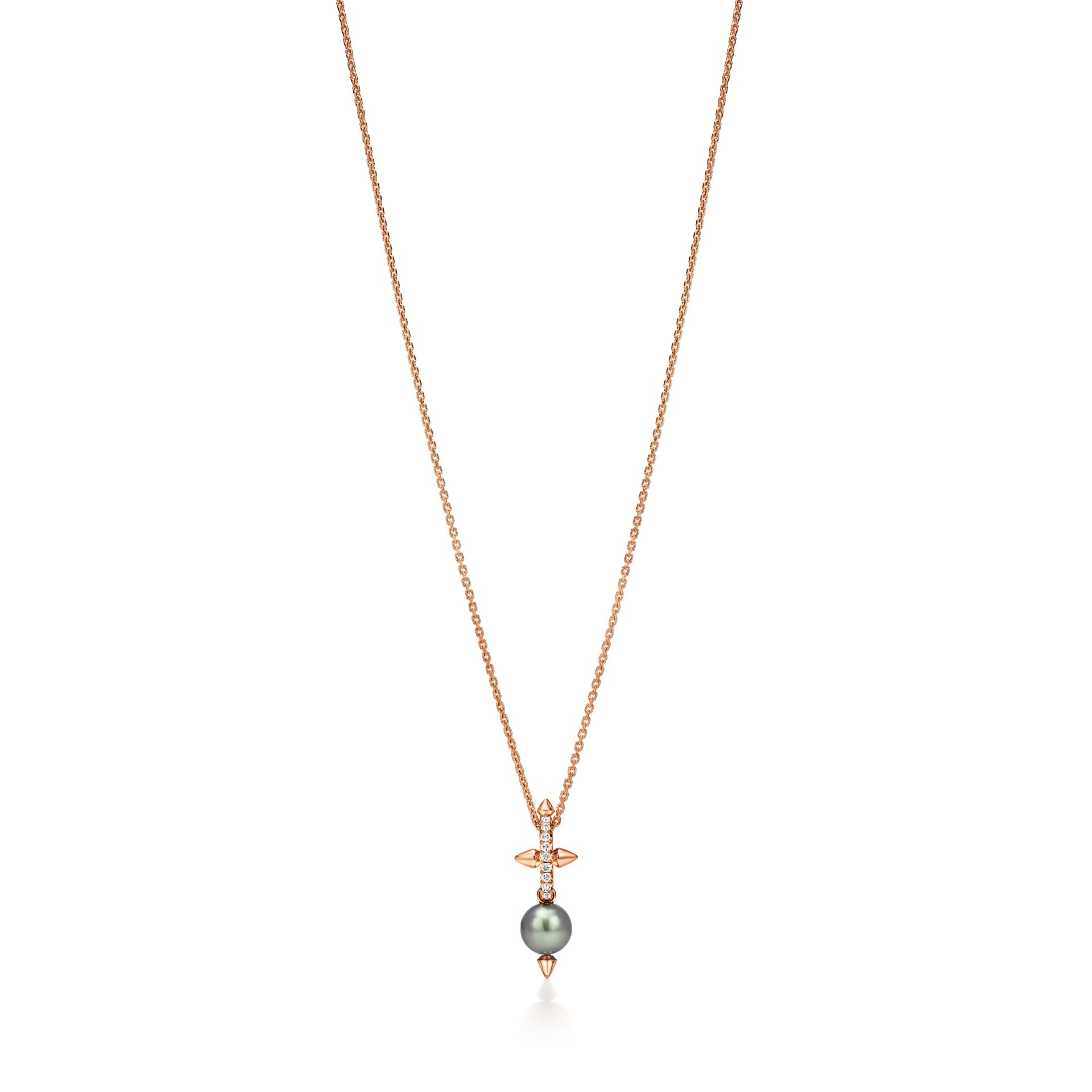 ファレルのルーツである米バージニア・ビーチと、神話の神ポセイドンが持つトライデント(三叉槍)を着想源に、革新的なダイヤモンドのセッティング技術を落とし込んだ本コレクション。深みと艶やかな輝きをあわせ持つダークなタヒチアン パールと、18Kゴールドやパヴェ ダイヤモンドを組み合わせたペンダント、ピアス、ネックレス、ブレスレット、リングが揃い、スピア(槍)のモチーフが随所に施され、ローズゴールドの金具がパールの存在感を引き立てる。