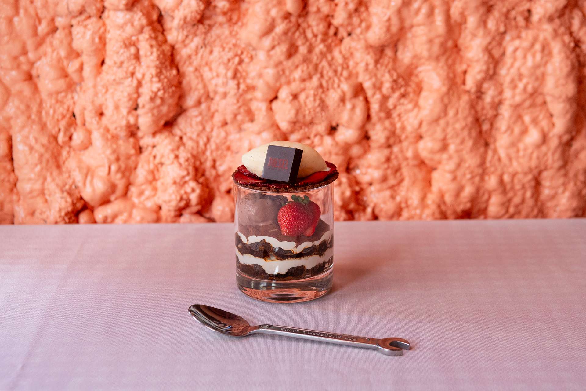 DIESEL SHIBUYAの1階に併設される「Cucina Diesel Farm」とDARCISの初コラボメニューでは、シグネチャーデザート「ティラミス」をベースにしたパフェが登場。旬のいちごやアイスクリームをトッピングし、DIESELのロゴが施されたダルシーのダークチョコレートコーティングの伝統的なヘーゼルナッツプラリネ「プラリネランシェンヌ」が添えられる。