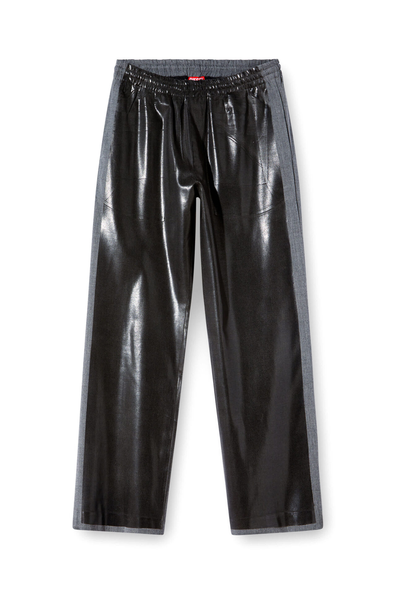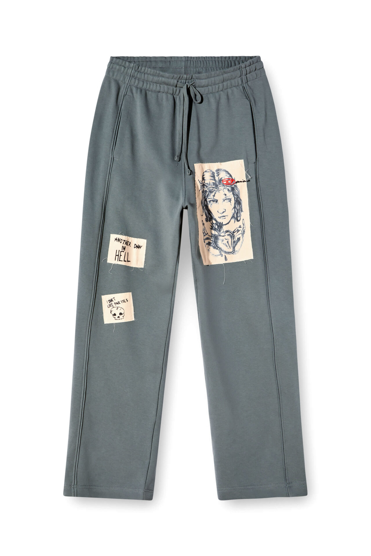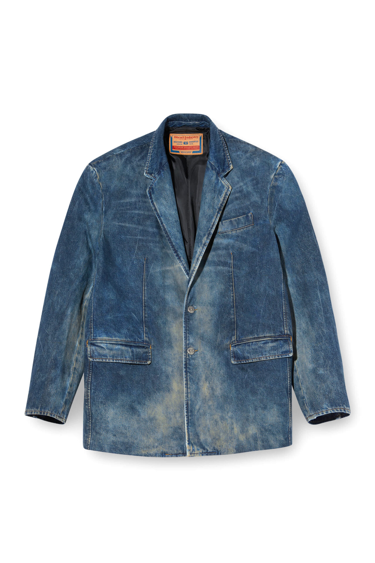 DIESELの特徴的なフォントで「Damiano」の文字が刺繍されたバーンアウトのジャージトップスや、ドローストリングでウルトラワイドレッグのパンツは、バーナーで焼いたかのような仕上がりに。デニム素材を採用したオーバーサイズのスーツやカーゴパンツに加え、コーティング・ウールのスーツも登場。ダミアーノのタトゥーに着想したプリントやパッチワークが施されたアイテムは、彼のパーソナルな一面を色濃く反映。ダミアーノが「BoF 500」ガラで着用したブラックのコーティングスーツや、DIESEL 2025年春夏ランウェイショーで披露したブラックケープにも注目。