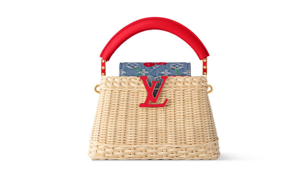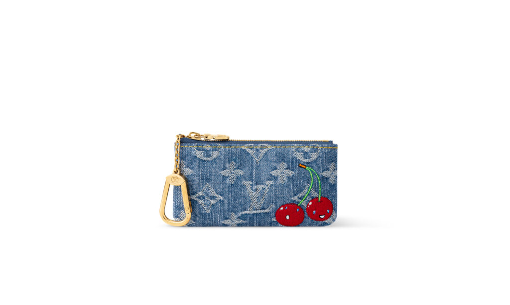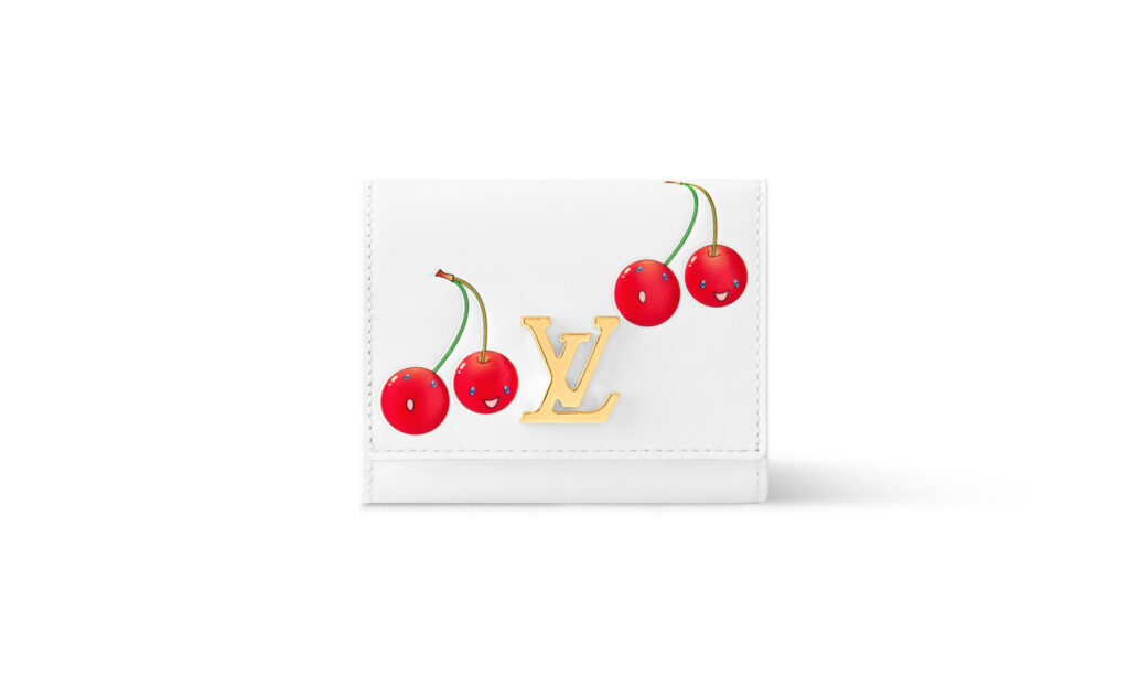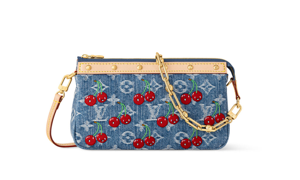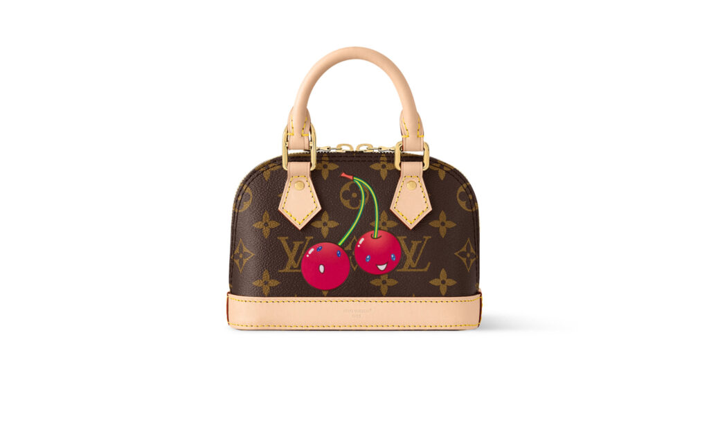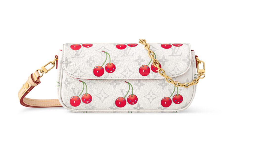 全70型以上で構成される今回は、村上を象徴する笑顔のチェリー・モチーフがフィーチャーされ、ブランドの定番アイテムに再びユニークな彩りを添えている。バッグやシューズには、最先端の応用技術や複雑な工程を要するシルクスクリーンの技法を駆使し、チェリーのモチーフを精緻に再現。ヒールや留め具、引き手など細部にまで遊び心が散りばめられている。注目は、新たに登場する「モノグラム・チェリー キャンバス」。クリーンなホワイトの地に3Dプリントを施し、鮮やかなチェリーのアイコンが映えるデザインに。「カプシーヌ」シリーズでは、チェーンにぶら下がるメタリックなチェリーや、さりげなく配されたモチーフがデザインのアクセントに。また、「ポシェット・アクセソワール」や「サンセット」、「キーポル 45」などのブルーデニムアイテムにはチェリーの刺繍を施し、スペシャルエディションならではの仕上がりに。