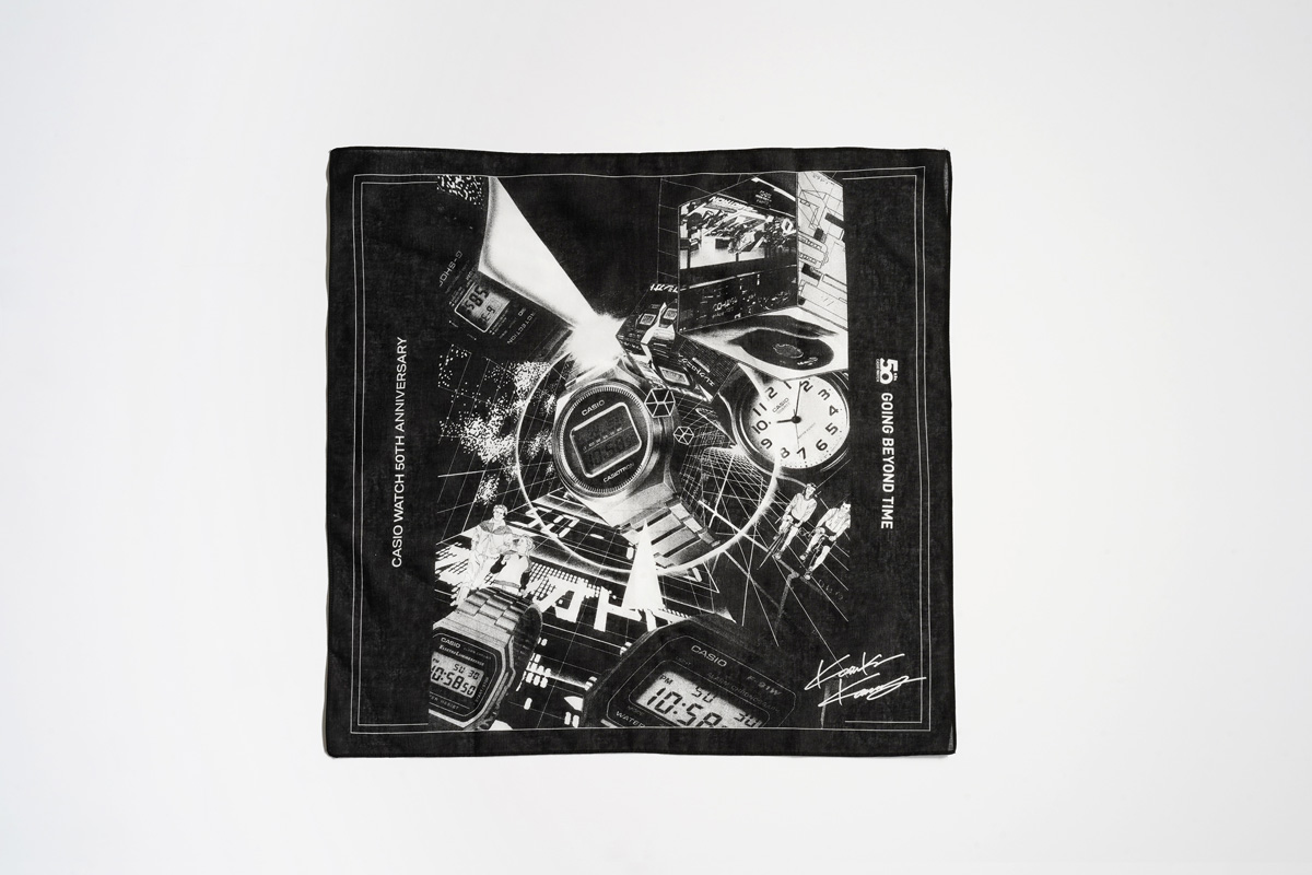50周年を記念し作成したアートワークの原画や、特別映像、歴代カシオウォッチを展示。アートワークは、コラージュアーティスト、グラフィックデザイナー、アートディレクターとして様々な分野で活躍する河村康輔が担当。復刻モデルCASIOTRON「TRN-50」とG-SHOCK初代モデル「DW- 5000C」、軽量・薄型のデジタル液晶モデル「F-91W」、3針タイプの「MQ-24」、メタルバンドが特徴的な「A168」が組み込まれ、過去の広告ビジュアルや貴重な資料も随所に散りばめられたアートワークに仕上がっている。また、アートワークを「持って帰れるアート」として、BOX型に落とし込み、来場者様へ先着でプレゼント。BOXの中にはアートワークをあしらったTシャツやバンダナ、ステッカーなど、ここでしか手に入れられないスペシャルなアイテムがランダムで入っている。