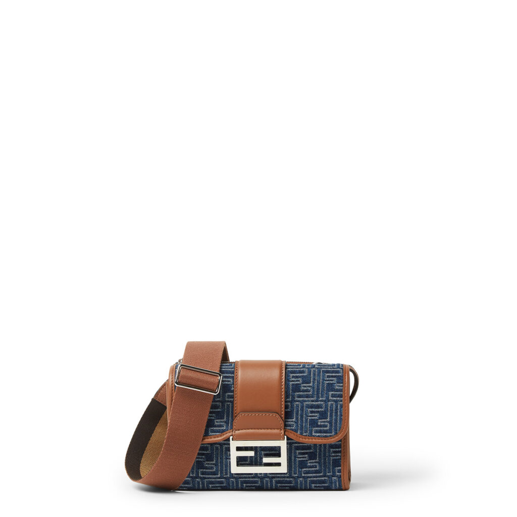 ブルーデニム風の「FF」ロゴジャカードをまとい、クラシックなシルエットに繊細な織り柄と上質な素材感が映える。四角いフラップに「FF」ロゴマグネットクラスプを配したコンパートメントと、ジップ付きコンパートメントの2層構造。内側はライニング仕様で、ブラウンレザーのディテールやパラジウム仕上げのメタルパーツが上品なアクセントに。ブラウンの「FENDI」ロゴ入りのテクニカルファブリックストラップは長さ調節が可能で、クロスボディにもショルダーにも対応する。