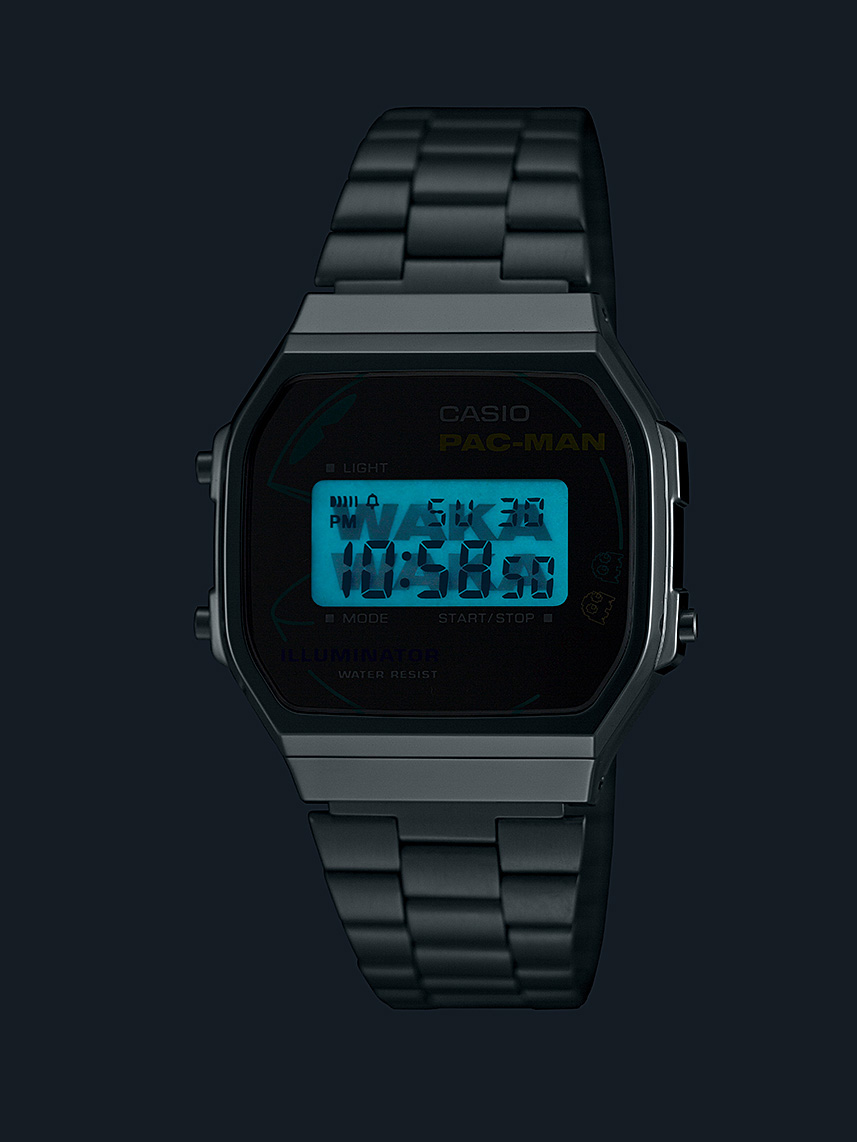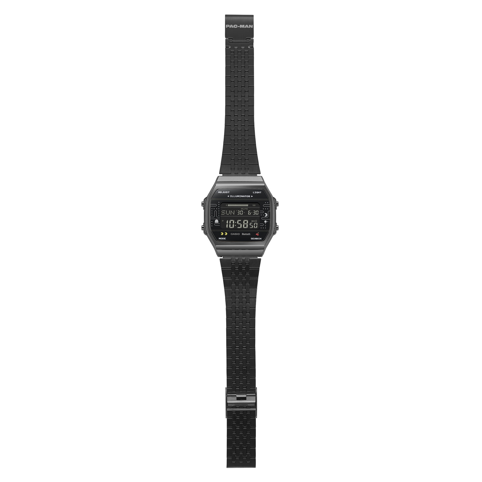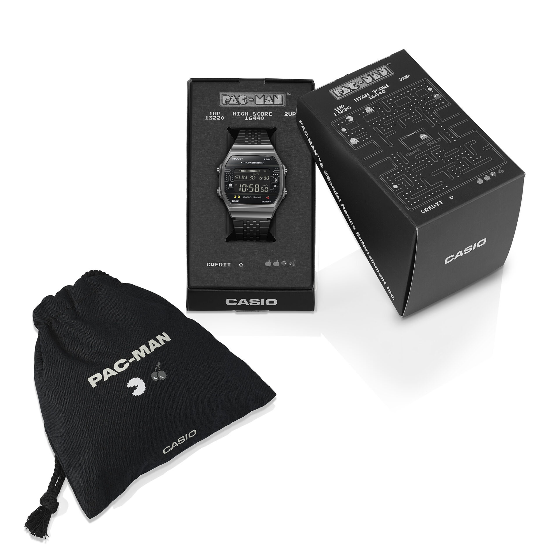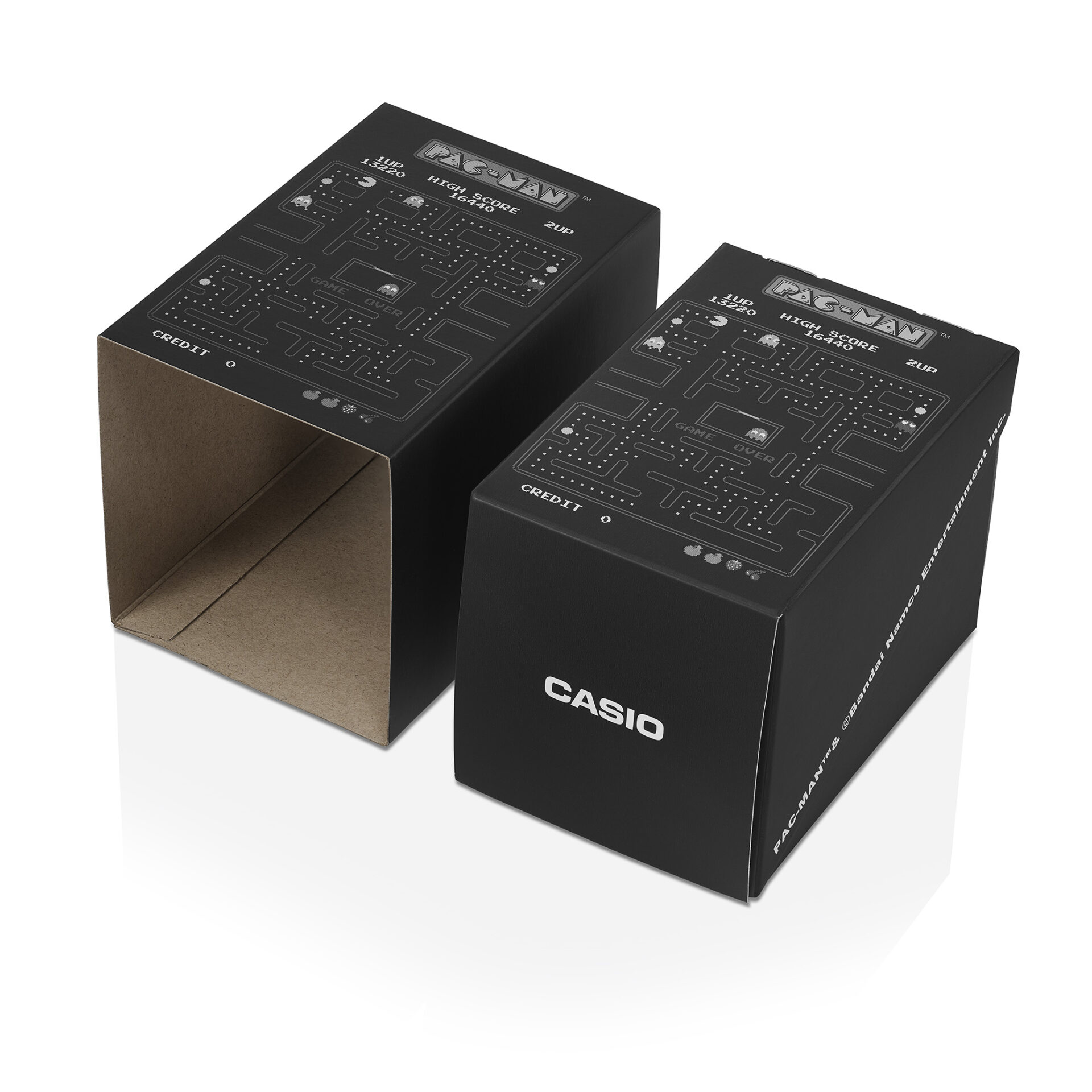 「ABL-100WEPC」「CA-53WPC」は、時計のフェイスをゲームステージに見立て、お馴染みのキャラクターが駆け回るゲーム画面を表現。「ABL-100WEPC」はモノクロ版のゲーム画面をイメージし、ブラックを基調とした配色を施し、中留カバーには「PAC-MAN」 の文字を刻印。「CA-53WPC」はアーケード筐体をモチーフにしたイエローをベ ゼルに採用。全てのモデルの裏蓋には「パックマン」のキャラクターとロゴを刻印したほか、それぞれのモデルで異なるスペシャルパッケージを用意するなど、「パックマン」とのコラボウォッチにふさわしいモデルに仕上がった。