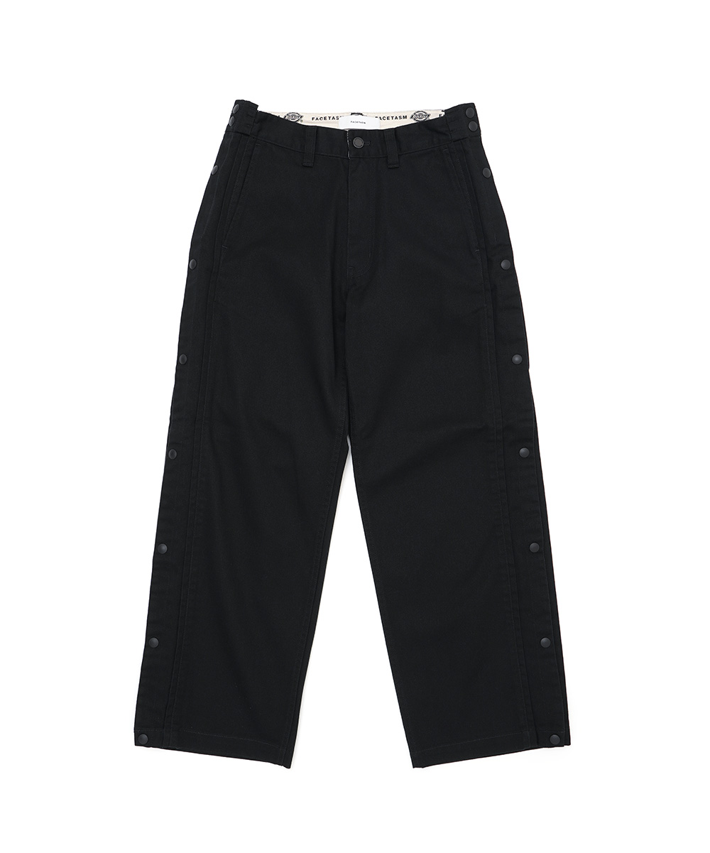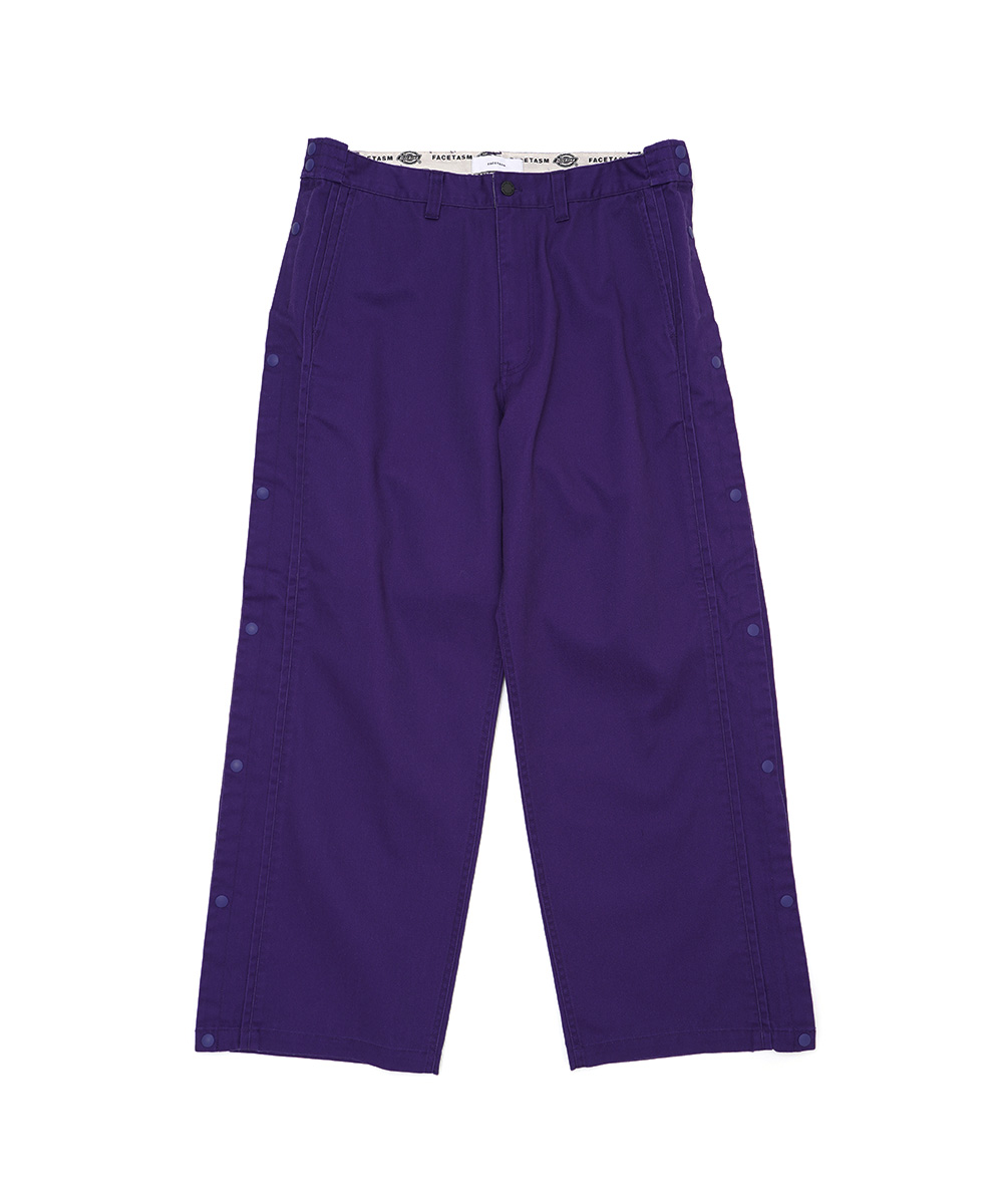 「FACETASM x DICKIES 7BAR STADIUM JACKET」は、シップアップスタイルのスタジアムジャケットにFACETASM定番の「7BAR」を大胆にプリント。左袖口にある”Facetasm”と記したサガラ刺繍ワッペンが特徴。ジャケットとセットアップ着用も可能な「FACETASM x DICKIES BASKETBALL PANTS」は、両サイドのウエストから裾までに配したスナップボタンを開閉することにより様々なシルエットやレイヤードスタイルを楽しめる。