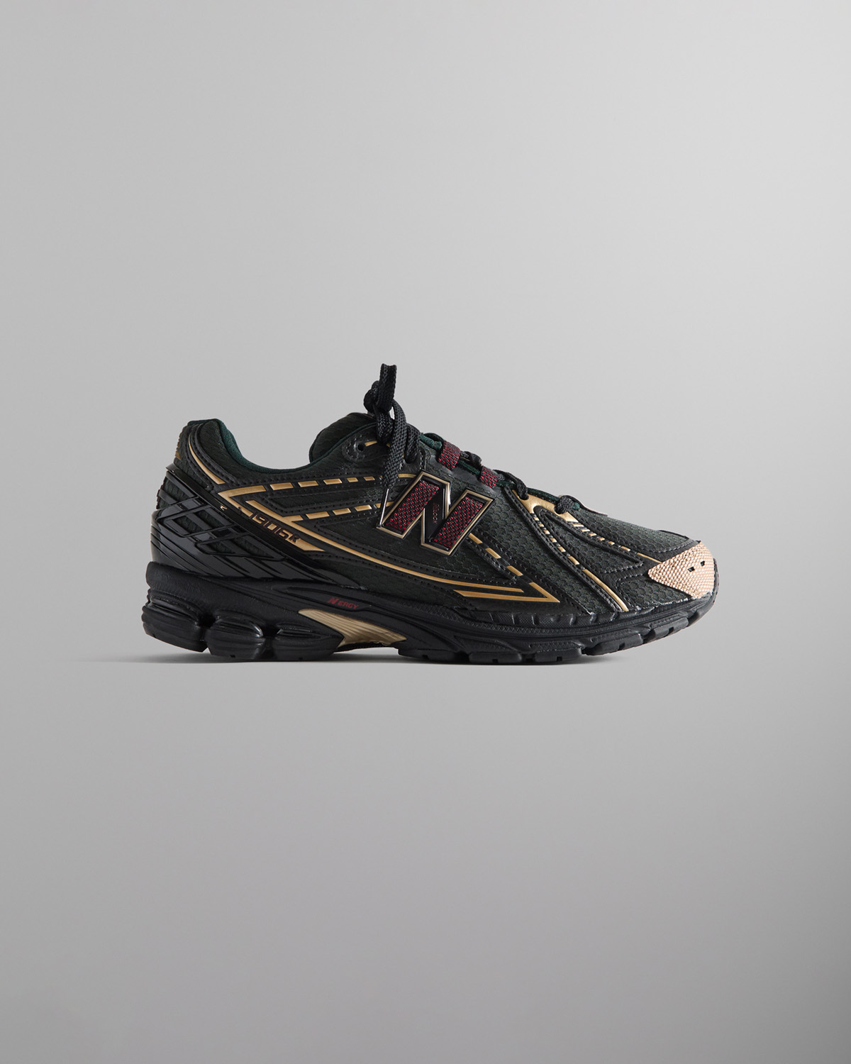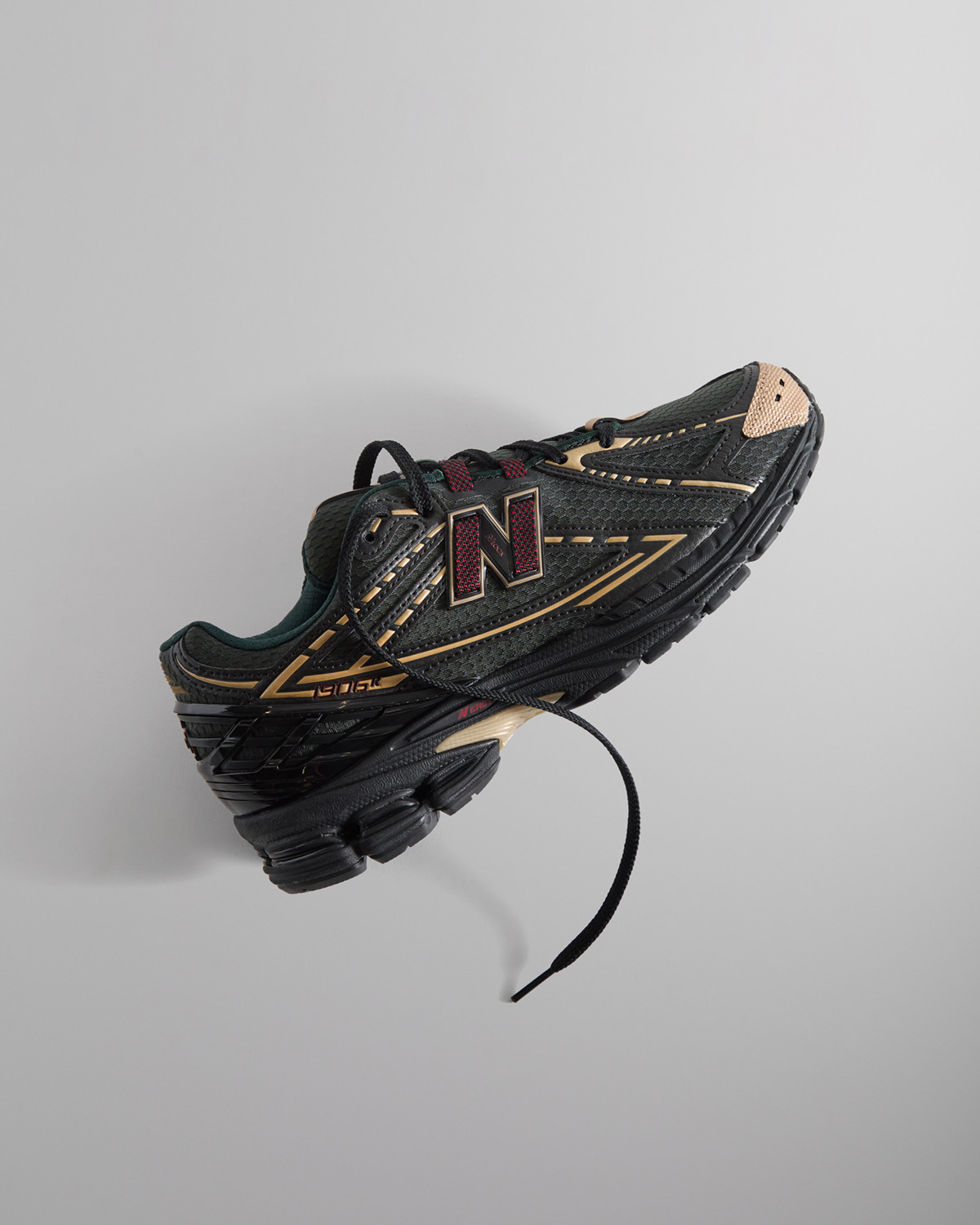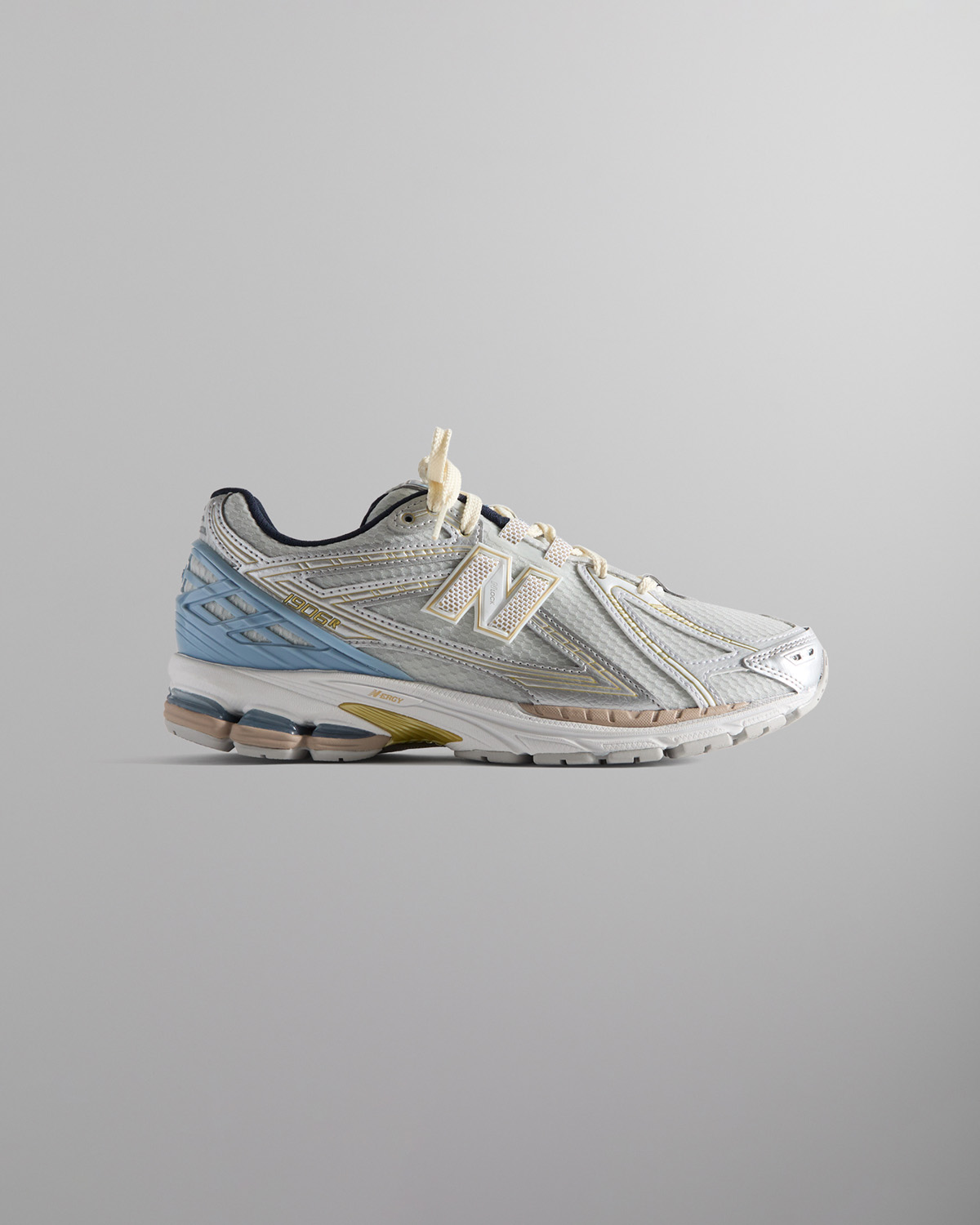 メッシュアッパーにシンセティックレザーのオーバーレイとメタリックのトゥーキャップが特徴。共同ブランディングの要素が随所に取り入れられ、タンとソックライナーにはKITHのロゴを、側面とヒールにはNew Balanceのブランディングを施している。