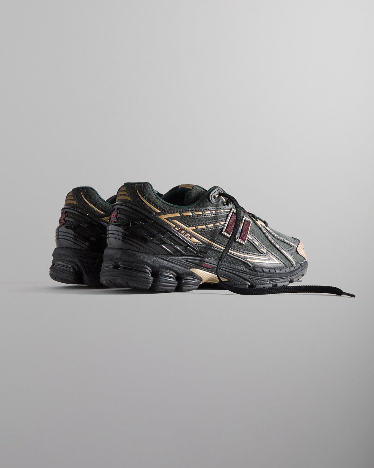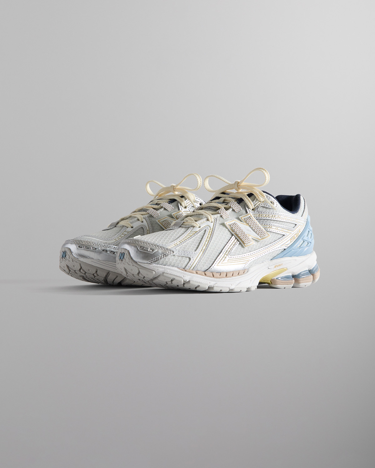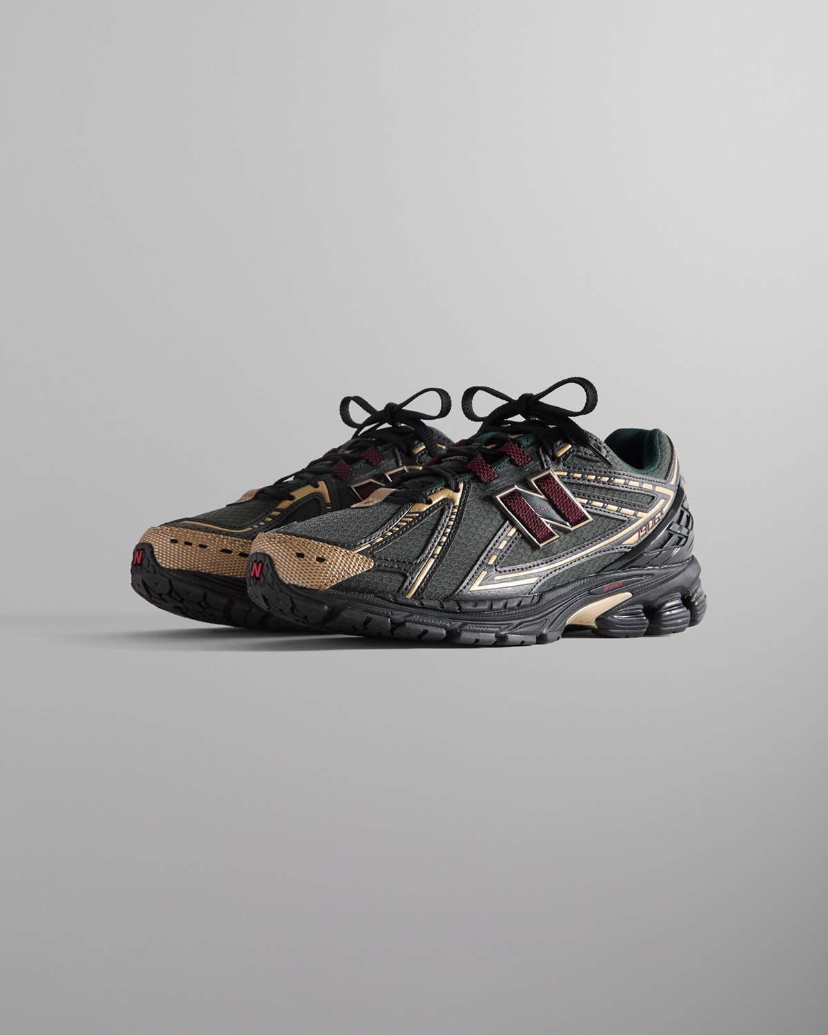 メッシュアッパーにシンセティックレザーのオーバーレイとメタリックのトゥーキャップが特徴。共同ブランディングの要素が随所に取り入れられ、タンとソックライナーにはKITHのロゴを、側面とヒールにはNew Balanceのブランディングを施している。