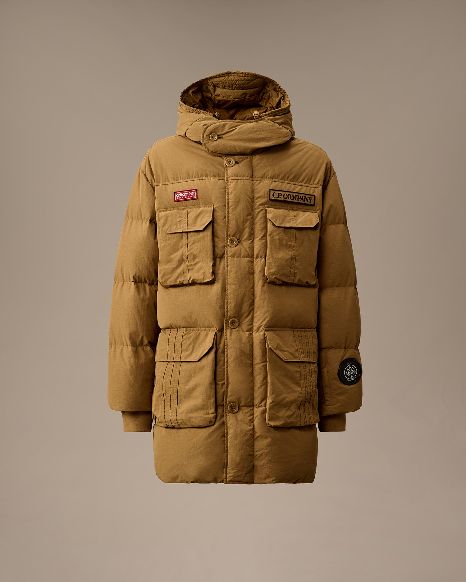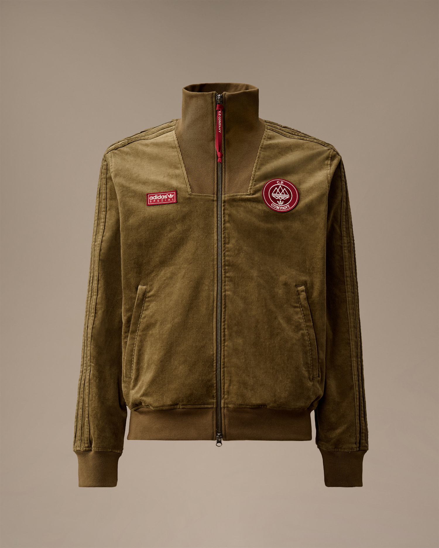 アパレルでは、C.P. COMPANY独自の技術やデザインを採用したアウターウェアとして、フラットナイロンロングダウンジャケットやフライングジャケットなどが登場。フラットナイロンロングダウンジャケットは、表面が不透明で裏側に軽いレジン加工が施されたナイロン素材を使用し、フロントポケット、胸に刺繍されたロゴパッチ、そして本コラボに向けて特別にデザインされたアイコニックなC.P. COMPANYレンズが特徴。フライングジャケットはクラシックなフライトスタイルから着想を得たデザインで、フェイクファーで裏打ちされた襟が特徴的。また、2014年のadidas SPZLデビュー時のMod Trefoilデザインをアップデートしたハーフジップニット、コーデュロイトラックトップやアクセサリーなどが展開。