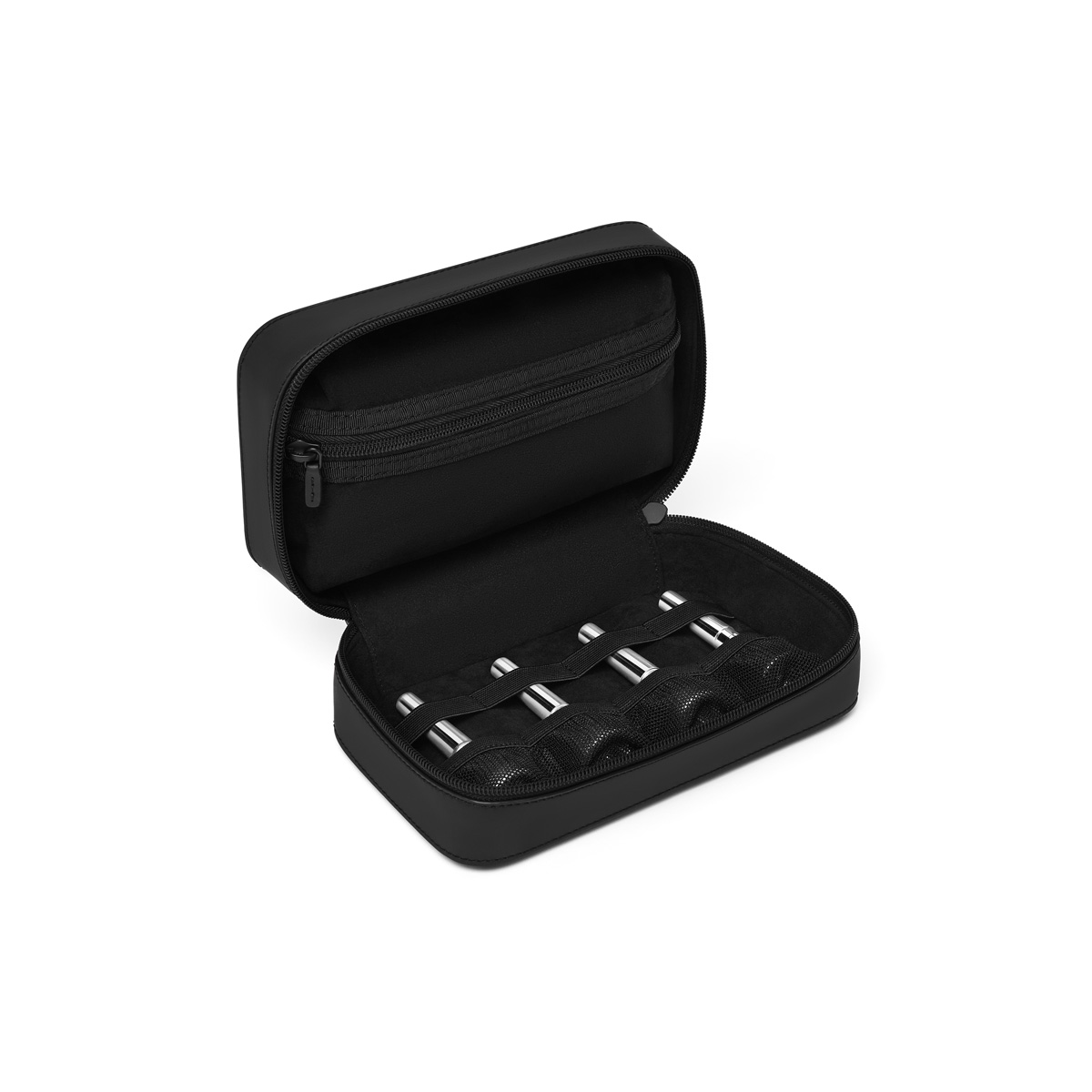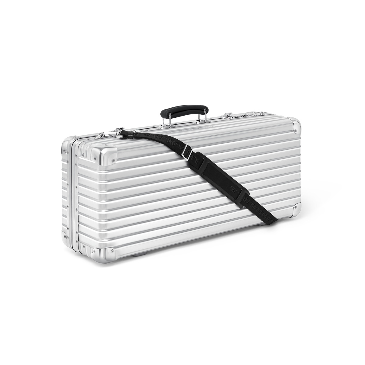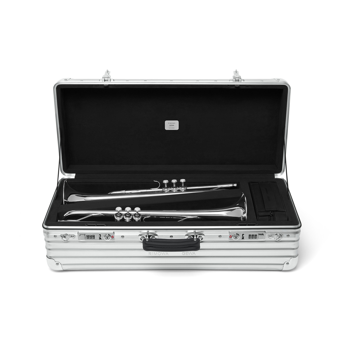 RIMOWAの「クラシック」コレクションに着想を得た光沢のあるコーナーデザイン、レザーハンドル、クロスボディストラップが特徴。外装にはRIMOWAのグルーヴ入りアルミニウム素材を使用し、内部は精密に設計されたマイクロファイバー素材の台座でトランペットを安全に固定。2本のトランペットを収納でき、取り外し可能なクッションシステムにより、ピストントランペットとロータリートランペットの両方に対応。さらに、最大4つのマウスピースや小物を収納できるレザーポーチと、楽器を保護するダストバッグ2つが付属。