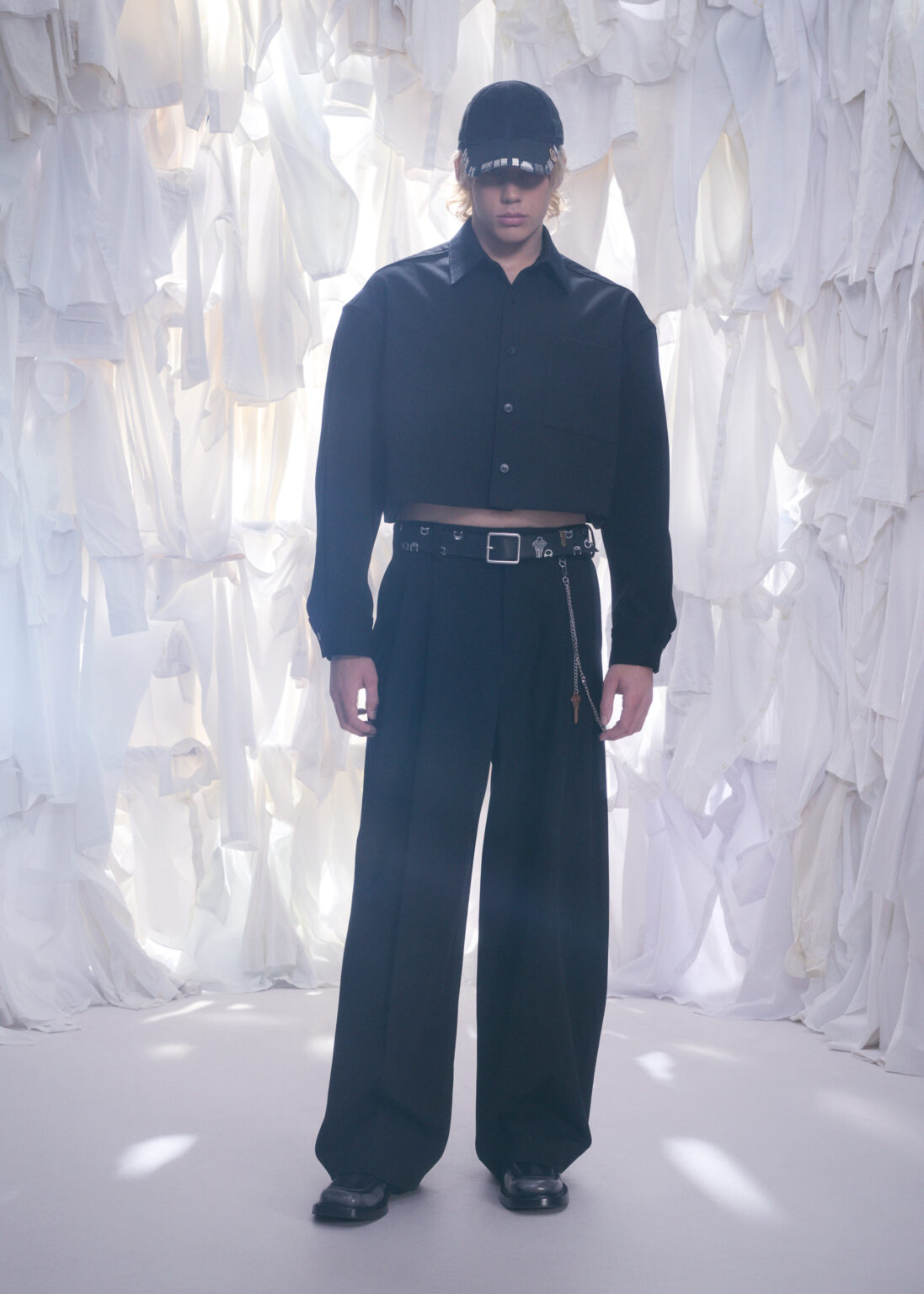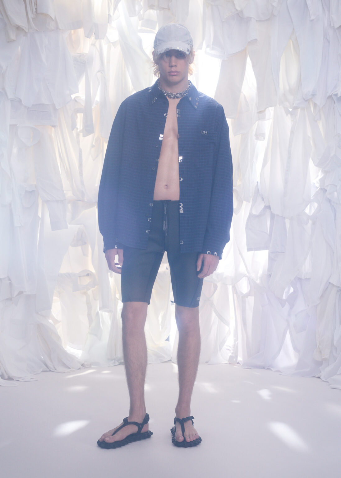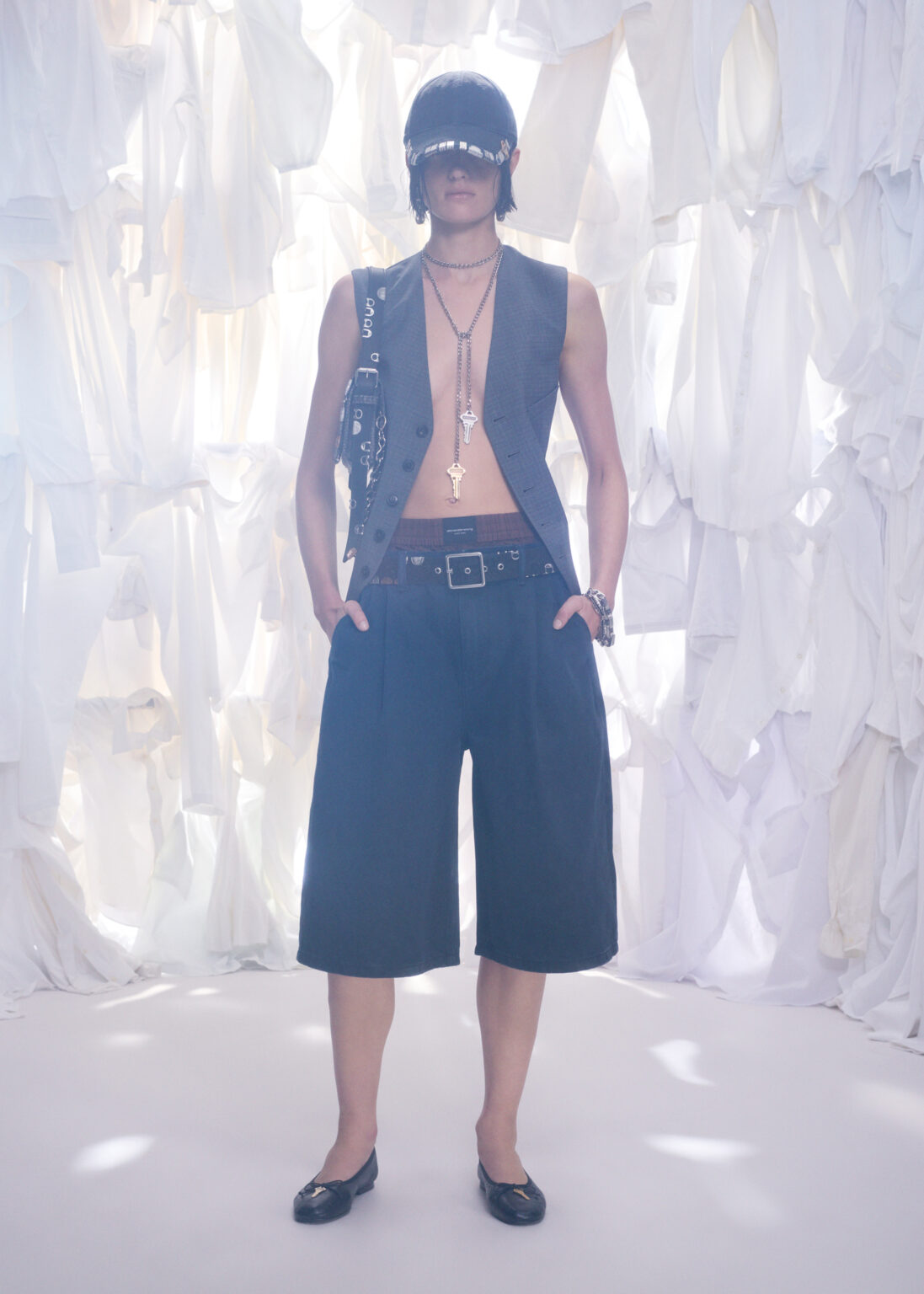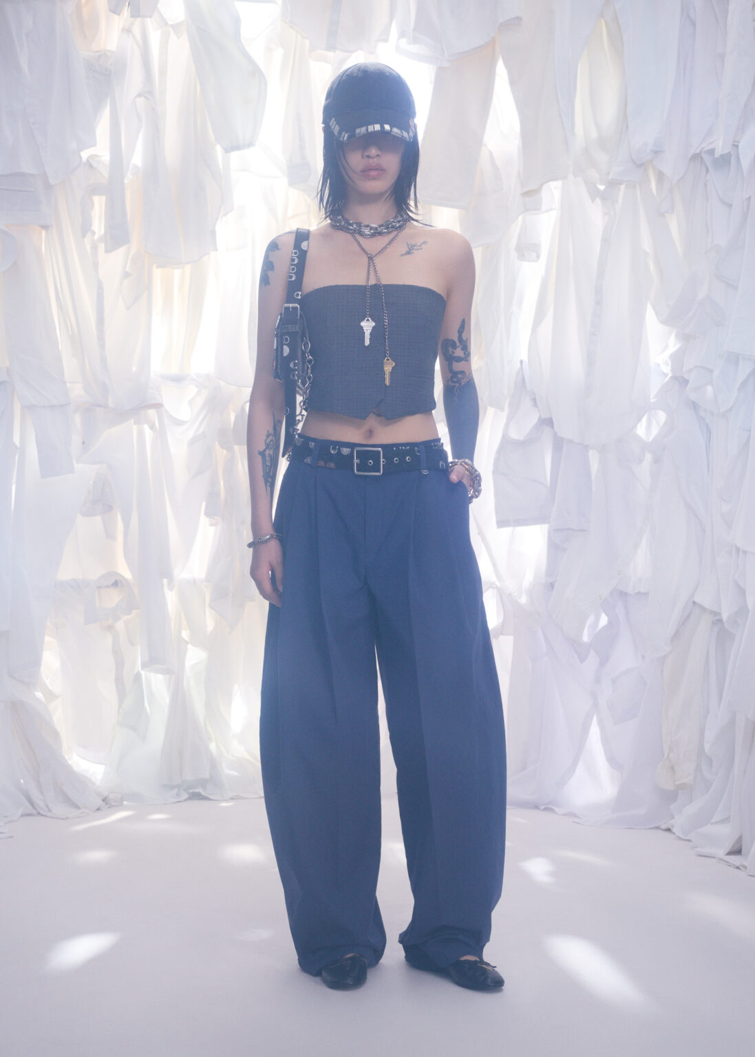 古風なワークウェアは、輝く装飾と対比し、緊張感に満ちた壮大さを生み出している。パティナの抱擁がムードを定義する一方、透明感のあるディテールがステージを演出。燃え立つようなレッドは、ヘイジーグレーや漆黒を撹乱。レイヤードされたジャージーのセパレーツは、煙をかき消すようなパターンでエレガントなインパクトを暗示。乱気流のような雲は、復活の旅を描写するようにクリスタルホットフィックスにインパクトを与える。 シグネチャーのハードウェアによって際立たされる、ペブル加工されたラムスキンで作られたエレファントレザーは、変形する幾何学的なユーティリティで伝統的なハンドバッグのシルエットに挑戦。 3Dラバースパイクと高周波スタッズのサンダルが、ショーガールの精神を象徴し、逆境を乗り越える輝かしい魅力を表現。