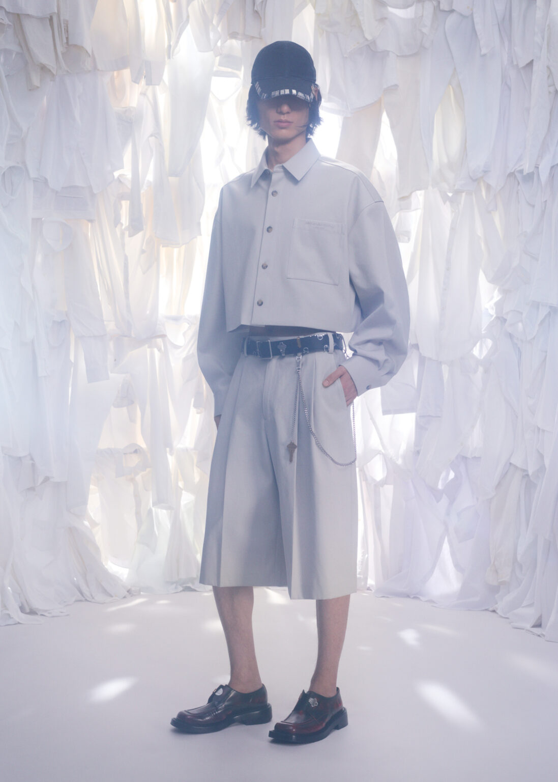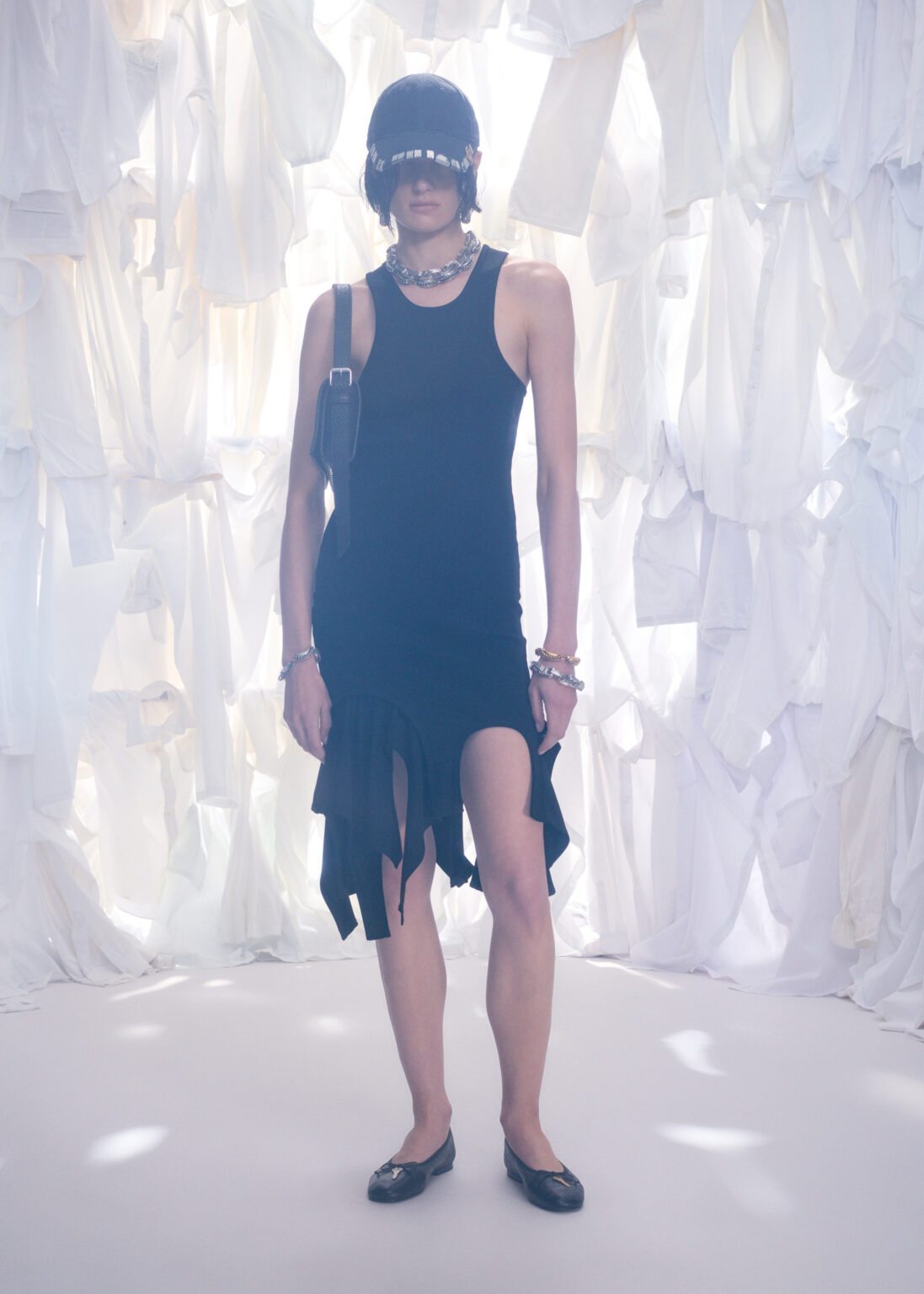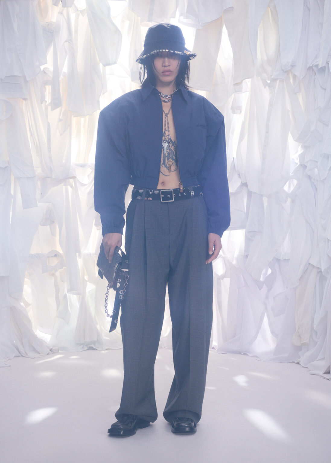 古風なワークウェアは、輝く装飾と対比し、緊張感に満ちた壮大さを生み出している。パティナの抱擁がムードを定義する一方、透明感のあるディテールがステージを演出。燃え立つようなレッドは、ヘイジーグレーや漆黒を撹乱。レイヤードされたジャージーのセパレーツは、煙をかき消すようなパターンでエレガントなインパクトを暗示。乱気流のような雲は、復活の旅を描写するようにクリスタルホットフィックスにインパクトを与える。 シグネチャーのハードウェアによって際立たされる、ペブル加工されたラムスキンで作られたエレファントレザーは、変形する幾何学的なユーティリティで伝統的なハンドバッグのシルエットに挑戦。 3Dラバースパイクと高周波スタッズのサンダルが、ショーガールの精神を象徴し、逆境を乗り越える輝かしい魅力を表現。