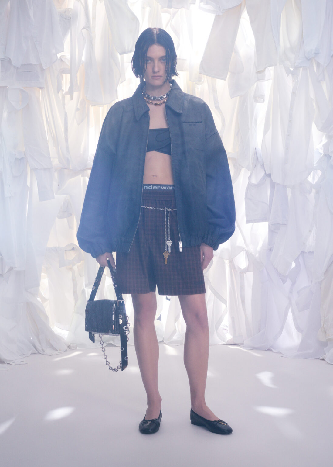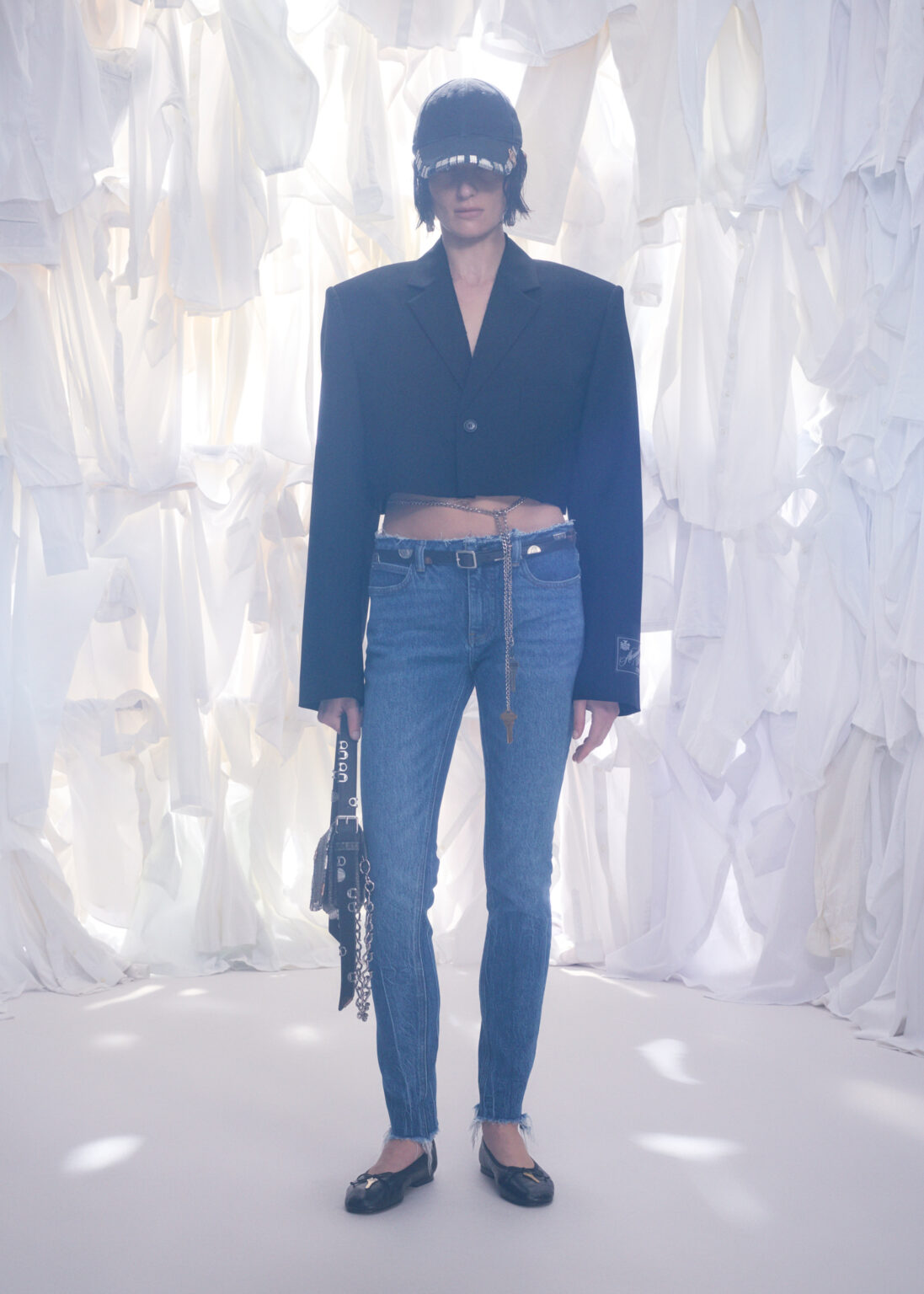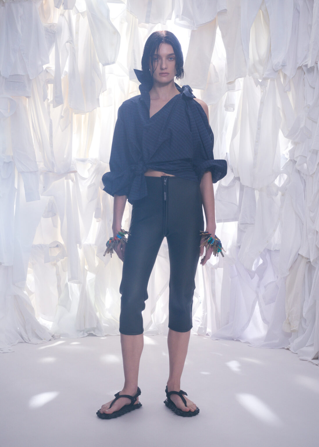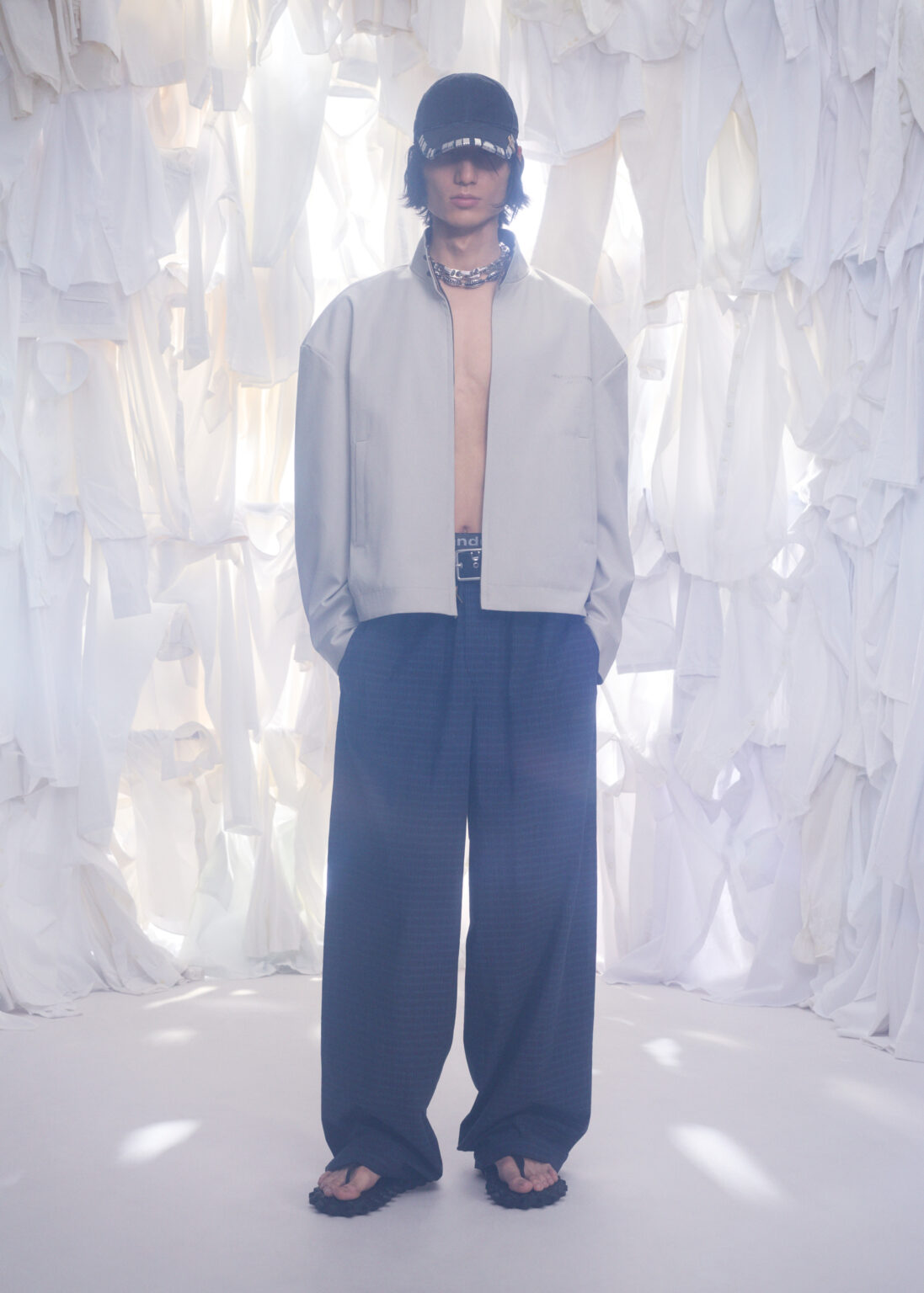 古風なワークウェアは、輝く装飾と対比し、緊張感に満ちた壮大さを生み出している。パティナの抱擁がムードを定義する一方、透明感のあるディテールがステージを演出。燃え立つようなレッドは、ヘイジーグレーや漆黒を撹乱。レイヤードされたジャージーのセパレーツは、煙をかき消すようなパターンでエレガントなインパクトを暗示。乱気流のような雲は、復活の旅を描写するようにクリスタルホットフィックスにインパクトを与える。 シグネチャーのハードウェアによって際立たされる、ペブル加工されたラムスキンで作られたエレファントレザーは、変形する幾何学的なユーティリティで伝統的なハンドバッグのシルエットに挑戦。 3Dラバースパイクと高周波スタッズのサンダルが、ショーガールの精神を象徴し、逆境を乗り越える輝かしい魅力を表現。