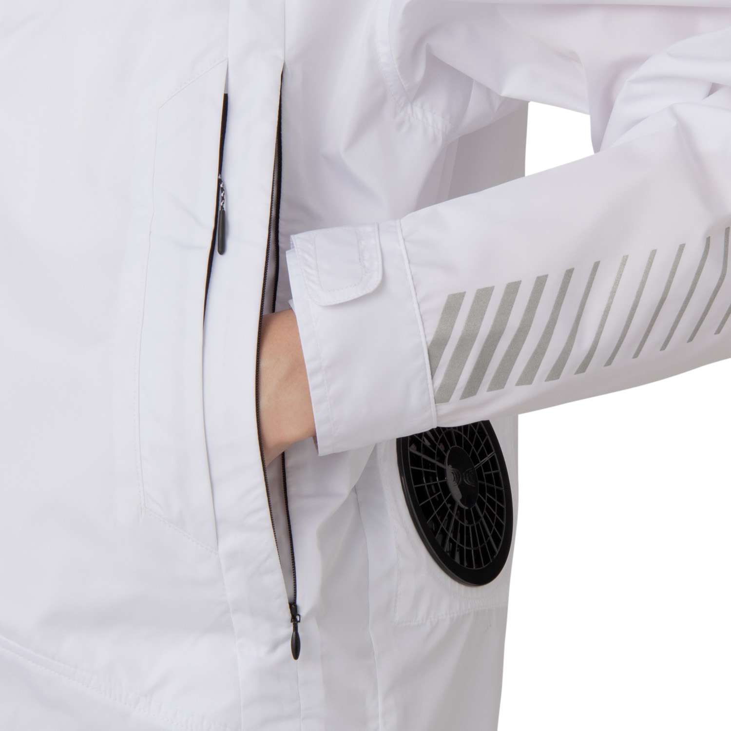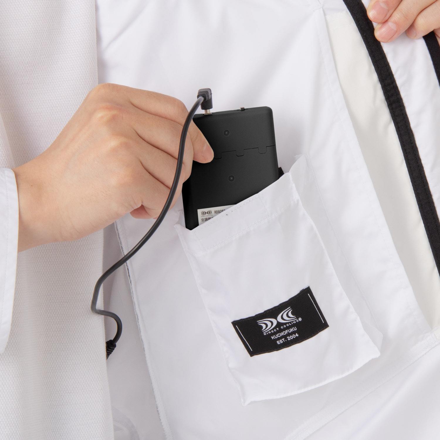 ウェアは、空調服メーカーのセフト研究所とともに新たに開発。腰部に2基の小型ファンを搭載し、外気を衣服内に取り込んで首元や袖口から排出。空気流通経路を作り出し、汗を気化するとともに湿った温かい空気を効率よく逃す仕組みを設計した。風量は強・弱の2通りで調節可能。乾電池式ボックスで作動する。